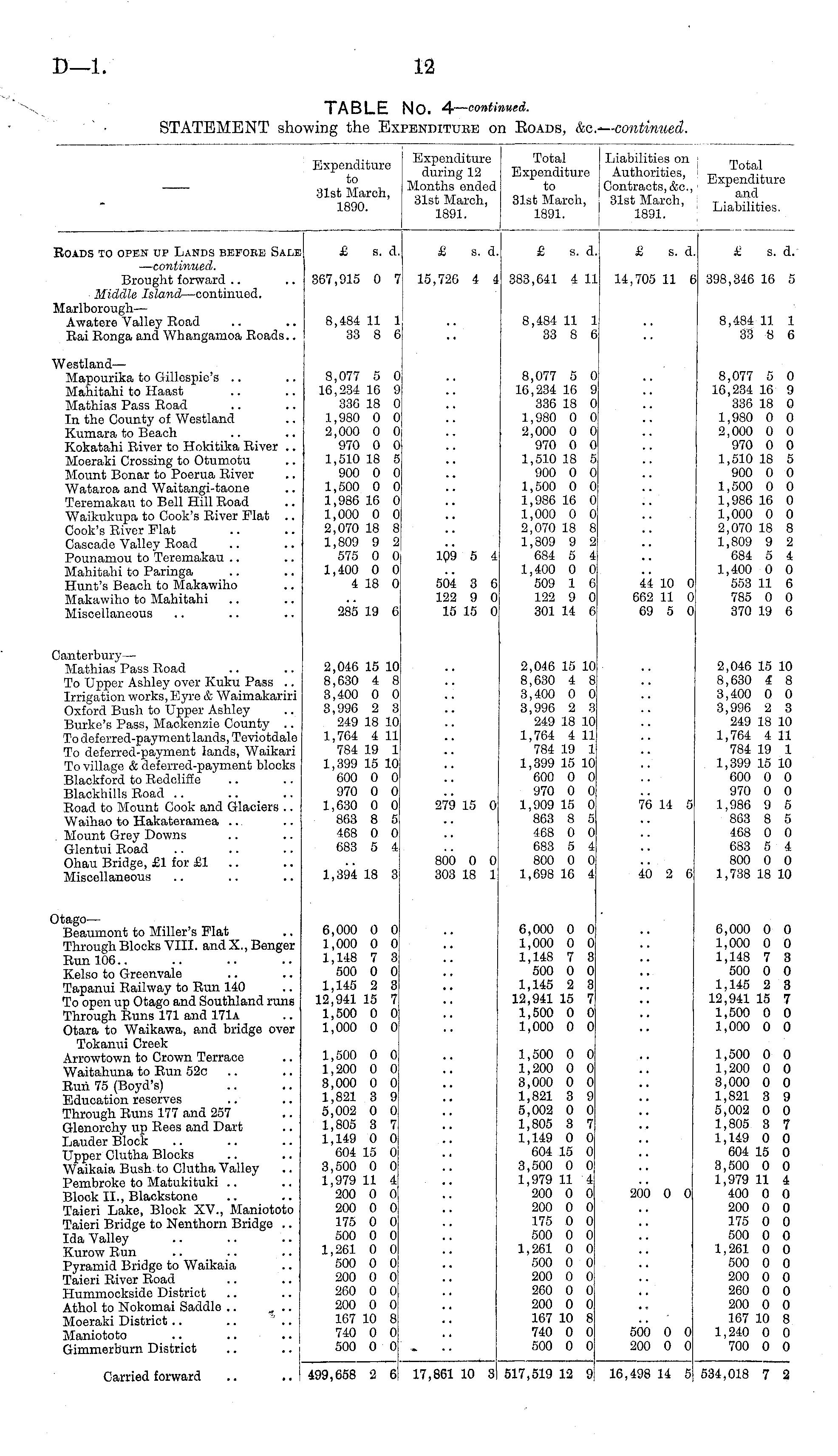 Expenditure to 31st March, 1890. Expenditure during 12 Months ended 31st March, 1891. Total Expenditure to 31st March, 1891. Liabilities on Authorities, Contracts, &c, 31st March, 1891. Total Expenditure and Liabilities. EOADS TO OPEN UP LANDS BEFORE SALE — continued. Brought forward Middle Island —continued. Marlborough— Awatere Valley Road Rai Ronga and Whangamoa Roads.. £ s. d. £ s. d. £ a. d. £ s. d. a s. d. 367,915 0 7 15,726 4 4 383,641 4 11 14,705 11 6 398,346 16 5 8,484 11 1 33 8 6 8,484 11 1 33 8 6 8,484 11 1 33 8 6 Westland — Mapourika to Gillespie's .. Mahitahi to Haast Mathias Pass Road In the County of Westland Kumara to Beach Kokatahi River to Hokitika River .. Moeraki Crossing to Otumotu Mount Bonar to Poerua River Wataroa and Waitangi-taone Teremakau to Bell Hill Road Waikukupa to Cook's River Flat .. Cook's River Flat Cascade Valley Road Pounamou to Teremakau Mahitahi to Paringa Hunt's Beach to Makawiho Makawiho to Mahitahi Miscellaneous 8,077 5 0; 16,234 16 9 336 18 0! 1,980 0 0' 2,000 0 0, 970 0 0 1,510 18 5 900 0 0 1,500 0 0 1,986 16 0 1,000 0 0 2,070 18 8 1,809 9 2 575 0 0: 1,400 0 0| 4 18 0 8,077 5 0 16,234 16 9 336 18 0 1,980 0 0 2,000 0 0 970 0 0 1,510 18 5 900 0 0 1,500 0 0 1,986 16 0 1,000 0 0 2,070 18 8 1,809 9 2 684 5 4 1,400 0 0 509 1 6 122 9 0 301 14 6 8,077 5 0 16,234 16 9 336 18 0 1,980 0 0 2,000 0 0 970 0 0 1,510 18 5 900 0 0 1,500 0 0 1,986 16 0 1,000 0 0 2,070 18 8 1,809 9 2 684 5 4 1,400 0 0 553 11 6 785 0 0 370 19 6 109 5 4 285 19 6 504 3 6 122 9 0 15 15 0 44 10 0 662 11 0 69 5 0 Canterbury— Mathias Pass Road To Upper Ashley over Kuku Pass .. Irrigation works, Byre & Waimakariri Oxford Bush to Upper Ashley Burke's Pass, Mackenzie County .. To deferred-payment lands, Teviotdale To deferred-payment lands, Waikari To village & deferred-payment blocks Blackford to Redcliffe Blackhills Road Road to Mount Cook and Glaciers .. Waihao to Hakateramea Mount Grey Downs Glentui Road Ohau Bridge, £1 for £1 Miscellaneous 2,046 15 10 8,630 4 8 3,400 0 0 3,996 2 3 249 18 10 1,764 4 11 784 19 1 1,399 15 10 600 0 0 970 0 0 1,630 0 0 863 8 5: 468 0 0 683 5 4! 2,046 15 10 8,630 4 8 3,400 0 0 3,996 2 3 249 18 10 1,764 4 11 784 19 1 1,399 15 10 600 0 0 970 0 0 1,909 15 0 863 8 5 468 0 0 683 5 4 800 0 0 1,698 16 4 2,046 15 10 8,630 4 8 3,400 0 0 3,996 2 3 249 18 10 1,764 4 11 784 19 1 1,399 15 10 600 0 0 970 0 0 1,986 9 5 863 8 5 468 0 0 683 5 4 800 0 0 1,738 18 10 279 15 0 76 14 5 1,394 18 8 800 0 0 303 18 1 40 2 6 Otago— Beaumont to Miller's Flat Through Blocks VIII. and X., Benger Run 106.. Kelso to Greenvale Tapanui Railway to Run 140 To open up Otago and Southland runs Through Runs 171 and 171a Otara to Waikawa, and bridge over Tokanui Creek Arrowtown to Crown Terrace Waitahuna to Run 52c Run 75 (Boyd's) Education reserves Through Runs 177 and 257 Glenorchy up Ress and Dart Lauder Block Upper Clutha Blocks Waikaia Bush to Clutha Valley Pembroke to Matukituki Block II., Blackstone Taieri Lake, Block XV., Maniototo Taieri Bridge to Nenthom Bridge .. Ida Valley Kurow Run Pyramid Bridge to Waikaia Taieri River Road Hummockside District Athol to Nokomai Saddle .. „ .. Moeraki District .. .. Maniototo Gimmerburn District 6,000 0 0 1,000 0 0 1,148 7 3 500 0 0 1,145 2 3 12,941 15 7 1,500 0 0 1,000 0 0! 1,500 0 0 1,200 0 0; 8,000 0 0; 1,821 3 9 5,002 0 0 1,805 3 7 1,149 0 0 604 15 0 3,500 0 0 1,979 11 4 200 0 0 200 0 0 175 0 0 500 0 0 1,261 0 0 500 0 0 200 0 0 260 0 0 200 0 0 167 10 8 740 0 0 500 0 0 6,000 0 0 1,000 0 0 1,148 7 3 500 0 0 1,145 2 3 12,941 15 7 1,500 0 0 1,000 0 0 1,500 0 0 1,200 0 0 3,000 0 0 1,821 3 9 5,002 0 0 1,805 3 7 1,149 0 0 604 15 0 3,500 0 0 1,979 11 4 200 0 0 200 0 0 175 0 0 500 0 0 1,261 0 0 500 0 0 200 0 0 260 0 0 200 0 0 167 10 8 740 0 0 500 0 0 6,000 0 0 1,000 0 0 1,148 7 3 500 0 0 1,145 2 3 12,941 15 7 1,500 0 0 1,000 0 0 1,500 0 0 1,200 0 0 3,000 0 0 1,821 3 9 5,002 0 0 1,805 3 7 1,149 0 0 604 15 0 3,500 0 0 1,979 11 4 400 0 0 200 0 0 175 0 0 500 0 0 1,261 0 0 500 0 0 200 0 0 260 0 0 200 0 0 167 10 8 1,240 0 0 700 0 0 200 0 0 500 0 0 200 0 0 Carried forward .. .. ! 499,658 2 6, 17,861 10 3 517,519 12 9 16,498 14 5 534,018 7 2