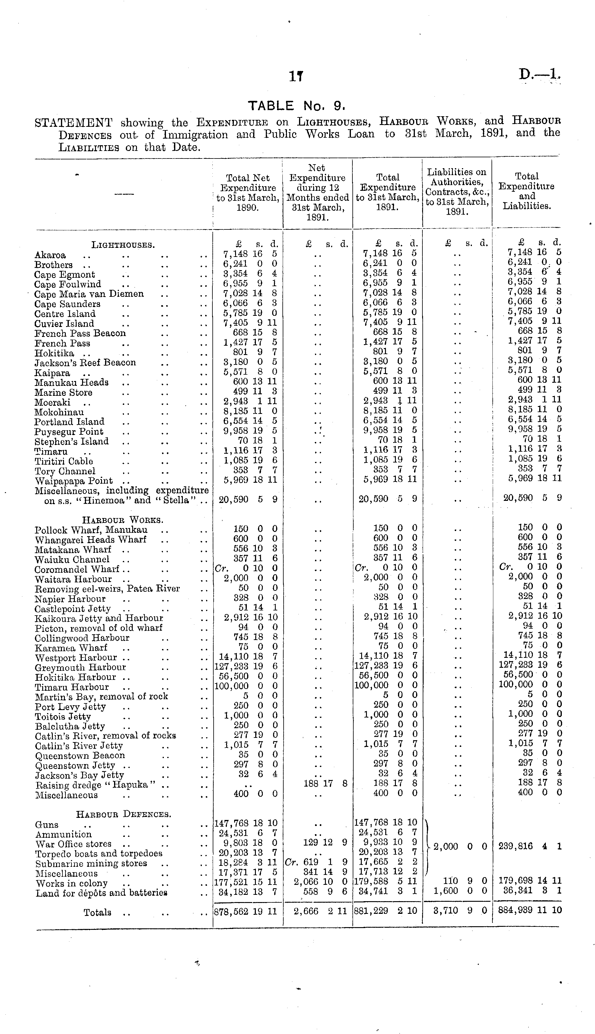 TABLE No. 9. STATEMENT showing the Expenditure on Lighthouses, Harbour Works, and Harbour Defences out of Immigration and Public Works Loan to 31st March, 1891, and the Liabilities on that Date.