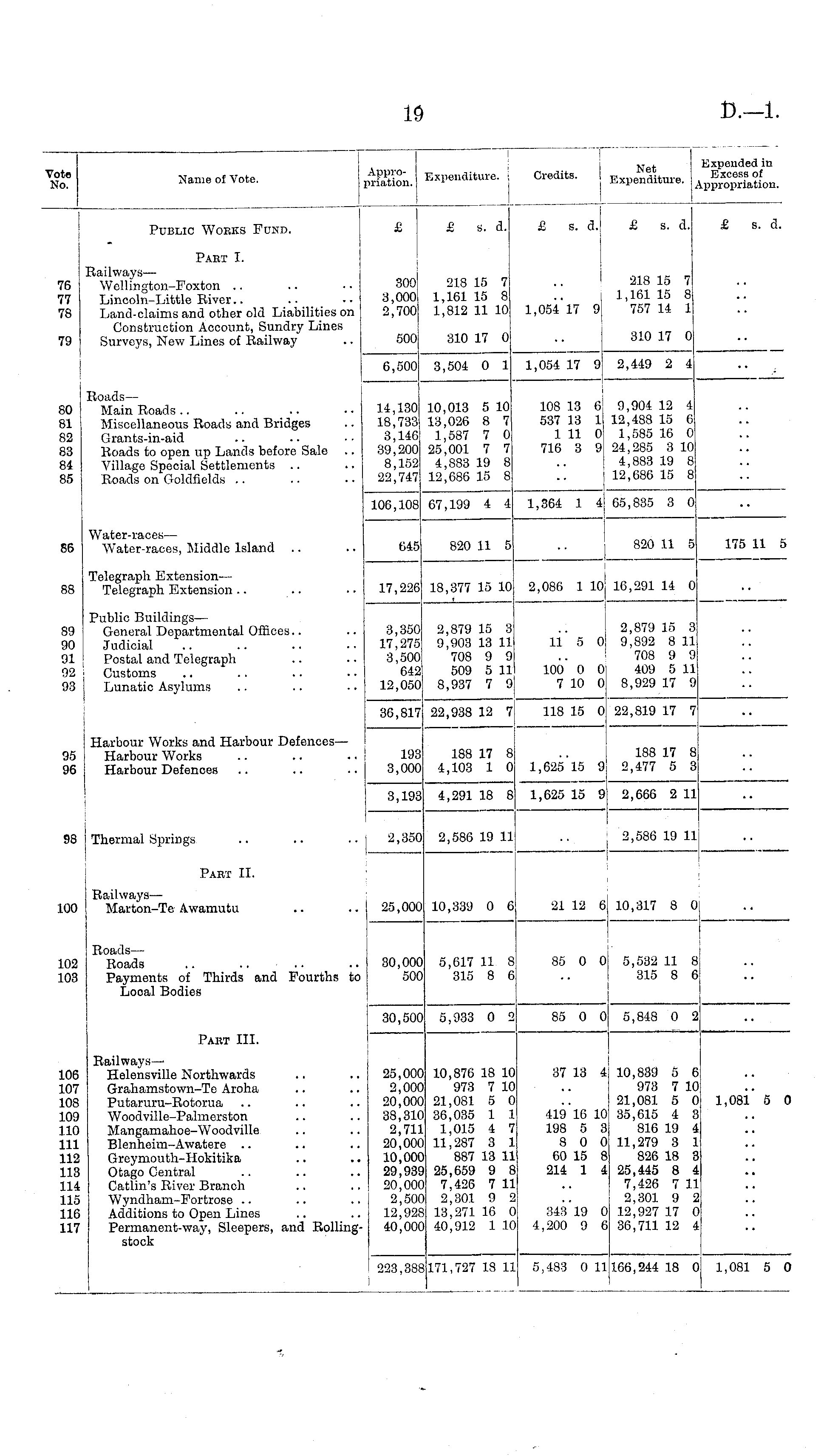 Vote No. Name of Vote. Appropriation. Expenditure. Credits. ~ . Expended in Expenditure. Ap^ffi£ on . I Public Wobks Fund. £ £ 8. d. £ s. d. £ s. d. £ s. d. Paet I. 218 15 7 1,161 15 8 1,812 11 10 218 15 7 1,161 15 8 757 14 1 76 77 78 Railways— Wellington-Foxton Lincoln-Little River.. Land-claims and other old Liabilities on Construction Account, Sundry Lines Surveys, New Lines of Railway 300! 3,000j 2,700! 1,054 17 9 79 500 310 17 0 310 17 0 6,500 3,504 0 1 1,054 17 9 2,449 2 4 80 81 82 8!! 84 85 RoadsMain Roads Miscellaneous Roads and Bridges Grants-in-aid Roads to open up Lands before Sale Village Special Settlements Roads on Goldfields 14,130 18,733 3,146 39,200 8,152 22,747 10,013 5 10 13,026 8 7 1,587 7 0 25,001 7 7 4,883 19 8 12,686 15 8 108 13 6; 537 13 1 1 11 0 716 3 9| 9,904 12 4 12,488 15 6 1,585 16 0 24,285 3 10 4,883 19 8 12,686 15 8 106,108 67,199 4 4 1,364 1 4| 65,835 3 0 Water-races — Water-races, Middle Island 86 645 820 11 5 820 11 175 11 5 88 Telegraph Extension— Telegraph Extension 17,226 18,377 15 10 ' 2,086 1 10; 16,291 14 0 89 90 91 92 93 Public Buildings— General Departmental Offices.. Judicial Postal and Telegraph Customs Lunatic Asylums 3,350 17,275 3,500 642 12,050 2,879 15 3 9,903 13 11 708 9 9 509 5 11 8,937 7 9 11 5 0 io6 o o 7 10 0 2,879 15 3 9,892 8 11 708 9 9 409 5 11 8,929 17 9 36,817 22,938 12 7 118 15 0 22,819 17 7 95 96 Harbour Works and Harbour Defences — Harbour Works Harbour Defences i 193 3,000 188 17 8 4,103 1 0 1,625 15 9 188 17 8 2,477 5 3 3,193 4,291 18 8 1,625 15 9 2,666 2 11 ! Thermal Springs 98 2,350 2,586 19 11 2,586 19 Hi Part II. 100 Railways— Marton-Te Awamutu 25,000 10,339 0 6 21 12 6 10,317 8 0 102 103 Roads — Roads Payments of Thirds and Fourths to Looal Bodies 30,000 500 5,617 11 8 315 8 6 85 0 0 5,532 11 8 315 8 6 Part III. 30,500 5,933 0 2 85 0 0 5,848 0 2 106 107 108 109 110 111 112 113 114 115 116 117 Railways—> Helensville Northwards Grahamstown-Te Aroha Putaruru-Rotorua Woodville-Palmerston Mangamahoe-Woodville Blenheim-Awatere .. Greymouth-Hokitika Otago Central Catlin's River Branch Wyndham-Fortrose Additions to Open Lines Permanent-way, Sleepers, and Rollingstock 25,000 2,000 20,000 38,310 2,711 20,000 10,000 29,939 20,000 2,500 12,928 40,000 10,876 18 10 973 7 10 21,081 5 0 36,035 1 1 1,015 4 7 11,287 3 1 887 13 11 25,659 9 8 7,426 7 11 2,301 9 2 13,271 16 0 40,912 1 10 37 13 4 419 16 10 198 5 3 8 0 0 60 15 8 214 1 4 10,839 5 6 973 7 10 21,081 5 0 35,615 4 3 816 19 4 11,279 3 1 826 18 3 25,445 8 i\ 7,426 7 11' 2,301 9 2 12,927 17 0 36,711 12 4 1,081 5 0 343"19 0 4,200 9 6 223,388 171,727 18 11 5,183 0 11 1166,244 18 0 1,081 5 0