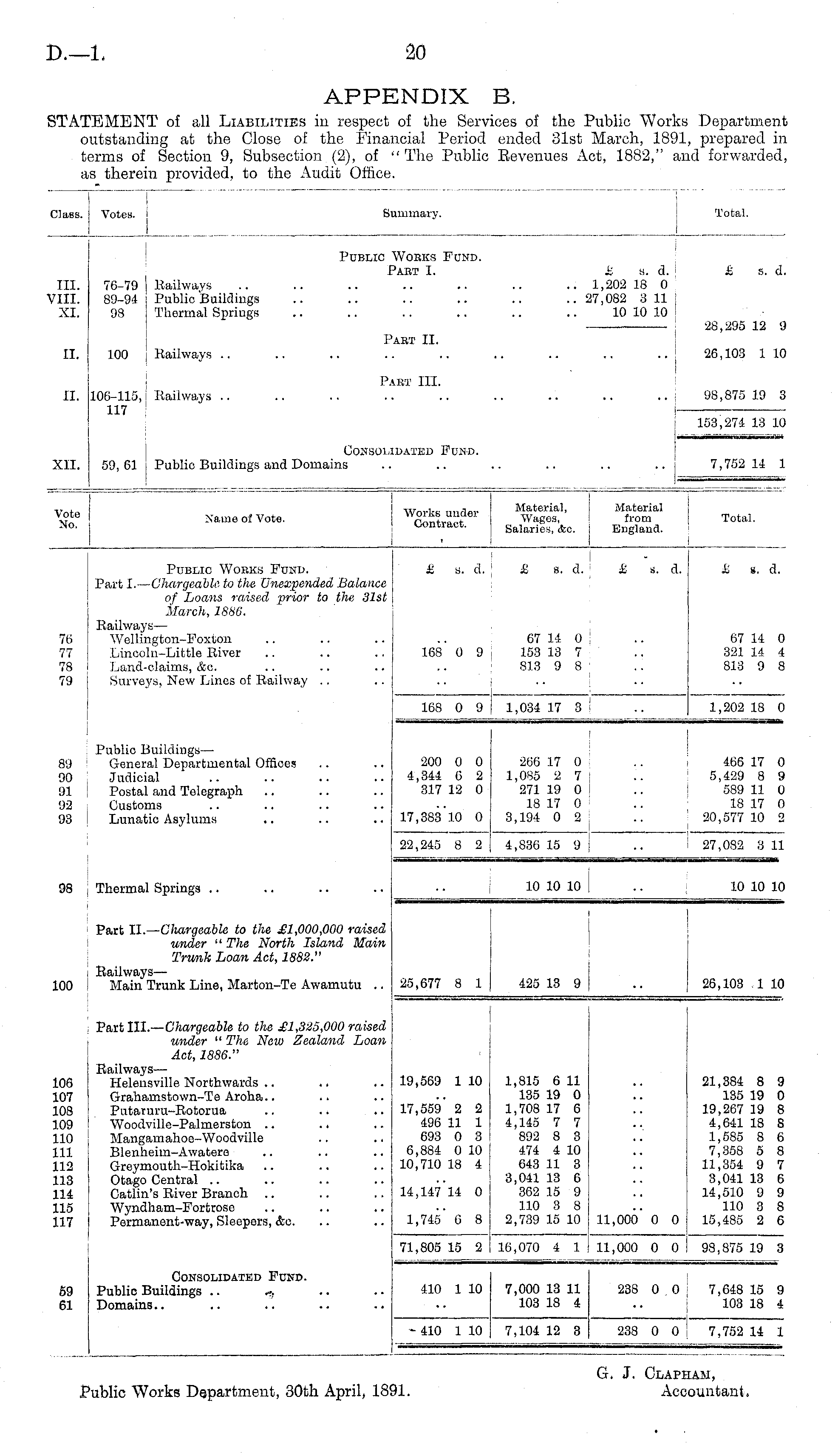 G. J. Clapham, Public Works Department, 30th April, 1891. Accountant,