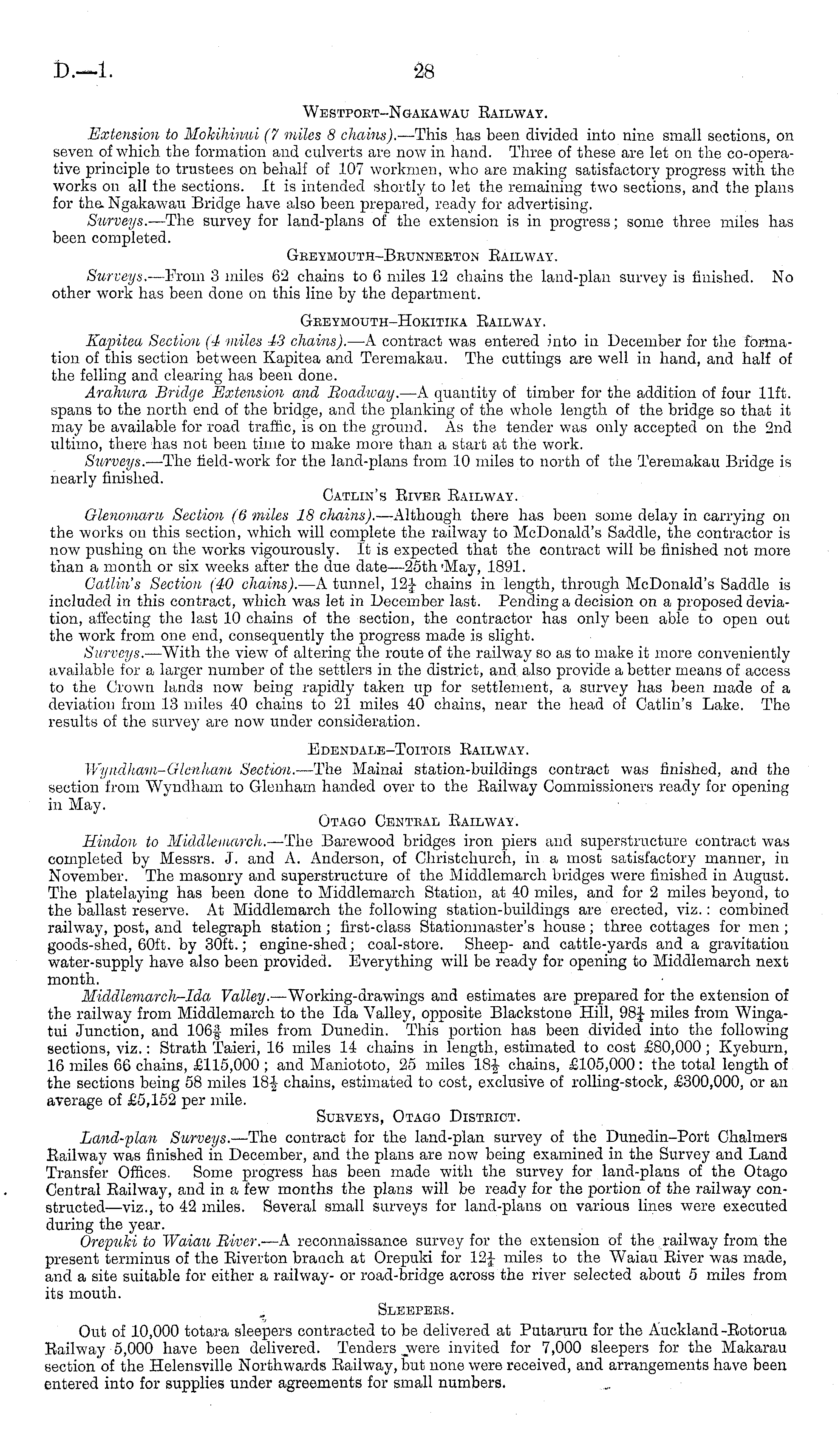 Westpokt-Ngakawau Eailway. Extension to Mohihinui (7 miles 8 chains). —This has been divided into nine small sections, on seven of which the formation and culverts are now in hand. Three of these are let on the co-opera-tive principle to trustees on behalf of 107 workmen, who are making satisfactory progress with the works on all the sections. It is intended shortly to let the remaining two sections, and the plans for tha Ngakawau Bridge have also been prepared, ready for advertising. Surveys. —The survey for land-plans of the extension is in progress; some three miles has been completed. Geeymouth-Bbunnebton Eailway. Surveys. —From 3 miles 62 chains to 6 miles 12 chains the laud-plan survey is finished. No other work has been done on this line by the department. Gbeymouth-Hokitika Eailway. Kapitea Section (4 miles 13 chains). —x\ contract was entered into in December for the formation of this section between Kapitea and Teremakau. The cuttings are well in hand, and half of the felling and clearing has been done. Arahura Bridge Extension and Boadway. —A quantity of timber for the addition of four lift, spans to the north end of the bridge, and the planking of the whole length of the bridge so that it may be available for road traffic, is on the ground. As the tender was only accepted on the 2nd ultimo, there has not been time to make more than a start at the work. Surveys. —The field-work for the land-plans from 10 miles to north of the Teremakau Bridge is nearly finished. Catlin's Eiver Eailway. Glenomaru Section (6 miles 18 chains). —Although there has been some delay in carrying on the works on this section, which will complete the railway to McDonald's Saddle, the contractor is now pushing on the works vigourously. It is expected that the contract will be finished not more than a month or six weeks after the due date—2sth'May, 1891. Catlin's Section (40 chains). —A tunnel, 12J chains in length, through McDonald's Saddle is included in this contract, which was let in December last. Pending a decision on a proposed deviation, affecting the last 10 chains of the section, the contractor has only been able to open out the work from one end, consequently the progress made is slight. Surveys. —With the view of altering the route of the railway so as to make it more conveniently available for a larger number of the settlers in the district, and also provide a better means of access to the Crown lands now being rapidly taken up for settlement, a survey has been made of a deviation from 13 miles 40 chains to 21 miles 40 chains, near the head of Catlin's Lake. The results of the survey are now under consideration. Edendale-'Toitois Eailway. V/yndham-Gleuham Section. —The Mainai station-buildings contract was finished, and the section from Wyndham to Glenham handed over to the Eailway Commissioners ready for opening in May. Otago Gentkal Eailway. Hindon to Middle-march. —The Barewood bridges iron piers and superstructure contract was completed by Messrs. J. and A. Anderson, of Christchurch, in a most satisfactory manner, in November. The masonry and superstructure of the Middlemarcli bridges were finished in August. The platelaying has been done to Middlemarcli Station, at 40 miles, and for 2 miles beyond, to the ballast reserve. At Middlemarcli the following station-buildings are erected, viz.: combined railway, post, and telegraph station; first-class Stationmaster's house; three cottages for men ; goods-shed, 60ft. by 30ft.; engine-shed; coal-store. Sheep- and cattle-yards and a gravitation water-supply have also been provided. Everything will be ready for opening to Middlemarch next month. Middlemarcli-Ida Valley. —Working-drawings and estimates are prepared for the extension of the railway from Middlemarcli to the Ida Valley, opposite Blackstone Hill, 98} miles from Wingatui Junction, and 106|- miles from Dunedin. This portion has been divided into the following sections, viz.: Strath Taieri, 16 miles 14 chains in length, estimated to cost £80,000; Kyeburn, 16 miles 66 chains, £115,000 ; and Maniototo, 25 miles 18| chains, £105,000: the total length of the sections being 58 miles 18-J chains, estimated to cost, exclusive of rolling-stock, £300,000, or an average of £5,152 per mile. Surveys, Otago District. Land-plan Surveys.— -The contract for the land-plan survey of the Duuedin-Port Chalmers Eailway was finished in December, and the plans are now being examined in the Survey and Land Transfer Offices. Some progress has been made with the survey for land-plans of the Otago Central Eailway, and in a few months the plans will be ready for the portion of the railway constructed—viz., to 42 miles. Several small surveys for land-plans on various lines were executed during the year. Orepuhi to Waiau Biver.—A reconnaissance survey for the extension of the railway from the present terminus of the Eiverton braach at Orepuki for 12J miles to the Waiau Eiver was made, and a site suitable for either a railway- or road-bridge across the river selected about 5 miles from its mouth. SXjEEPEES. Out of 10,000 totara sleepers contracted to be delivered at Putaruru for the Auckland -Eotorua Eailway 5,000 have been delivered. Tenders were invited for 7,000 sleepers for the Makarau section of the Helensville Northwards Eailway, but none were received, and arrangements have been entered into for supplies under agreements for small numbers.