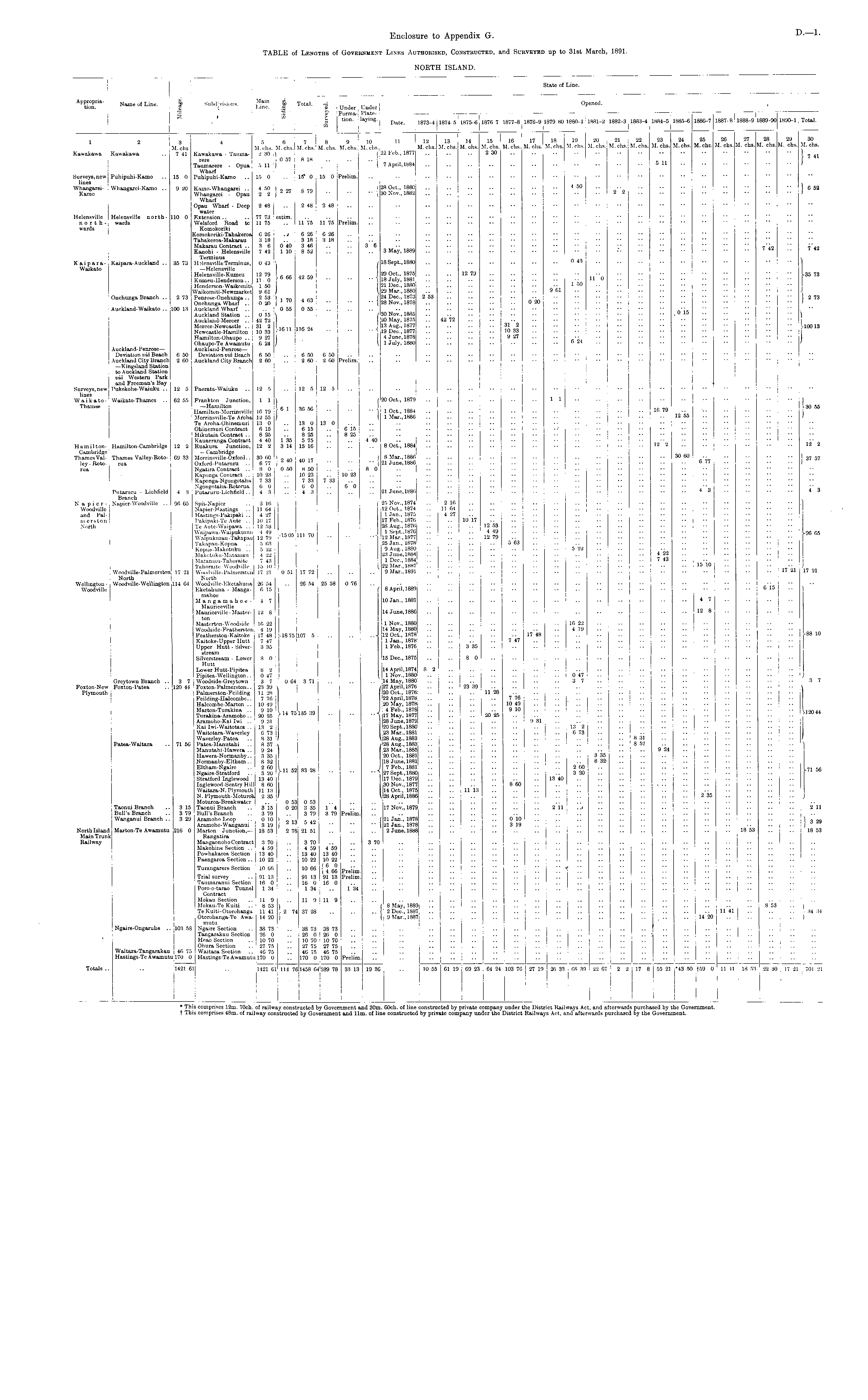 Enclosure to Appendix G. TABLE of Lengths of Government Lines Authorised, Constructed, and Surveyed up to 31st March, 1891. NOETH ISLAND. ! I _. . State of Line. — Appropriation. Name of Line. | Subdivisions. I J' am §> Total. -d TT , TT , Opened. g Line. ,0 S Under | Under Ej 3 p Forma- Plate- ( : ( : : — ' s tion - lajing - Date. 1873-4 1874-5 L875-6 1876-711877-8 1878-9 'l879-80 1880-1 j 1881-2 ■ 1882-3 1883-4 1884-5 1885-6 1886-7 j |™ I I I i . 1 i 3 4 5 6 7 8 9 10 '' 11 12 13 14 15 16 17 18 19 20 21 22 23 24 25 M.chs M.chs. M.chs. M. chs. M. chs. M.chs. M.chs.! M. chs. M. chs. M. chs. M. chs. M. chs. M. chs. M. chs. M. chs. M. chs. M. chs. M.chs. M. chs. M.chs. M. chs. 7 41 Kawakawa - Tauma- 2 30 ) (22Feb.,1877 2 30 rere 0 5! 8 18 \ Taumarere - Opua 5 11 |J ■ ( 7April,1884 an Wharf 15 0 Puhipuhi-Kamo .. 15 0 .. 15' 0 15 0 Prelim. .. •■ 9 20 Kamo-Whangarei .. 4 50 1 „ „, „ TO I 28 Oct., 1880 450 .. - .. , Whangarei - Opau 2 2 j 2 27 8 79 ( 30 Nov., 1882 2 2 Wharf Opan Wharf - Deep 2 48 .. 2 48 2 48 .. .. ■ ■ water 110 0 Extension .. .. 77 73 estim. .. .. .. .. ■ ■ • • Welsford Road to 11 75 .. 11 75 11 75 Prelim. .. • ■ Komokoriki Komokoriki-Tahakeroa 6 26 . i 6 26 6 26 .. .. . • Tahakeroa-Makarau 3 18 .. 3 18 3 18 Makarau Contract 3 6 0 40 3 46 .. .. 3 6 • • Kanohi - Helensville 7 42 110 8 52 3 May, 1889 • Terminus 35 73 Helensville Terminus, 0 43 *, 1 18 Sept., 1880 0 43 —Helensville Helensville-Kmnou 12 79 { R „„ .„ .„ j 29 Oct., 1875 .. .. 12 79 •• Kumeu-Henderson.. 11,0 f 6 66 42 59 1 18 July, 1881 •• " 0 Henderson-Waikomiti 150 21 Dec, 1880 150 Waikomiti-Newmarket 9 61 ) ( 29 Mar., 1880 9 61 2 73 Ponrose-Onehunga .. 2 53 1 , , n , „ (24 Dec, 1873 2 53 Onehnnga Wharf .. 0 20 ) 1 ™ 4 63 l2SNov.,1878 0 20 100 13 Auckland Wharf .. .. 0 55 0 55 .. ■• Auckland Station .. 0 15 \ / 30 Nov., 1885 .0 15 Auckland-Mercer .. 42 72 20 May, 1875 42 72 Mercer-Newcastle .. 31 2 ,„., 11(! „. ! 13 Aug., 1877 31 2 Newcastle-Hamilton 10 33 1G111162< 1 19 Dec, 1877 10 33 Hamilton-Ohaupo .. 9 27 4 June, 1878 9 27 .. .. •• Ohaupo-Te Awamutu 6 24 ) \ 1 July, 1880 b M Auckland-Penrose— 6 50 Deviation via Beach 6 50 .. 6 50 i 6 50 2 60 Auckland City Branch 2 60 .. 2 60 i 2 60 Prelim. ■7 7 1887-8 : 1888-9 1889-90 1890-1 Total. 1 2 Kawakawa ; Kawakawa 10 1 11 M. chs.! ( 22 Feb., 1877 " { 7 April, 1884 12 M. chs. 13 M. chs. 14 M. chs. 17 M. chs. 23 M. chs. 24 M. chs. 25 M. chs. is. 26 5. M. chs. J 27 28 29 30 M. chs. M. chs. M. chs. M. chs. 7 41 27 M. chs. 5 11 Surveys, new Puhipuhi-Kamo lines Whangarei- Whangarei-Kamo .. Kamo 15 0 9 20 Prelim. I 28 Oct., 1880 -• (30 Nov., 1882 I 6 52 Helensville Helensville north- ] north- wards wards 110 0 Prelim. 3 "6 P. Mai, IRAQ 3 May, 1889 !! '.'. 742 '.'. 742 3 May, 1889 K a i p a r a - Kaipara- Auckland .. Waikato 35 73 /18 Sept., 1880 29 Oct., 1875 ■ • 1 18 July, 1881 18 Sept., 1880 29 Oct., 1875 18 July, 1881 21 Dec, 1880 29 Mar., 1880 24 Dec, 1873 2 53 28 Nov., 1878 30 Nov., 1885 .. 20 May, 1875 .. ii 13 Aug., 1877 19 Dec, 1877 4 June, 1878 1 July, 1880 12 72 12 79 ;; ■; Us 73 Onehunga Branch .. 21 Dec, 1880 I 29 Mar., 1880 ( 24 Dec, 1873 •• {28 Nov., 1878 253 J 1 2 73 J 1 2 73 2 73 4 63 020 Auckland-Waikato .. : 100 13 0 55 o'l5 116 24 / 30 Nov., 1885 20 May, 1875 13 Aug., 1877 ■• 1 19 Dec, 1877 42'72 1 I10013 frw 10 " i ) 1-10013 Auckland-Penrose — Deviation via Beach Auckland City Branch —Kingsland Station to Auckland Station via Western Park and Freeman's Bay Surveys, new Pukekohe-Waiuku .. lines Waikato- Waikato-Thanres .. Thames 6 50 2 60 6 50 6 50 2 60 I 2 60 Prelim. 19 juec, rov t 4 June, 1878 I, 1 July, 1880 .. .... 12 5 Paerata-Waiuku .. 12 5 12 5 12 5 .. .. .. 62 55 Frankton Junction, 1 1 ] 20 Oct., 1879 11 —Hamilton a t oc kg , „ .-i Hamilton-Morrinsville 16 79 f bl ib of) ' 1 Oct., 1884 ' 16 79 .. Morrinsville-Te Aroha 12 55 ) ( 1 Mar., 1886 | | 12 55 To Aroha-Ohinemuri 13 0 13 0 13 0 .. .. .. j j Ohinernuri Contract 6 15 .. 6 15 .. 6 15 Hikutaia Contract 8 25 .. 8 25 .. 8 25 Kauaeranga Contract 4 40 1 35 5 75 .. .. 4 40 .. .. .. •• ■• ■• ■• -• ■• ■■ -■ ■- ■■ 12 2 Ruakura Junction, 12 2 8 14 15 16 8 Oct., 1884 12 2 —Cambridge 69 33 Momnsvillc-Oxford.. 30 00 I „ .„ .„.„ ( 8 Mar., 1886 30 60 .. Oxford-Putaruru .. 6 77 )" i 40 i0 " "( 21 June, 1886 6 77 Ngatira Contract 8 0 0 50 8 50 .. .. 8 0 Kaponga Contract .. 10 23 10 23 10 23 Kaponga-Ngongotaha 7 33 .. 7 33 7 33 Ngongotaha-Rotorua 6 0 .. 6 0 .. 6 0 .. .. .. .. ■• ■• ■■ ■■ .... .. .. ■■ •• ,"„ 4 3 Putaruru-Lichfield.. 4 3 .. 4 3 21 June, 1886 4 3 12 5 62 55 12 5 36 56 13 0 6 15 8 25 5 75 15 16 12 5 13 0 6' 15 8 25 4 40 20 Oct., 1879 1 Oct., 1884 1 1 Mar., 1886, 8 Oct.", 1884 '.'. I 16 79 12"2 12 55 55 I 130 55 12 2 H a m i 11 on- Hamilton-Cambridge Cambridge Thames Val- Thames Valley-Roto-ley - Roto- rua rua 12 2 69 33 40 17 5 50 10 23 7 33 6 0 4 3 I 8 0 8 Mar., 1886; 21 June, 1886 30 60 6 77 r .. .. 12 2 I 37 57 i 0/ 01 } 37 57 7 33 10 23 Putaruru - Lichfield Branch Napier- Napier-Woodville .. Woodville and Palrn erston North 96 65 Spit-Napier .. 2 16 1 f 25 Nov., 1874 .. 2 16 Napier-Hastings .. 1164 12 Oct., 1874 .. 1164 , ■■ Hastimre-Pakipaki .. 4 27 1 Jan., 1875 .. 4 27 j • • Pakipaki.Te Aute .. 10 17 17 Feb., 1876 .. ..10 17 I •• Te Aute-Waipawa .. 12 53 28 Aug., 1876 12 53 | • • Waipawa-Waipulmrau 4 49 ,.__„,__ J 1 Sept.,1876 4 49 | • • Wafpukurau-Takapau 12 79 fl.>°5 11170 J 12 Mar., 1877 12 79 ' ■■ Takapau-Kopua .. 5 63 25 Jan., 1878 .. .. .. .. o 63 .. .. .. .. .. .. •- .... Kopua-Makotuku .. 5 22 9 Aug., 1880 .. .. .. .. .. .. .. 5 22 .. .. .- .. .. .. Makotuku-Matamau 4 22 23 June, 1884 .. .. .. .. .. .. .. .. .. .. .. 4 22 .. I .. Matamau-Tahoraite 7 43 1 Dec, 1884 7 43 .. i •■ Tahoraite-Woodville 15 10 J 1,22 Mar., 1887 15 10 17 21 Woodville-Palmerston 17 21 0 51 17 72 .. .. .. 9 