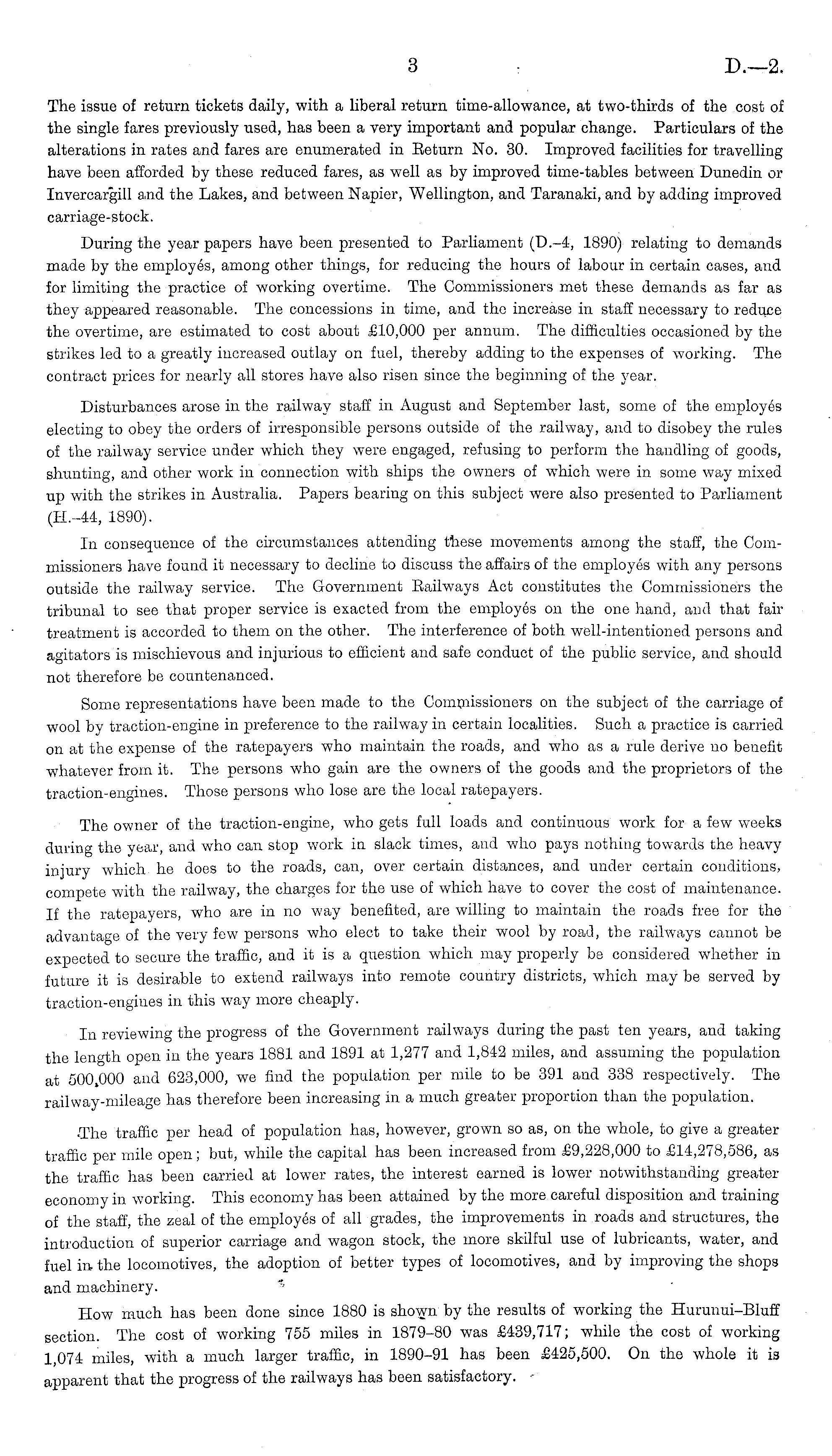 The issue of return tickets daily, with a liberal return time-allowance, at two-thirds of the cost of the single fares previously used, has been a very important and popular change. Particulars of the alterations in rates and fares are enumerated in Eeturn No. 30. Improved facilities for travelling have been afforded by these reduced fares, as well as by improved time-tables between Dunedin or Invercargill and the Lakes, and between Napier, Wellington, and Taranaki, and by adding improved carriage-stock. During the year papers have been presented to Parliament (D.-4, 1890) relating to demands made by the employes, among other things, for reducing the hours of labour in certain cases, and for limiting the practice of working overtime. The Commissioners met these demands as far as they appeared reasonable. The concessions in time, and tho increase in staff necessary to reduce the overtime, are estimated to cost about £10,000 per annum. The difficulties occasioned by the strikes led to a greatly increased outlay on fuel, thereby adding to the expenses of working. The contract prices for nearly all stores have also risen since the beginning of the year. Disturbances arose in the railway staff in August and September last, some of the employes electing to obey the orders of irresponsible persons outside of the railway, and to disobey the rules of the railway service under which they were engaged, refusing to perform the handling of goods, shunting, and other work in connection with ships the owners of which wore in some way mixed up with the strikes in Australia. Papers bearing on this subject were also presented to Parliament (H.-44, 1890). In consequence of the circumstances attending these movements among the staff, the Commissioners have found it necessary to decline to discuss the affairs of the employes with any persons outside the railway service. The Government Bailways Act constitutes the Commissioners the tribunal to see that proper service is exacted from the employes on the one hand, and that fair treatment is accorded to them on the other. The interference of both well-intentioned persons and agitators is mischievous and injurious to efficient and safe conduct of the public service, and should not therefore be countenanced. Some representations have been made to the Commissioners on the subject of tho carriage of wool by traction-engine in preference to the railway in certain localities. Such a practice is carried on at the expense of the ratepayers who maintain the roads, and who as a rule derive no benefit whatever from it. The persons who gain are the owners of the goods and the proprietors of the traction-engines. Those persons who lose are the local ratepayers. The owner of the traction-engine, who gets full loads and continuous work for a few weeks during the year, and who can stop work in slack times, and who pays nothing towards the heavy injury which he does to the roads, can, over certain distances, and under certain conditions, compete with the railway, the charges for the use of which have to cover the cost of maintenance. If the ratepayers, who are in no way benefited, are willing to maintain the roads free for the advantage of the very few persons who elect to take their wool by road, the railways cannot be expected to secure the traffic, and it is a question which may properly be considered whether in future it is desirable to extend railways into remote country districts, which may be served by traction-engines in this way more cheaply. In reviewing the progress of the Government railways during the past ten years, and taking the length open in the years 1881 and 1891 at 1,277 and 1,842 miles, and assuming the population at 500,000 and 623,000, we find the population per mile to be 391 and 338 respectively. The railway-mileage has therefore been increasing in a much greater proportion than the population. •The traffic per head of population has, however, grown so as, on the whole, to give a greater traffic per mile open; but, while the capital has been increased from £9,228,000 to £14,278,586, as the traffic has been carried at lower rates, the interest earned is lower notwithstanding greater economy in working. This economy has been attained by the more careful disposition and training of the staff, the zeal of the employes of all grades, the improvements in roads and structures, the introduction of superior carriage and wagon stock, the more skilful use of lubricants, water, and fuel in the locomotives, the adoption of better types of locomotives, and by improving the shops and machinery. How much has been done since 1880 is shown by the results of working the Hurunui-Bluff section. The cost of working 755 miles in 1879-80 was £439,717; while the cost of working 1 074 miles, with a much larger traffic, in 1890-91 has been £425,500. On the whole it is apparent that the progress of the railways has been satisfactory.