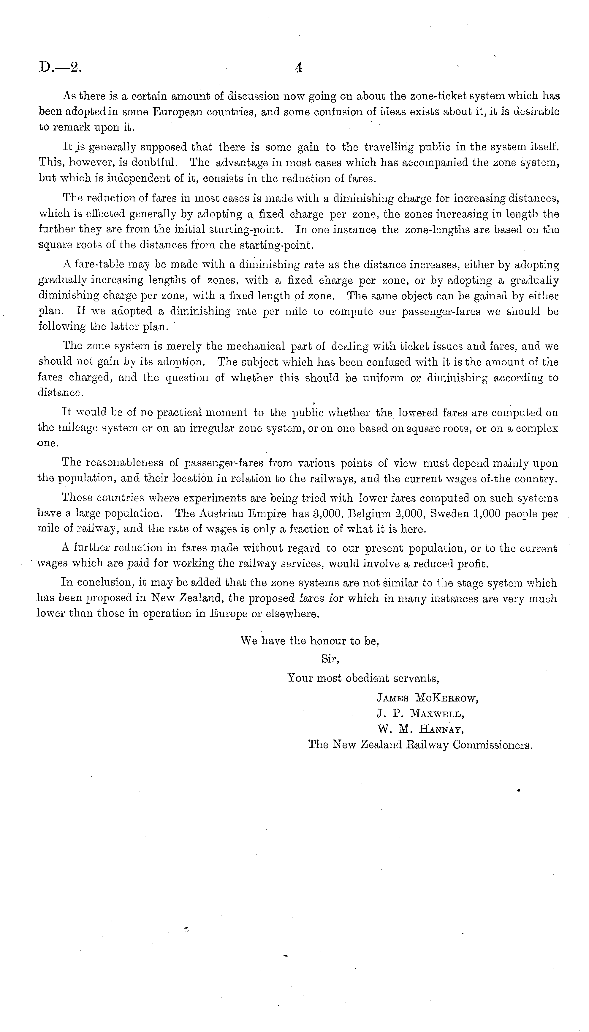 As there is a certain amount of discussion now going on about the zone-ticket system which has been adopted in some European countries, and some confusion of ideas exists about it, it is desirable to remark upon it. It js generally supposed that there is some gain to the travelling public in the system itself. This, however, is doubtful. The advantage in most cases which has accompanied the zone system, but which is independent of it, consists in the reduction of fares. The reduction of fares in most cases is made with a diminishing charge for increasing distances, which is effected generally by adopting a fixed charge per zone, the zones increasing in length the further they are from the initial starting-point. In one instance the zone-lengths are based on the square roots of the distances from the starting-point. A fare-table may be made with a diminishing rate as the distance increases, either by adopting gradually increasing lengths of zones, with a fixed charge per zone, or by adopting a gradually diminishing charge per zone, with a fixed length of zone. The same object can be gained by either plan. If we adopted a diminishing rate per mile to compute our passenger-fares we should be following the latter plan. The zone system is merely the mechanical part of dealing with ticket issues and faros, and we should not gain by its adoption. The subject which has been confused with it is the amount of the fares charged, and the question of whether this should, be uniform or diminishing according to distance. It would be of no practical moment to the public whether the lowered fares are computed on the mileage system or on an irregular zone system, or on one based on square roots, or on a complex one. The reasonableness of passenger-fares from various points of view must depend mainly upon the population, and their location in relation to the railways, and the current wages of.the country. Those countries where experiments are being tried with lower fares computed on such systems have a large population. The Austrian Empire has 3,000, Belgium 2,000, Sweden 1,000 people per mile of railway, and the rate of wages is only a fraction of what it is here. A further reduction in fares made without regard to our present population, or to the current wages which are paid for working the railway services, would involve a reduced profit. In conclusion, it may be added that the zone systems are not similar to Lie stage system which has been proposed in New Zealand, the proposed fares for which in many instances are very much lower than those in operation in Europe or elsewhere. We have the honour to be, Sir, Your most obedient servants, James McKbbkow, J. P. Maxwell, W. M. Hannay, The New Zealand Eailway Commissioners.