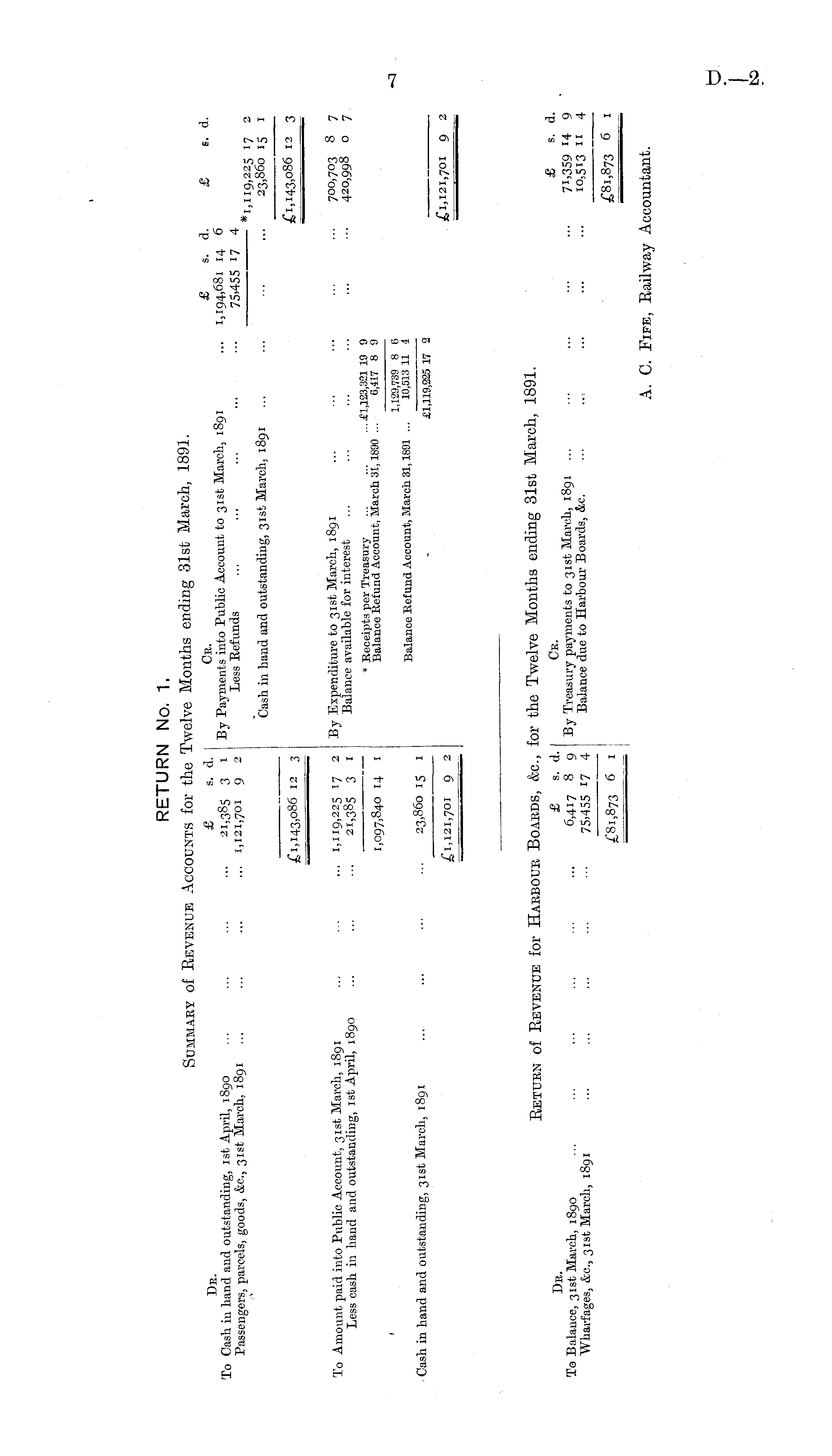 Return of Revenue for Harbour Boards, &c, for the Twelve Months ending 31st March, 1891. D E £ s. d. Ce. £ s- dTo Balance, 31st March, 1890 6,417 8 9 By Treasury payments to 31st March, 1891 71,359 H 9 Wharfages, &c, 31st March, 1891 ... ... ... ... •■• 75.455 17 4 Balance due to Harbour Boards, &c. ... .., ... ... ■■• 10,5*3 " 4 £81,873 6 1 £81,873 6 1 A. C. Fife, Railway Accountant.