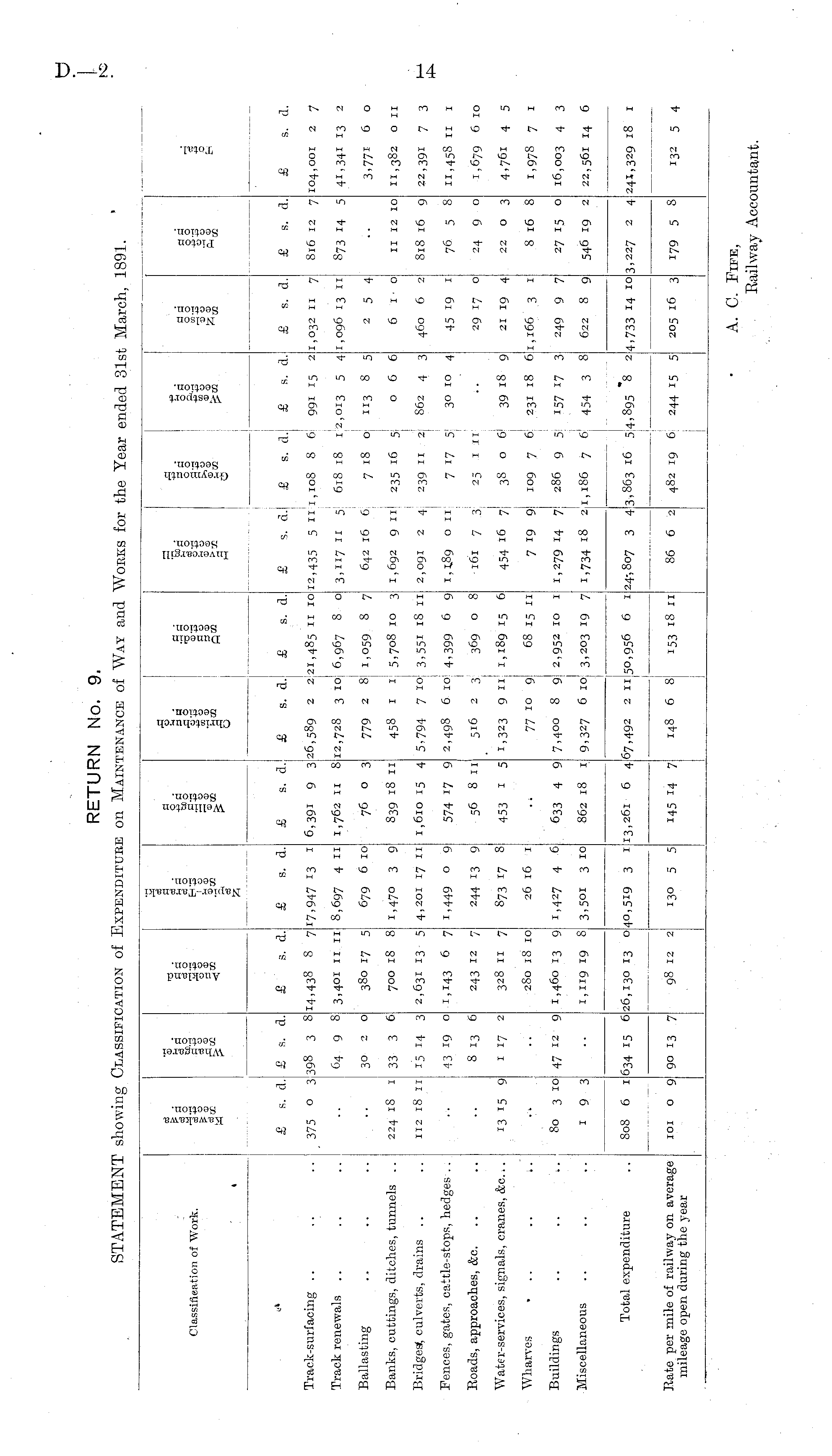RETURN No. 9. STATEMENT showing Classification of Expenditure on Maintenance of Way and Works for the Year ended 31st March, 1891.