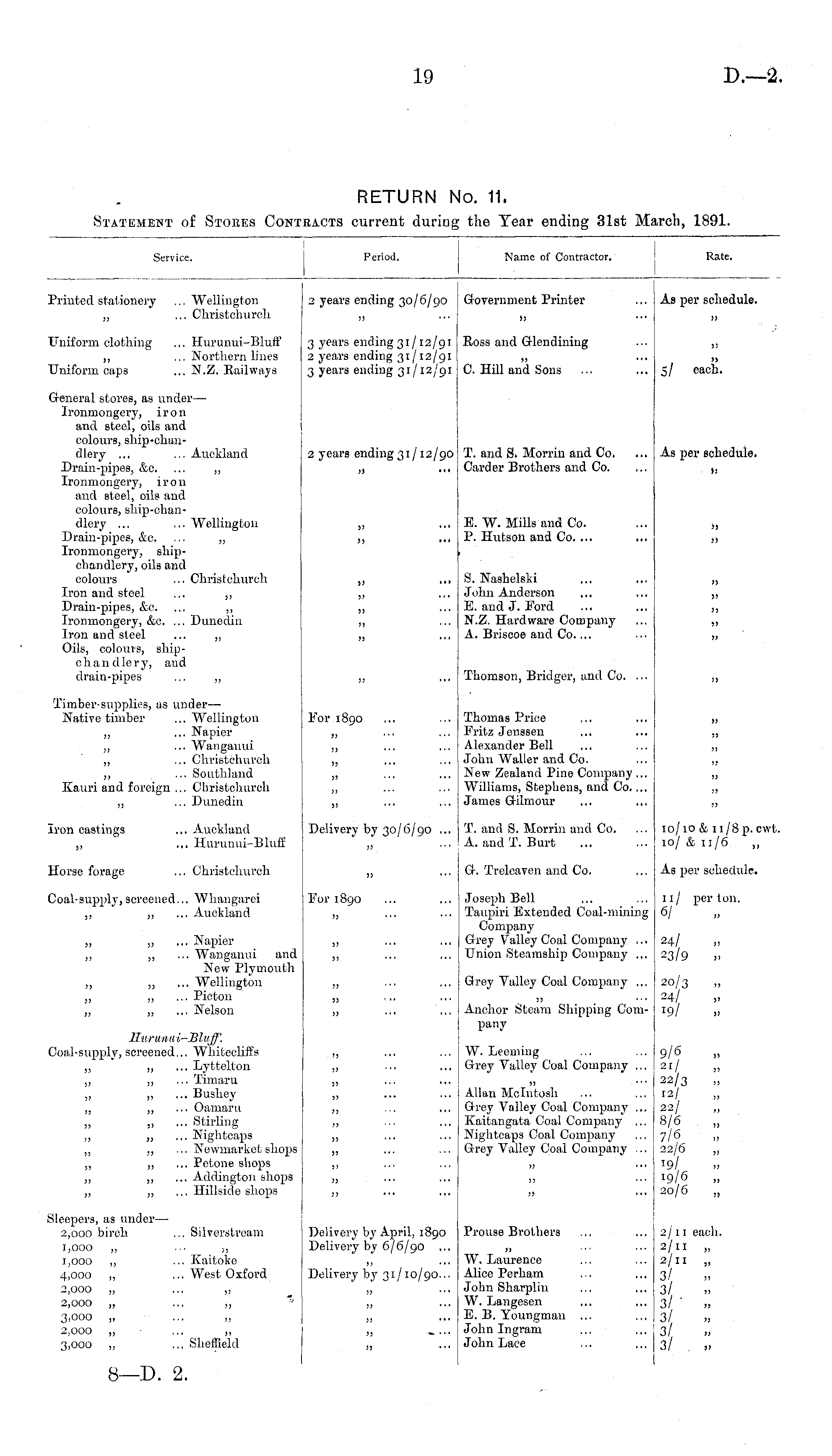 Service. Period. Name of Contractor, Rate. Printed stationery ,.. Wellington ,, ... Christchurch 2 years ending 30/6/90 Government Printer As per schedule. ,, ,, » Uniform clothing ... Hurunui-Bluff ,, ... Northern lines Uniform caps ... N.Z. Railways 3 years ending 3 1 /12/91 2 years ending 31/12/91 3 years endiug 31/12/91 Ross and Glendining )) 0. Hill and Sons ... ... 5/ each. General stores, as under — Ironmongery, iron and steel, oils and colours, ship-chan-dlery ... ... Auckland Drain-pipes, &c. ... ,, Ironmongery, iron and steel, oils and colours, ship-chan-dlery ... ... Wellington Drain-pipes, __e. ... „ Ironmongery, shipchandlery, oils and colours ... Christchurch Iron and steel ... ,, Drain-pipes, &c. ... ,, Ironmongery, &c. ... Dunedin Iron and sleel ... „ Oils, colours, shipchandlery, and drain-pipes ... „ 2 years ending 31/12/90 ,» ... j> "• ,, ... T. and S. Morrin and Co. Carder Brothers and Co. E. W. Mills and Co. P. Hutson and Co. ... As per schedule. ».• ,, Ml ,, ,, S. Nasholski John Anderson B. and J. Ford N.Z. Hardware Company A. Briscoe and Co.... >i »J „ )) ,, ... ,, Thomson, Bridger, and Co. ... 3) Timber-supplies, as under— Native timber ... Wellington ,, ... Napier ,, ... Wanganui ,, ... Christchurch ,, ... Southland Kauri and foreign ... Christchurch „ ... Dunedin For 1890 ,, Thomas Price Fritz Jenssen Alexander Bell John Waller and Co. New Zealand Pine Company ... Williams, Stephens, and Co.... James Gilmour J) )) ,, „ )) )) ,, ... ... JJ Iron castings ... Auckland ,, ... Hurunui-Bluff Delivery by 30/6/90 ... T. and S. Morrin and Co. A. and T.Burt 10/10 & 11/8 p. CWfc. 10/ & ll/6 Horse forage ... Christchurch ,, G-. Treleaven and Co. As per schedule. Coal-supply, screened... Whangarei ,, ,, ... Auckland For 1890 Joseph Bell Taupiri Extended Coal-mining Company Grey V ralley Coal Company ... Union Steamship Company ... 11/ per Ion. 6/ ,, ,, „ ... Napier „ ,, ... Wanganui and New Plymouth ,, „ ... Wellington „ j, •■• Picton ,, ,, ... Nelson ,, ... ... 24/ 23/9 ,, ... ... ,, ,, ... ... Grey Valley Coal Company ... Anchor Steam Shipping Com20/3 24/ 19/ ,, pany Kuril mi i-Bluff. Coal-supply, screened... Whitecliffs ,, ,, ... Lyttelton ,, „ ... Timaru ,, „ ... Bushey ,, „ ... Oamaru „ ,, ... Stirling ,, „ ... Nightcaps ,, ,, ... Newmarket shops „ ,, ... Petone shops ,, ,, ... Addington shops ,, ,, .., Hillside shops ., ... ,, ... ... ,, ... ... ,, ... ... ,, W. Leeming Grey Valley Coal Company ... ,, Allan Mcintosh Grey Valley Coal Company ... Kaitangata Coal Company ... Nightcaps Coal Company Grey Valley Coal Company ... 9/6 21/ 22/3 12/ 22/ 8/6 7/6 22/6 19/ 19/6 20/6 „ ,, ,, ... ,, ,, ,, ... ,, ... ,, ,, ... ... ,, ... Sleepers, as under— 2,000 birch ... Silverstreatu 1,000 „ ... ,, 1,000 ,, ... Kaitoko 4,000 ,, ... West Oxford 2,000 „ ... „ 2,000 „ ... „ 3,000 „ ... „ 2,000 „ ... ,, 3,000 ,, ... Sheffield Delivery by April, 1890 Delivery by 6/6/90 ... Delivery by 31/10/90... Prouse Brothers W. Laurence Alice Perham John Sharpliu W. Langesen E. B. Youngman ... John Ingram John Lace 2/ 11 each. 2/11 „ 2/11 „ 3/ 3/ „ 3/ ' „ 3/ 3/ 3/