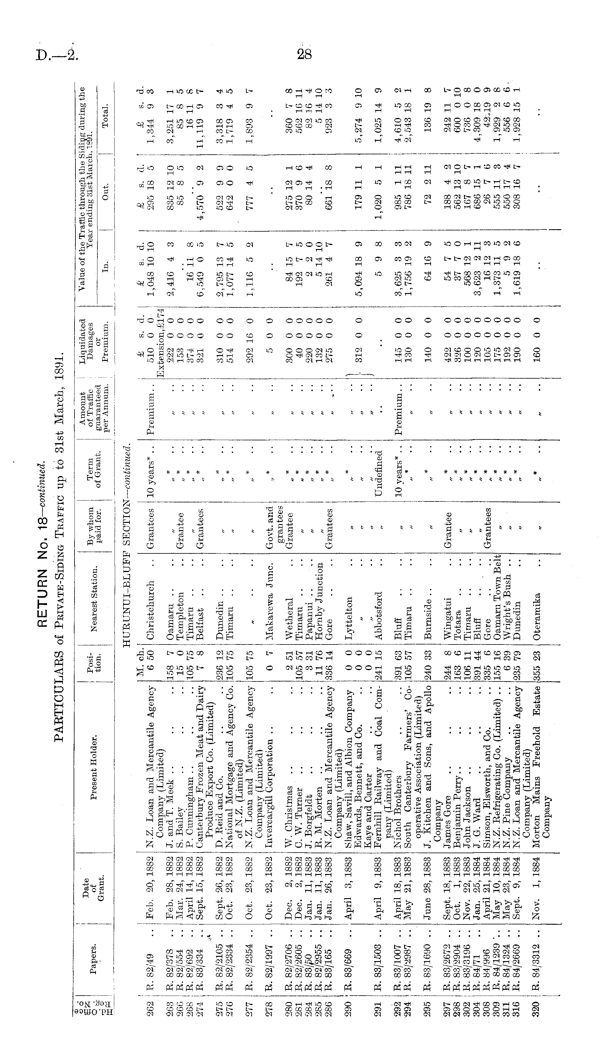 o o Papers. j Date of Grant. Present Holder. I Position. Nearest Station. By whom paid for. Term of Grant. Amount of Traffic guaranteed per Annum. Liquidated Damages or Premium. Value of the Traffic through the Siding during the Year ending 81st March, 1991. In. Out. Total. In. Out. Total. EURUNUI-BLUFE SECTION '— continued. £ s. d. 1 510 0 0 Extension, £174 222 0 0 153 0 0 374 0 0 321 0 0 [ 262 | R. 82/49 Feb. 20,1882 N.Z. Loam and Mercantile Agency Company (Limited) J. and T. Meek S. Bailey P. Cunningham Canterbury Frozen Meat and Dairy Produce Export Co. (Limited) D. Reid and Co. National Mortgage and Agency Co. of N.Z. (Limited) N.Z. Loan and Mercantile Agency Company (Limited^ Invercargill Corporation .. M. ch. 6 50 Cliristchurch Grantees 10 years".. Premium.. £ s. d. 1,048 10 10 £ s. d. 295 18 5 & s. d. 1,344 9 3 263 R. 82/373 .. 266 R. 82/554 .. 268 ! R. 82/692 .. 274 R. 83/334 .. 275 R. 82/2105 .. 276 R. 82/2334 .. Feb. 28, 1882 Mar. 24, 1882 April 14, 1882 Sept. 15, 1882 158 7 15 0 105 75 7 8 Oamaru Templeton Timaru Belfast .. Grantee * * 2,416 4 3 16 11 8 6,549 0 5 835 12 10 85 8 5 3,251 17 1 85 8 5 16 11 8 11,119 9 7 Grantees * 4,570 9 2 Sept. 26, 1882 Oct. 23, 1882 •236 12 |lO5 75 Dunedin Timaru * 310 0 0 514 0 0 2,795 13 7 1,077 14 5 522 9 9 642 0 0 3,318 3 4 1,719 4 5 277 R. 82/2354 .. Oct. 23, 1882 105 75 292 16 0 1,116 5 2 777 4 5 1,893 9 7 278 R. 82/1997 .. Oct. 23, 1882 0 7 Makarewa June. Govt. and grantees Grantee * 5 0 0 280 R. 82/2706 .. 281 R. 82/2605 .. 284 R. 83/50 285 E. 82/2955 .. 286 R. 83/165 .. Dec. 2, 1882 Dec. 2, 1882 Jan. 11, 1883 Jan. 11,1883 Jan. 26, 1883 W. Christmas C. W. Turner .. J. Borgfeldt R. M. Morten N.Z. Loan and Mercantile Agency Company (Limited) Shaw, Savill, and Albion Company Edwards, Bennett, and Co. Kaye and Carter Fernhill Railway and Coal Company (Limited) Kichol Brothers South Canterbury Farmers' Cooperative Association (Limited) J. Kitchen and Sons, and Apollo Company James Gore Benjamin Perry.. John Jackson J. G. Ward Simson, Elsworth, find Co. N.Z. Refrigerating Co. (Limited) .. N.Z. Pine Company N.Z. Loan and Mercantile Agency Company (Limited) Morton Mains Freehold Estate Company 2 51 105 57 3 31 11 76 336 14 Wetheral Timaru Papanui Hornby Junction Gore 300 0 0 40 0 0 220 0 0 132 0 0 275 0 0 84 15 7 192 7 5 2 2 0 5 14 10 261 4 7 275 12 1 370 9 6 80 14 4 360 7 8 562 16 11 82 16 4 5 14 10 923 3 3 Grantees 661 18 8 290 j R. 83/669 .. April 3, 1883 0 0 0 0 0 0 241 15 Lyttelton I 312 0 0 5,094 18 9 179 11 1 5,274 9 10 291 I R. 83/1503 .. April 9, 1883 Abbotsford Undefined 5 9 8 1,020 5 1 1,025 14 9 292 I R. 83/1007 .. 294 j R. 83/2987 .. April 18, 1883 May 21, 1883 391 63 ;105 57 Bluff Timaru 10 years*.. Premium.. 145 0 0 130 0 0 3,625 3 3 1,756 19 2 985 1 11 786 18 11 4,610 5 2 2,543 18 1 „ 295 E. 83/16'JO .. 297 R. 83/2672 .. 298 i R. 83/2904 .. 302 R. 83/3196 .. 304 : R. 84/71 308 j E. 84/996 309 R. 84/1239 '.. 311 R. 84/1324 .. 316 E. 84/2669 .. June 28, 1883 Sept. 18, 1883 Oct. 1, 1883 Nov. 22, 1883 Jan. 25, 1884 April 21, 1884 May 10, 1884 May 23, 1884 Sept. 9, 1884 33 1244 8 163 6 106 11 391 44 335 6 155 16 6 39 235 79 Burnside Wingatui Totara Timaru Blufi Gore Oamaru Town Belt Wright's Bush .. Duncdin Grantee * 140 0 0 422 0 0 826 0 0 100 0 0 120 0 0 105 0 0 175 0 0 192 0 0 190 0 0 64 16 9 54 7 5 37 7 0 568 12 1 3,623 2 11 16 12 3 1,373 11 5 5 9 2 1,619 18 6 72 2 11 188 4 2 562 13 10 167 8 7 686 15 1 26 7 6 555 11 3 550 17 4 308 16 7 ! I 136 19 8 242 11 7 600 0 10 736 0 8 4,309 18 0 42,19 9 1,929 2 8 556 6 6 1,928 15 1 Grantees 320 j E. 84/3312 .. Nov. 1, 1884 355 23 Oteramika * 160 0 0