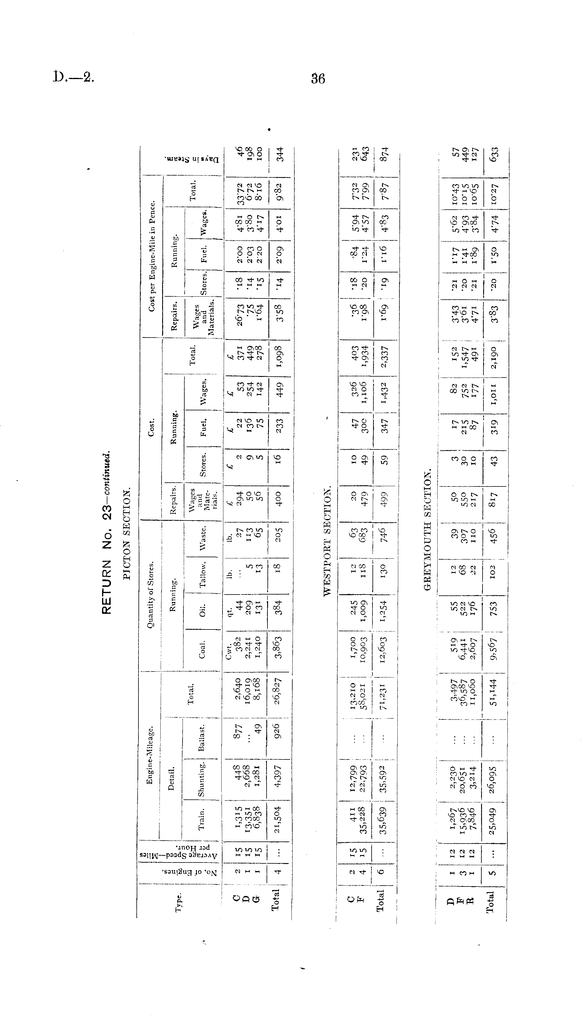 Type. m o o f Engine-Mileage. Detail. Shunting. Ballast. Total. j _ Coal. Q< Quantity of Stores. Running. hiantity of Stores. Running. Oil. Tallow. Waste. Repairs. Repairs. Running. Running. Cost. Repairs. Repairs. Running. Wages TolaL and Stores. Fnel. "Wages. Materials. | Cost per Engine-Mile in Pence. Running. 3 c Train. Wages i Total. Stores. Fuel. Wages. ! rials. C ! 2 D : i IS IS IS 13.351 6,838 448 j 2,668 1,281 49 1 2,640 16,019 8,168 Cwt. 382 2,241 1,240 qt. 44 209 r3i 1b. lb. 27 5 113 13 65 18 205 294 SO * 2 9 S 16 22 136 75 S3 254 142 371 449 278 2673 "75 I-6 4 •18 ■14 'IS 2'OO 2-03 220 4"8l 3-80 3372 6'72 816 46 198 100 Total j 4 21,504 4,397 926 26,827 3,863 384 400 233 449 1,098 3-58 •14 2'O9 401 9-82 344