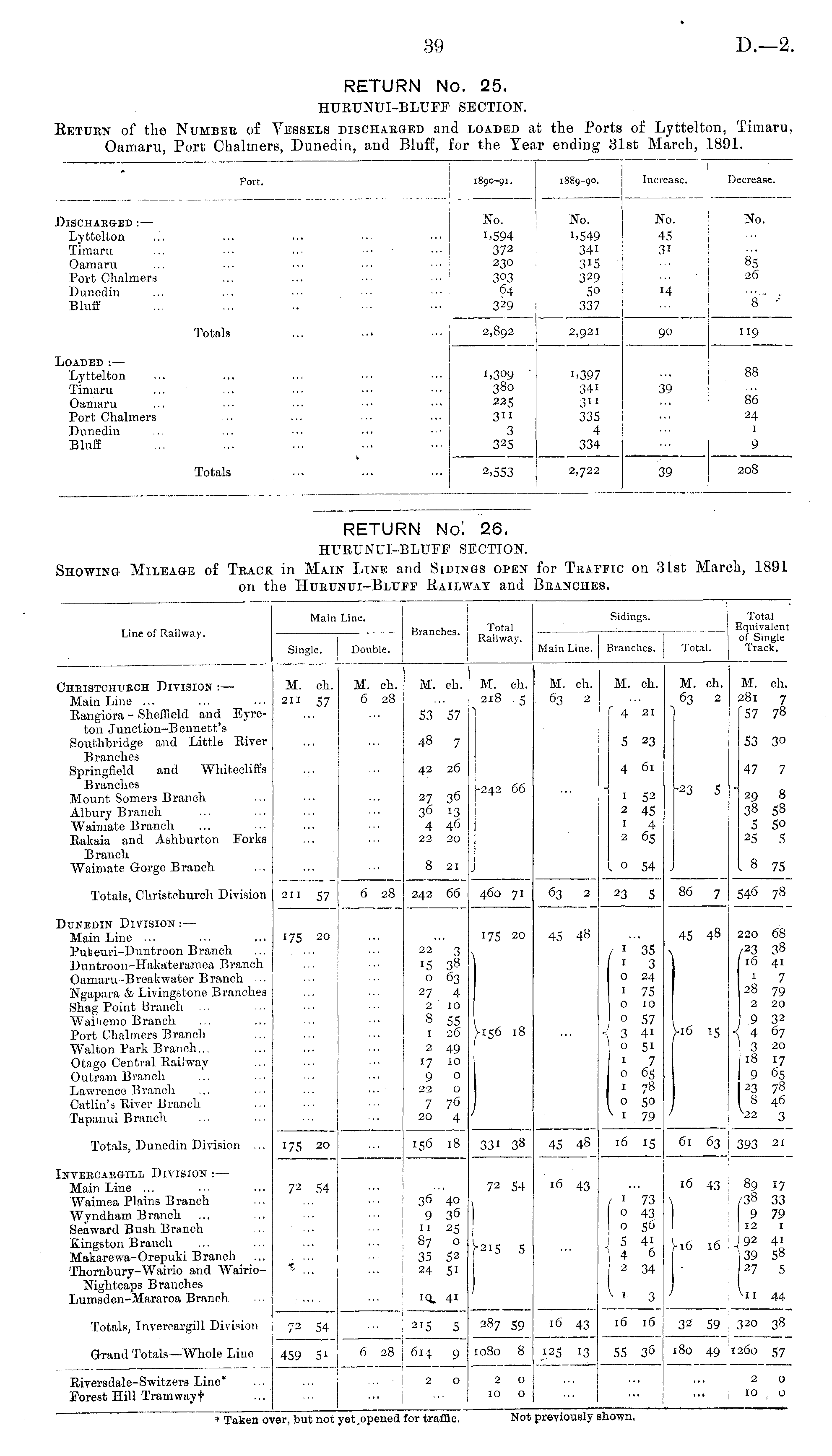 RETURN No. 25. HURUNUI-BLUFF SECTION. Return of the Number of Vessels discharged and loaded at the Ports of Lyttelton, Timaru, Oamaru, Port Chalmers, Dunedin, and Bluff, for the Year ending 31st March, 1891.