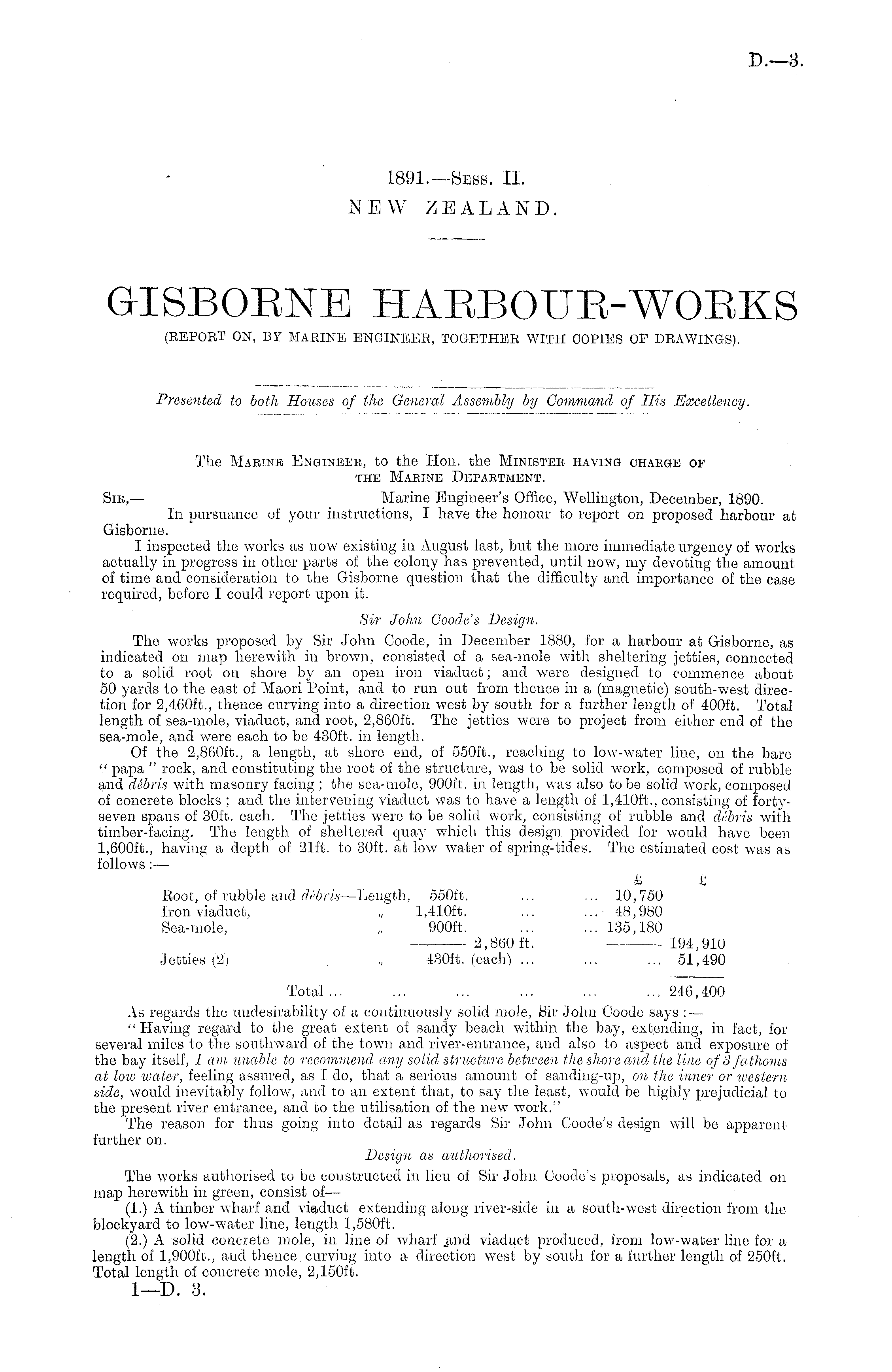 The Mabine Engineeb, to the Hon. the Minister having ohaege op THE MAEINE DePABTMENT. Sib, — Marine Engineer's Office, Wellington, December, 1890. In pursuance of your instructions, I have the honour to report on proposed harbour at Gisbome. I inspected the works as now existing in August last, but the more immediate urgency of works actually in progress in other parts of the colony has prevented, until now, my devoting the amount of time and consideration to the Gisborne question that the difficulty and importance of the case required, before I could report upon it. Sir John Goode's Design. The works proposed by Sir John Coode, in December 1880, for a harbour at Gisborne, as indicated on map herewith in brown, consisted of a sea-mole with sheltering jetties, connected to a solid root on shore by an open iron viaduct; and were designed to commence about 50 yards to the east of Maori Point, and to run out from thence in a (magnetic) south-west direction for 2,460 ft., thence curving into a direction west by south for a further length of 400 ft. Total length of sea-mole, viaduct, and root, 2,860 ft. The jetties were to project from either end of the sea-mole, and were each to be 430 ft. in length. Of the 2,860 ft., a length, at shore end, of 550 ft., reaching to low-water line, on the bare " papa " rock, and constituting the root of the structure, was to be solid work, composed of rubble and debris with masonry facing ; the sea-mole, 900 ft. in length, was also to be solid work, composed of concrete blocks ; and the intervening viaduct was to have a length of 1,410 ft., consisting of fortyseven spans of 30ft. each. The jetties were to be solid work, consisting of rubble and debris with timber-facing. The length of sheltered quay which this design provided for would have been 1,600 ft., having a depth of 21ft. to 30ft. at low water of spring-tides. The estimated cost was as follows:— £ & Root, of rubble and debris —Length, 550 ft. ... ... 10,750 Iron viaduct, „ 1,410 ft. ... ...- 48,980 Sea-mole, „ 900 ft. ... ... 135,180 2,860 ft. 194,910 Jetties"( 2) „ 430 ft. (each) ... ... ... 51,490 Total ... ... ... ... ... ... 246,400 As regards the undesirability of a continuously solid mole, Hir John Coode says : — "Having regard to the great extent of sandy beach within the bay, extending, in fact, for several miles to the southward of the town and river-entrance, and also to aspect and exposure of the bay itself, I am unable to recommend any solid structure between the shore and the line of 3 fathoms at low water, feeling assured, as I do, that a serious amount of sanding-up, on the inner or western side, would inevitably follow, and to an extent that, to say the least, would be highly prejudicial to the present river entrance, and to the utilisation of the new work." The reason for thus going into detail as regards Sir John Coode's design will be apparent further on. Design as authorised. The works authorised to be constructed in lieu of Sir John Goode's proposals, as indicated on map herewith in green, consist of— (1.) A timber wharf and viaduct extending along river-side in a south-west direction from the blookyard to low-water line, length 1,580 ft. (2.) A solid concrete mole, in line of wharf .and viaduct produced, from low-water line for a length of 1,900 ft., and thence curving into a direction west by south for a further length of 250 ft. Total length of concrete mole, 2,150 ft. I—D. 3.