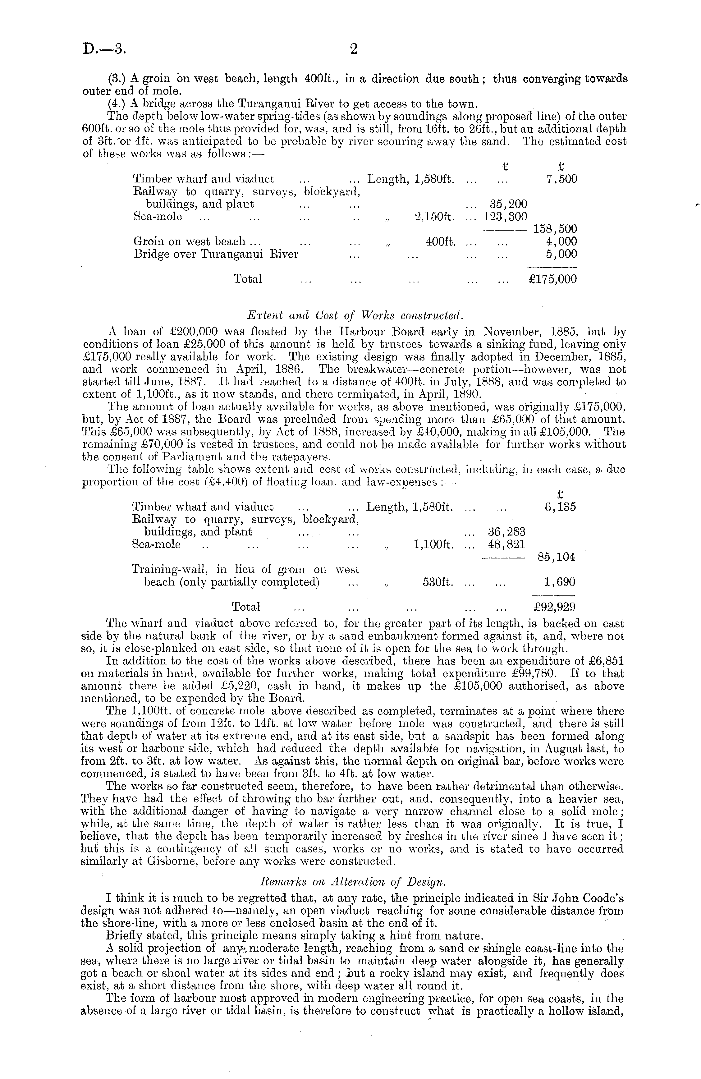 (3.) A groin on west beach, length 400 ft., in a direction due south; thus converging towards outer end of mole. (4.) A bridge across the Turanganui Eiver to get access to the town. The depth below low-water spring-tides (as shown by soundings along proposed line) of the outer 600 ft. or so of the mole thus provided for, was, and is still, from 16ft. to 26ft., but an additional depth of 3ft.'or 4ft. was anticipated to be probable by river scouring away the sand. The estimated cost of these works was as follows :— £ £ Timber wharf and viaduct ... ... Length, 1,580 ft 7,500 Eailway to quarry, surveys, blockyard, buildings, and plant ... ... ... 35,200 Sea-mole ... ... ... .. „ 2,150 ft. ... 123,300 158,500 Groin on west beach ... ... ... „ 400 ft 4,000 Bridge over Turanganui Eiver ... ... 5,000 Total ... ... ... £175,000 Extent and Coat of Works constructed. A loan of £200,000 was floated by the Harbour Board early in November, 1885, but by conditions of loan £25,000 of this amount is held by trustees towards a sinking fund, leaving only £175,000 really available for work. The existing design was finally adopted in December, 1885, and work commenced in April, 1886. The breakwater—concrete portion—however, was not started till June, 1887. It had reached to a distance of 400 ft. in July, 1888, and was completed to extent of 1,100 ft., as it now stands, and there terminated, in April, 1890. The amount of loan actually available for works, as above mentioned, was originally £175,000, but, by Act of 1887, the Board was precluded from spending more than £65,000 of that amount. This £65,000 was subsequently, by Act of 1888, increased by £40,000, making in all £105,000. The remaining £70,000 is vested in trustees, and could not bo made available for further works without the consent of Parliament and the ratepayers. The following table shows extent and cost of works constructed, including, in each case, a due proportion of the cost (£4,400) of floating loan, and law-expenses : — £ Timber whart and viaduct ... ... Length, 1,580 ft 6,135 Eailway to quarry, surveys, blockyard, buildings, and plant ... ... ... 36,283 Sea-mole .. ... ... .. „ I,looft. ... 48,821 85,104 Training-wall, in lieu of groin on west beach (only partially completed) ... „ 530 ft 1,690 Total ... ... ... £92,929 The wharf and viaduct above referred to, for the greater part of its length, is backed on east side by the natural bank of the river, or by a sand embankment formed against it, and, where not so, it is close-planked on east side, so that none of it is open for the sea to work through. In addition to the cost of the works above described, there has been au expenditure of £6,851 on materials in hand, available for further works, making total expenditure £99,780. If to that amount there be added £5,220, cash in hand, it makes up the £105,000 authorised, as above mentioned, to be expended by the Board. The I,looft. of concrete mole above described as completed, terminates at a point where there were soundings of from 12ft. to 14ft. at low water before mole was constructed, and there is still that depth of water at its extreme end, and at its east side, but a sandspit has been formed along its west or harbour side, which had reduced the depth available for navigation, in August last, to from 2ft. to 3ft. at low water. As against this, the normal depth on original bar, before works were commenced, is stated to have been from 3ft. to 4ft. at low water. The works so far constructed seem, therefore, to have been rather detrimental than otherwise. They have had the effect of throwing the bar further out, and, consequently, into a heavier sea, with the additional danger of having to navigate a very narrow channel close to a solid mole; while, at the same time, the depth of water is rather less than it was originally. It is true, I believe, that the depth has been temporarily increased by freshes in the river since I have seen it; but this is a contingency of all such cases, works or no works, and is stated to have occurred similarly at Gisborne, before any works were constructed. Remarks on Alteration of Design. I think it is much to be regretted that, at any rate, the principle indicated in Sir John Coode's design was not adhered to—namely, an open viaduct reaching for some considerable distance from the shore-line, with a more or less enclosed basin at the end of it. Briefly stated, this principle means simply taking a hint from nature. A solid projection of any-, moderate length, reaching from a sand or shingle coast-line into the sea, whera there is no large river or tidal basin to maintain deep water alongside it, has generally got a beach or shoal water at its sides and end ; .but a rocky island may exist, and frequently does exist, at a short distance from the shore, with deep water all round it. The form of harbour most approved in modern engineering practice, for open sea coasts, in the absence of a large river or tidal basin, is therefore to construct what is practically a hollow island,