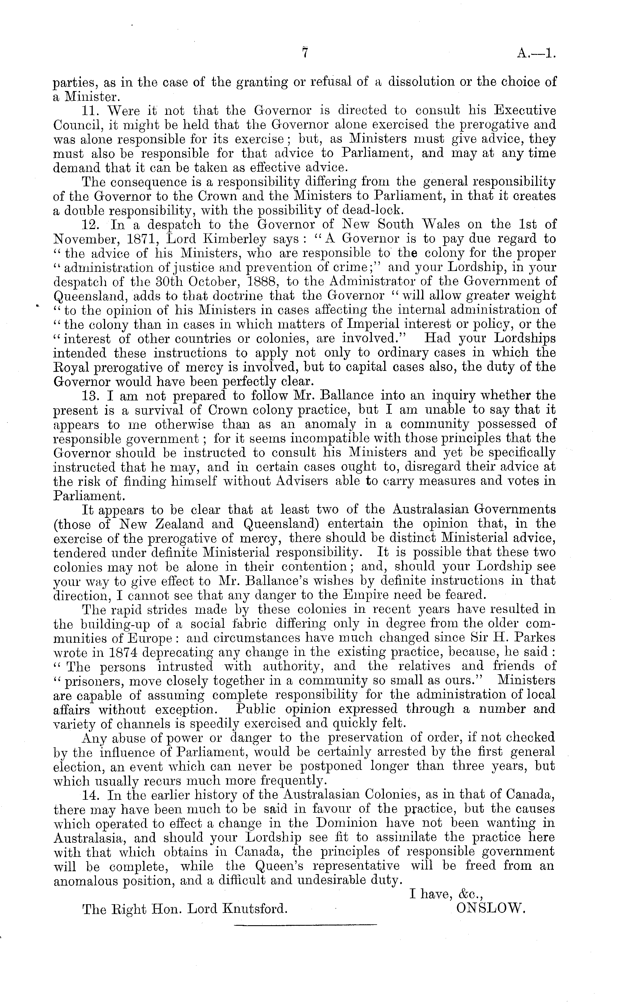 parties, as in the case of the granting or refusal of a dissolution or the choice of a Minister. 11. Were it not that the Governor is directed to consult his Executive Council, it might be held that the Governor alone exercised the prerogative and was alone responsible for its exercise; but, as Ministers must give advice, they must also be responsible for that advice to Parliament, and may at any time demand that it can be taken as effective advice. The consequence is a responsibility differing from the general responsibility of the Governor to the Crown and the Ministers to Parliament, in that it creates a double responsibility, with the possibility of dead-lock. 12. In a despatch to the Governor of New South Wales on the Ist of November, 1871, Lord Kimberley says: "A Governor is to pay due regard to " the advice of his Ministers, who are responsible to the colony for the proper " administration of justice and prevention of crime;" and your Lordship, in your despatch of the 30th October, 1888, to the Administrator of the Government of Queensland, adds to that doctrine that the Governor " will allow greater weight "to the opinion of his Ministers in cases affecting the internal administration of " the colony than in cases in which matters of Imperial interest or policy, or the "interest of other countries or colonies, are involved." Had your Lordships intended these instructions to apply not only to ordinary cases in which the Royal prerogative of mercy is involved, but to capital cases also, the duty of the Governor would have been perfectly clear. 13. I am not prepared to follow Mr. Ballance into an inquiry whether the present is a survival of Crown colony practice, but I am unable to say that it appears to me otherwise than as an anomaly in a community possessed of responsible government; for it seems incompatible with those principles that the Governor should be instructed to consult his Ministers and yet be specifically instructed that he may, and in certain cases ought to, disregard their advice at the risk of finding himself without Advisers able to carry measures and votes in Parliament. It appears to be clear that at least two of the Australasian Governments (those of New Zealand and Queensland) entertain the opinion that, in the exercise of the prerogative of mercy, there should be distinct Ministerial advice, tendered under definite Ministerial responsibility. It is possible that these two colonies may not be alone in their contention; and, should your Lordship see your way to give effect to Mr. Ballance's wishes by definite instructions in that direction, I cannot see that any danger to the Empire need be feared. The rapid strides made by these colonies in recent years have resulted in the building-up of a social fabric differing only in degree from the older communities of Europe : and circumstances have much changed since Sir H. Parkes wrote in 1874 deprecating any change in the existing practice, because, he said : " The persons intrusted with authority, and the relatives and friends of " prisoners, move closely together in a community so small as ours." Ministers are capable of assuming complete responsibility for the administration of local affairs without exception. Public opinion expressed through a number and variety of channels is speedily exercised and quickly felt. Any abuse of power or danger to the preservation of order, if not checked by the influence of Parliament, would be certainly arrested by the first general election, an event which can never be postponed longer than three years, but which usually recurs much more frequently. 14. In the earlier history of the Australasian Colonies, as in that of Canada, there may have been much to be said in favour of the practice, but the causes which operated to effect a change in the Dominion have not been wanting in Australasia, and should your Lordship see fit to assimilate the practice here with that which obtains in Canada, the principles of responsible government will be complete, while the Queen's representative will be freed from an anomalous position, and a difficult and undesirable duty. I have, &c, The Right Hon. Lord Knutsford. ONSLOW.