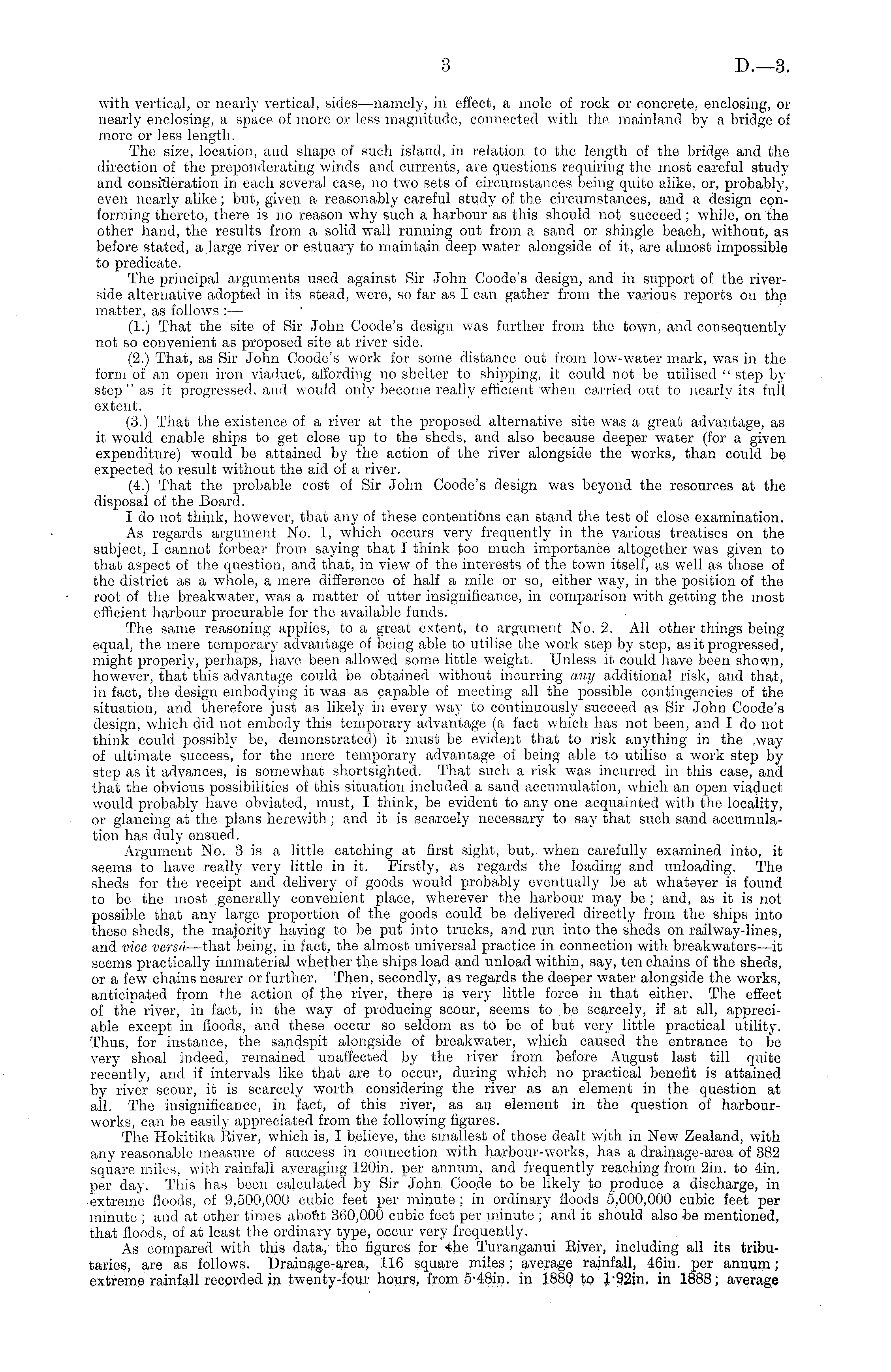 with vertical, or nearly vertical, sides—namely, in effect, a mole of rock or concrete, enclosing, or nearly enclosing, a space of more ov loss magnitude, connected with the mainland by a bridge of more or less length. The size, location, and shape of such island, in relation to the length of the bridge and the direction of the preponderating winds and currents, are questions requiring the most careful study and consideration in each several case, no two sets of circumstances being quite alike, or, probably, even nearly alike; but, given a reasonably careful study of the circumstances, and a design conforming thereto, there is no reason why such a harbour as this should not succeed ; while, on the other hand, the results from a solid wall running out from a sand or shingle beach, without, as before stated, a large river or estuary to maintain deep water alongside of it, are almost impossible to predicate. The principal arguments used against Sir John Coode's design, and in support of the riverside alternative adopted in its stead, were, so far as I can gather from the various reports on the matter, as follows :— (1.) That the site of Sir John Coode's design was further from the town, and consequently not so convenient as proposed site at river side. (2.) That, as Sir John Coode's work for some distance out from low-water mark, was in the form of an open iron viaduct, affording no shelter to shipping, it could not be utilised " step by step" as it progressed, and would only become really efficient when carried out to nearly its full extent. (3.) That the existence of a river at the proposed alternative site was a great advantage, as it would enable ships to get close up to the sheds, and also because deeper water (for a given expenditure) would be attained by the action of the river alongside the works, than could be expected to result without the aid of a river. (4.) That the probable cost of Sir John Coode's design was beyond the resources at the disposal of the Board. I do not think, however, that any of these contentions can stand the test of close examination. As regards argument No. 1, which occurs very frequently in the various treatises on the subject, I cannot forbear from saying that I think too much importance altogether was given to that aspect of the question, and that, in view of the interests of the town itself, as well as those of the district as a whole, a mere difference of half a mile or so, either way, in the position of the root of the breakwater, was a matter of utter insignificance, in comparison with getting the most efficient harbour procurable for the available funds. The same reasoning applies, to a great extent, to argument No. 2. All other tilings being equal, the mere temporary advantage of being able to utilise the work step by step, as it progressed, might properly, perhaps, have been allowed some little weight. Unless it could have been shown, however, that this advantage could be obtained without incurring any additional risk, and that, in fact, the design embodying it was as capable of meeting all the possible contingencies of the situation, and therefore just as likely in every way to continuously succeed as Sir John Coode's design, which did not embody this temporary advantage (a fact which has not been, and I do not think could possibly be, demonstrated) it must be evident that to risk anything in the .way of ultimate success, for the mere temporary advantage of being able to utilise a work step by step as it advances, is somewhat shortsighted. That such a risk was incurred in this case, and that the obvious possibilities of this situation included a sand accumulation, which an oj^en viaduct would probably have obviated, must, I think, be evident to any one acquainted with the locality, or glancing at the plans herewith; and it is scarcely necessary to say that such sand accumulation has duly ensued. Argument No. 3 is a little catching at first sight, but, when carefully examined into, it seems to have really very little in it. Firstly, as regards the loading and unloading. The sheds for the receipt and" delivery of goods would probably eventually be at whatever is found to be the most generally convenient place, wherever the harbour may be ; and, as it is not possible that any large proportion of the goods could be delivered directly from the ships into these sheds, the majority having to be put into trucks, and run into the sheds on railway-lines, and vice versa —that being, in fact, the almost universal practice in connection with breakwaters—it seems practically immaterial whether the ships load and unload within, say, ten chains of the sheds, or a few chains nearer or further. Then, secondly, as regards the deeper water alongside the works, anticipated from the action of the river, there is very little force in that either. The effect of the river, in fact, in the way of producing scour, seems to be scarcely, if at all, appreciable except in floods, and these occur so seldom as to be of but very little practical utility. Thus, for instance, the sandspit alongside of breakwater, which caused the. entrance to be very shoal indeed, remained unaffected by the river from before August last till quite recently, and if intervals like that are to occur, during which no practical benefit is attained by river scour, it is scarcely worth considering the river as an element in the question at all. The insignificance, in fact, of this river, as an element in the question of harbourworks, can be easily appreciated from the following figures. The Hokitika Biver, which is, I believe, the smallest of those dealt with in New Zealand, with any reasonable measure of success in connection with harbour-works, has a drainage-area of 382 square miles, with rainfall averaging 120 in. per annum, and frequently reaching from 2in. to 4in. per day. This has been calculated by Sir John Coode to be likely to produce a discharge, in extreme floods, of 9,500,000 cubic fe