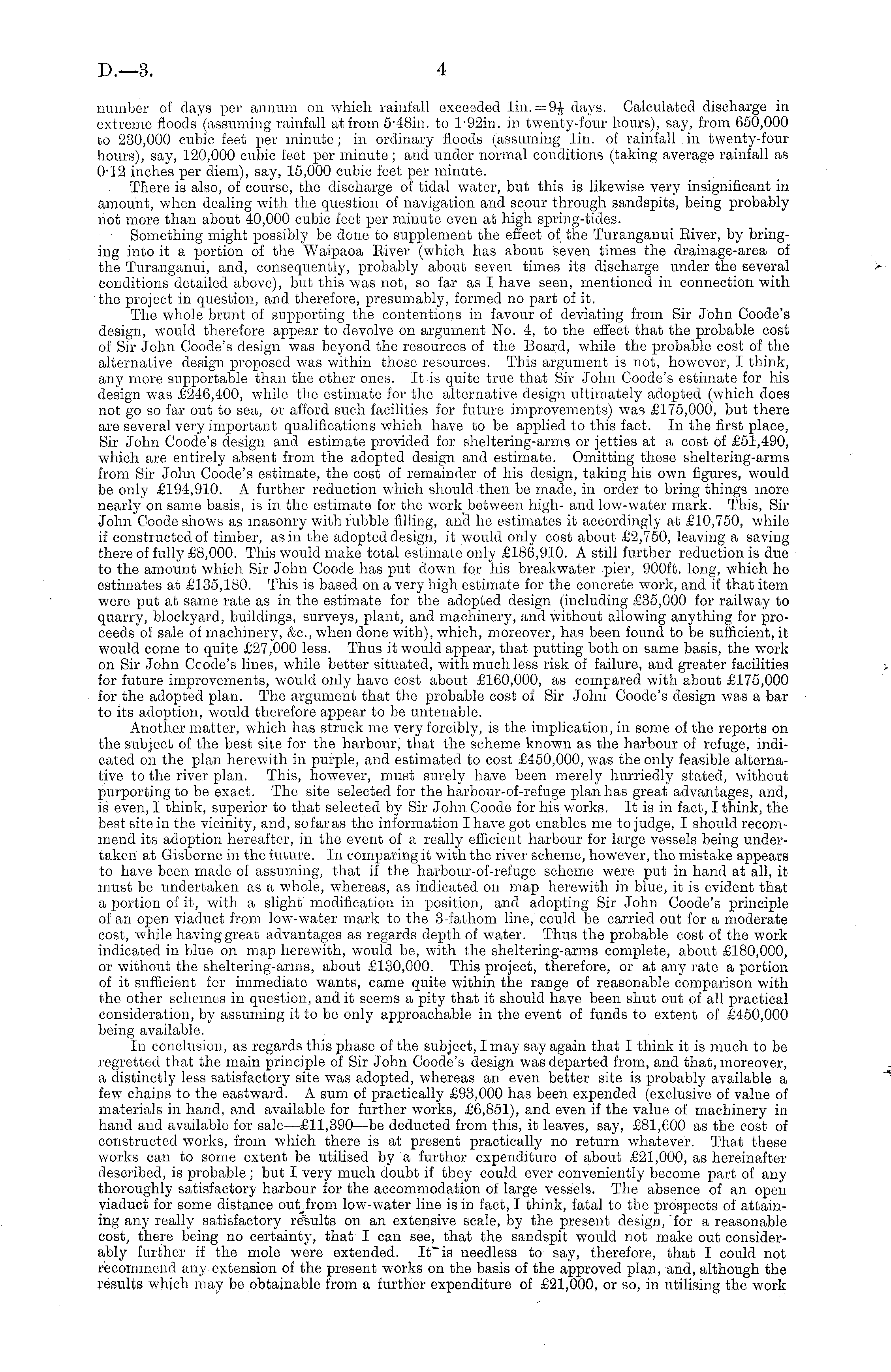 number of days per annum on which rainfall exceeded lin, —9-§ days. Calculated discharge in extreme floods (assuming rainfall at from 5-48 in. to l'92in. in twenty-four hours), say, from 650,000 to 230,000 cubic feet per minute; in ordinary floods (assuming lin. of rainfall in twenty-four hours), say, 120,000 cubic feet per minute ; and under normal conditions (taking average rainfall as 0-12 inches per diem), say, 15,000 cubic feet per minute. There is also, of course, the discharge of tidal water, but this is likewise very insignificant in amount, when dealing with the question of navigation and scour through sandspits, being probably not more than about 40,000 cubic feet per minute even at high spring-tides. Something might possibly be done to supplement the effect of the Turanganui River, by bringing into it a portion of the Waipaoa Eiver (which has about seven times the drainage-area of the Turanganui, and, consequently, probably about seven times its discharge under the several conditions detailed above), but this was not, so far as I have seen, mentioned in connection with the project in question, and therefore, presumably, formed no part of it. The whole brunt of supporting the contentions in favour of deviating from Sir John Coode's design, would therefore appear to devolve on argument No. 4, to the effect that the probable cost of Sir John Coode's design was beyond the resources of the Board, while the probable cost of the alternative design proposed was within those resources. This argument is not, however, I think, any more supportable than the other ones. It is quite true that Sir John Coode's estimate for his design was £246,400, while the estimate for the alternative design ultimately adopted (which does not go so far out to sea, or afford such facilities for future improvements) was £175,000, but there are several very important qualifications which have to be applied to this fact. In the first place, Sir John Coode's design and estimate provided for sheltering-arms or jetties at a cost of £51,490, which are entirely absent from the adopted design and estimate. Omitting these sheltering-arma from Sir John Coode's estimate, the cost of remainder of his design, taking his own figures, would be only £194,910. A further reduction which should then be made, in order to bring things more nearly on same basis, is in the estimate for the work between high- and low-water mark. This, Sir John Coode shows as masonry with rubble filling, and he estimates it accordingly at £10,750, while if constructed of timber, as in the adopted design, it would only cost about £2,750, leaving a saving there of fully £8,000. This would make total estimate only £186,910. A still further reduction is due to the amount which Sir John Coode has put down for his breakwater pier, 900 ft. long, which he estimates at £135,180. This is based on a very high estimate for the concrete work, and if that item were put at same rate as in the estimate for the adopted design (including £35,000 for railway to quarry, bloekyard, buildings, surveys, plant, and machinery, and without allowing anything for proceeds of sale of machinery, &c, when done with), which, moreover, has been found to be sufficient, it would come to quite £27,000 less. Thus it would appear, that putting both on same basis, the work on Sir John Ccode's lines, while better situated, with much less risk of failure, and greater facilities for future improvements, would only have cost about £160,000, as compared with about £175,000 for the adopted plan. The argument that the probable cost of Sir John Coode's design was a bar to its adoption, would therefore appear to be untenable. Another matter, which has struck me very forcibly, is the implication, in some of the reports on the subject of the best site for the harbour, that the scheme known as the harbour of refuge, indicated on the plan herewith in purple, and estimated to cost £450,000, was the only feasible alternative to the river plan. This, however, must surely have been merely hurriedly stated, without purporting to be exact. The site selected for the harbour-of-refuge plan has great advantages, and, is even, I think, superior to that selected by Sir John Coode for his works. It is in fact, I think, the best site in the vicinity, and, sofaras the information I have got enables me to judge, I should recommend its adoption hereafter, in the event of a really efficient harbour for large vessels being undertaken at Gisborne in the future. In comparing it with the river scheme, however, the mistake appears to have been made of assuming, that if the harbour-of-refuge scheme were put in hand at all, it must be undertaken as a whole, whereas, as indicated on map herewith in blue, it is evident that a portion of it, with a slight modification in position, and adopting Sir John Coode's principle of an open viaduct from low-water mark to the 3-fathoin line, could be carried out for a moderate cost, while having great advantages as regards depth of water. Thus the probable cost of the work indicated in blue on map herewith, would be, with the sheltering-arms complete, about £180,000, or without the sheltering-arms, about £130,000. This project, therefore, or at any rate a portion of it sufficient for immediate wants, came quite within the range of reasonable comparison with the other schemes in question, and it seems a pity that it should have been shut out of all practical consideration, by assuming it to be only approachable in the event of funds to extent of £450,000 being available. In conclusion, as regards this phase of the subject, I may say again that I think it is much to be regretted that the main principle of Sir John Coode's design was departed from, and that, moreover, a distinctly less satisfactory site was adopted, whereas an even better site is probably available a few chains to the eastward. A sum of practically £93,000 has been expended (exclusive of value of materia