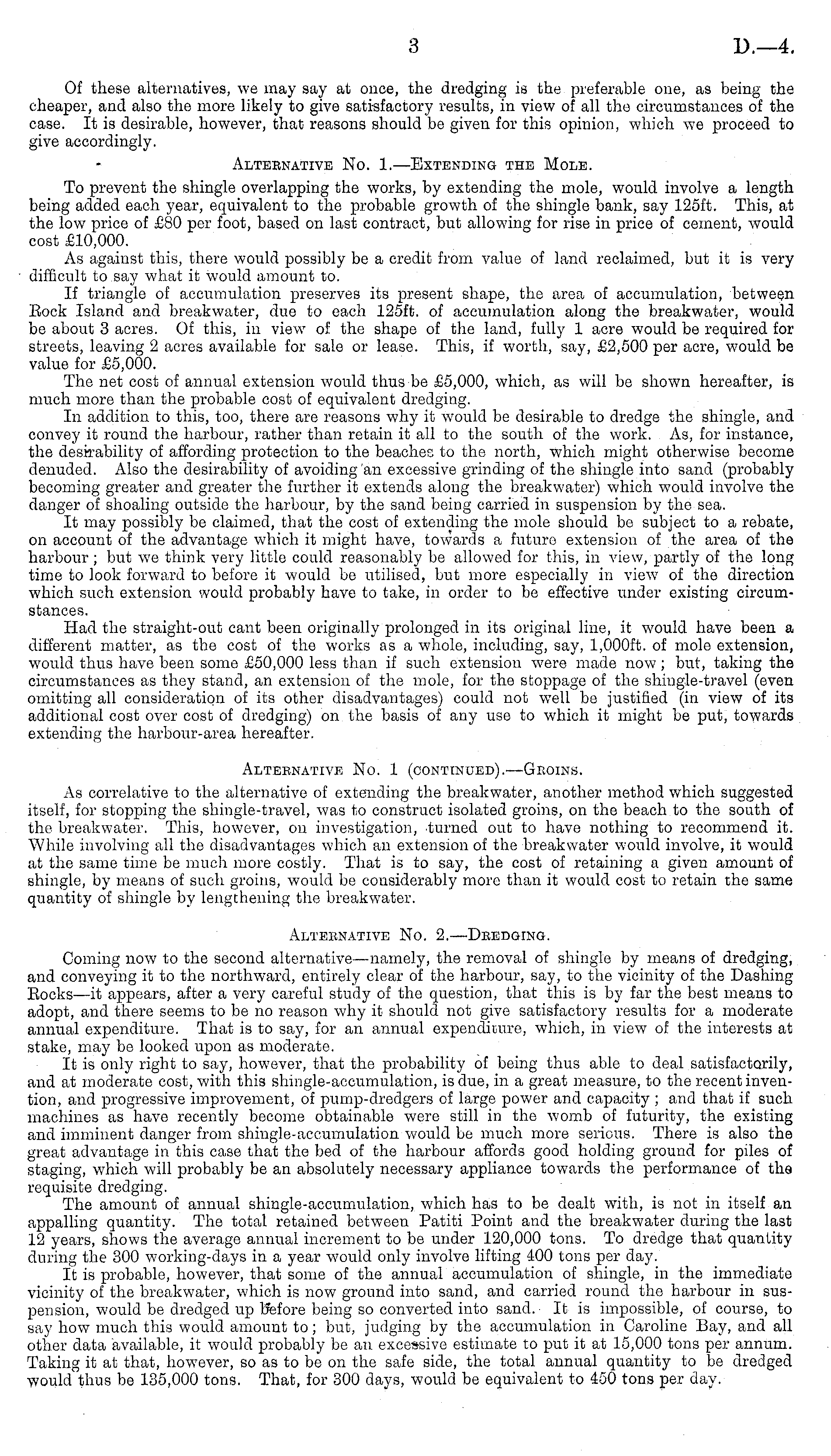 Of these alternatives, we may say at once, the dredging is the preferable one, as being the cheaper, and also the more likely to give satisfactory results, in view of all the circumstances of the case. It is desirable, however, that reasons should be given for this opinion, which we proceed to give accordingly. Alteenative No. I.—Extending the Mole. To prevent the shingle overlapping the works, by extending the mole, would involve a length being added each year, equivalent to the probable growth of the shingle bank, say 125ft. This, at the low price of £80 per foot, based on last contract, but allowing for rise in price of cement, would cost £10,000. As against this, there would possibly be a credit from value of land reclaimed, but it is very difficult to say what it would amount to. If triangle of accumulation preserves its present shape, the area of accumulation, between Bock Island and breakwater, due to each 125ft. of accumulation along the breakwater, would be about 3 acres. Of this, in view of the shape of the land, fully 1 acre would be required for streets, leaving 2 acres available for sale or lease. This, if worth, say, £2,500 per acre, would be value for £5,000. The net cost of annual extension would thus be £5,000, which, as will be shown hereafter, is much more than the probable cost of equivalent dredging. In addition to this, too, there are reasons why it would be desirable to dredge the shingle, and convey it round the harbour, rather than retain it all to the south of the work. As, for instance, the desirability of affording protection to the beaches to the north, which might otherwise become denuded. Also the desirability of avoiding an excessive grinding of the shingle into sand (probably becoming greater and greater the further it extends along the breakwater) which would involve the danger of shoaling outside the harbour, by the sand being carried in suspension by the sea. It may possibly be claimed, that the cost of extending the mole should be subject to a rebate, on account of the advantage wdiich it might have, towards a future extension of the area of the harbour ; but we think very little could reasonably be allowed for this, in view, partly of the long time to look forward to before it would be utilised, but more especially in view of the direction which such extension would probably have to take, in order to be effective under existing circumstances. Had the straight-out cant been originally prolonged in its original line, it would have been a different matter, as the cost of the works as a whole, including, say, I,oooft. of mole extension, would thus have been some £50,000 less than if such extension were made now ; but, taking the circumstances as they stand, an extension of the mole, for the stoppage of the shingle-travel (even omitting all consideration of its other disadvantages) could not well be justified (in view of its additional cost over cost of dredging) on the basis of any use to which it might be put, towards extending the harbour-area hereafter. Alteenative No. 1 (continued). —Gboins. As correlative to the alternative of extending the breakwater, another method which suggested itself, for stopping the shingle-travel, was to construct isolated groins, on the beach to the south of the breakwater. This, however, on investigation, turned out to have nothing to recommend it. While involving all the disadvantages which an extension of the breakwater would involve, it would at the same time be much more costly. That is to say, the cost of retaining a given amount of shingle, by means of such groins, would be considerably more than it would cost to retain the same quantity of shingle by lengthening the breakwater. Alteenative No. 2.—Deedging. Coming now to the second alternative —namely, the removal of shingle by means of dredging, and conveying it to the northward, entirely clear of the harbour, say, to the vicinity of the Dashing Bocks—it appears, after a very careful study of the question, that this is by far the best means to adopt, and there seems to be no reason why it should not give satisfactory results for a moderate annual expenditure. That is to say, for an annual expenditure, which, in view of the interests at stake, may be looked upon as moderate. It is only right to say, however, that the probability of being thus able to deal satisfactorily, and at moderate cost, with this shingle-accumulation, is due, in a great measure, to the recent invention, and progressive improvement, of pump-dredgers of large power and capacity ; and that if such machines as have recently become obtainable were still in the womb of futurity, the existing and imminent danger from shingle-accumulation would be much more serious. There is also the great advantage in this case that the bed of the harbour affords good holding ground for piles of staging, which will probably be an absolutely necessary appliance towards the performance of the requisite dredging. The amount of annual shingle-accumulation, which has to be dealt with, is not in itself an appalling quantity. The total retained between Patiti Point and the breakwater during the last 12 years, shows the average annual increment to be under 120,000 tons. To dredge that quantity during the 300 working-days in a year would only involve lifting 400 tons per day. It is probable, however, that some of the annual accumulation of shingle, in the immediate vicinity of the breakwater, which is now ground into sand, and carried round the harbour in suspension, would be dredged up before being so converted into sand. It is impossible, of course, to say how much this would amount to; but, judging by the accumulation in Caroline Bay, and all other data available, it would probably be an excessive estimate to put it at 15,000 tons per annum. Taking it at that, however, so as to be on the safe side, the total annual quantity to be dredged would thus be 135,000 tons. That, for 300 days, would be equivalent to