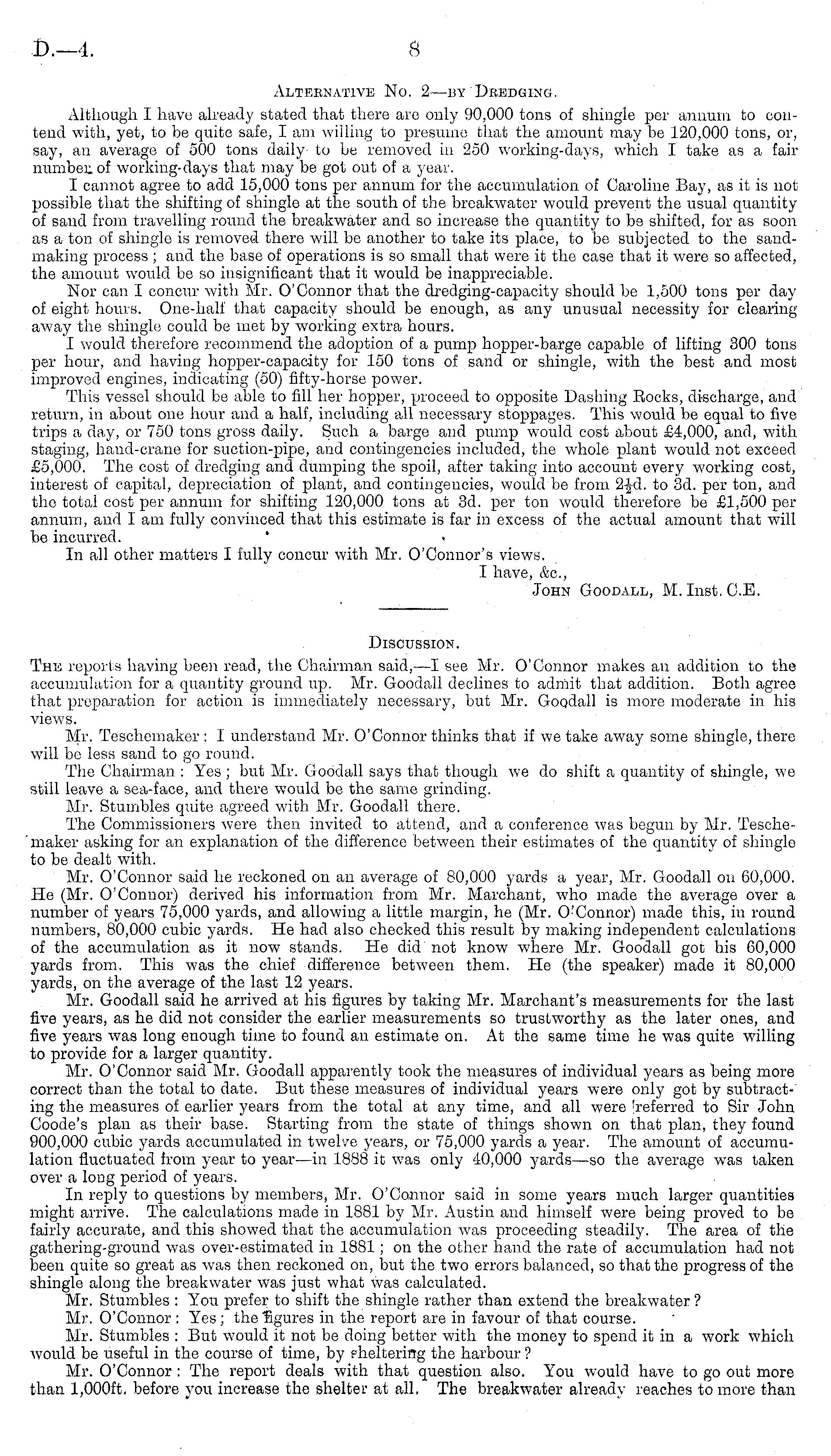 Discussion. The reports having been read, the Chairman said, —I see Mr. O'Connor makes an addition to the accumulation for a quantity ground up. Mr. Goodall declines to admit that addition. Both agree that preparation for action is immediately necessary, but Mr. Goodall is more moderate in his views. Mr. Teschemaker : I understand Mr. O'Connor thinks that if we take away some shingle, there will be less sand to go round. The Chairman : Yes ; but Mr. Goodall says that though we do shift a quantity of shingle, we still leave a sea-face, and there would be the same grinding. Mr. Stumbles quite agreed with Mr. Goodall there. The Commissioners were then invited to attend, and a conference was begun by Mr. Teschemaker asking for an explanation of the difference between their estimates of the quantity of shingle to be dealt with. Mr. O'Connor said he reckoned on an average of 80,000 yards a year, Mr. Goodall on 60,000. He (Mr. O'Connor) derived his information from Mr. Marchant, who made the average over a number of years 75,000 yards, and allowing a little margin, he (Mr. O'Connor) made this, in round numbers, 80,000 cubic yards. He had also checked this result by making independent calculations of the accumulation as it now stands. He did not know where Mr. Goodall got his 60,000 yards from. This was the chief difference between them. He (the speaker) made it 80,000 yards, on the average of the last 12 years. Mr. Goodall said he arrived at his figures by taking Mr. Marchant's measurements for the last five years, as he did not consider the earlier measurements so trustworthy as the later ones, and five years was long enough time to found an estimate on. At the same time he was quite willing to provide for a larger quantity. Mr. O'Connor said Mr. Goodall apparently took the measures of individual years as being more correct than the total to date. But these measures of individual years were only got by subtracting the measures of earlier years from the total at any time, and all were 'referred to Sir John Coode's plan as their base. Starting from the state of things shown On that plan, they found 900,000 cubic yards accumulated in twelve years, or 75,000 yards a year. The amount of accumulation fluctuated from year to year—in 1888 it was only 40,000 yards—so the average was taken over a long period of years. In reply to questions by members, Mr. O'Connor said in some years much larger quantities might arrive. The calculations made in 1881 by Mr. Austin and himself were being proved to be fairly accurate, and this showed that the accumulation was proceeding steadily. The area of the gathering-ground was over-estimated in 1881; on the other hand the rate of accumulation had not been quite so great as was then reckoned on, but the two errors balanced, so that the progress of the shingle along the breakwater was just what was calculated. Mr. Stumbles : You prefer to shift the shingle rather than extend the breakwater ? Mr. O'Connor : Yes; the _gures in the report are in favour of that course. Mr. Stumbles : But would it not be doing better with the money to spend it in a work which would be useful in the course of time, by eheltering the harbour ? Mr. O'Connor : The report deals with that question also. You would have to go out more than I,oooft. before you increase the shelter at all. The breakwater already reaches to more than