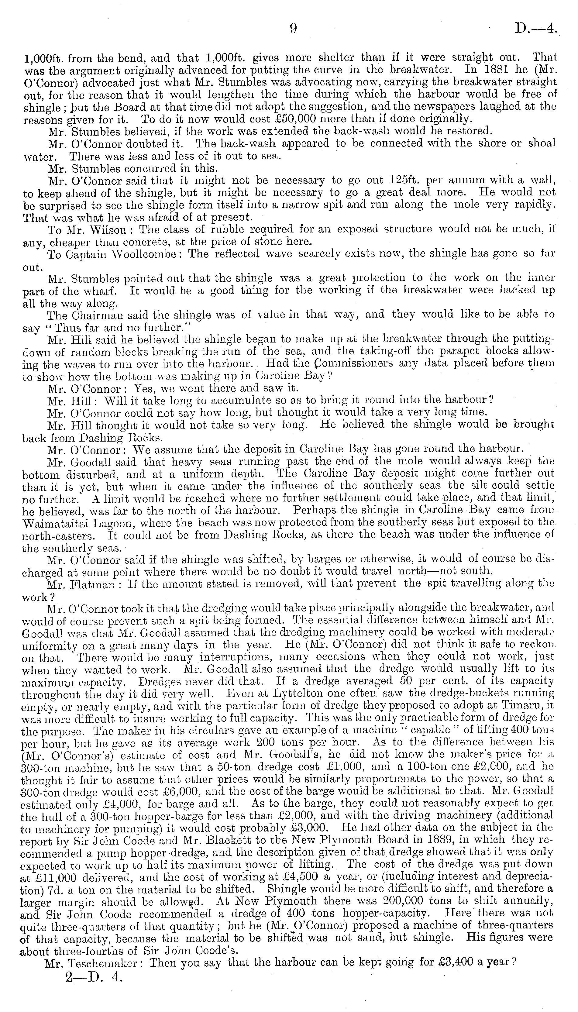I,oooft. from the bend, and that I,oooft. gives more shelter than if it were straight out. That was the argument originally advanced for putting the curve in the breakwater. In 1881 he (Mr. O'Connor) advocated just what Mr. Stumbles was advocating now, carrying the breakwater straight out, for the reason that it would lengthen the time during which the harbour would be free of shingle ; but the Board at that time did not adopt the suggestion, and the newspapers laughed at the: reasons given for it. To do it now would cost £50,000 more than if done originally. Mr. Stumbles believed, if the work was extended the back-wash would be restored. Mr. O'Connor doubted it. The back-wash appeared to be connected with the shore or shoal water. There was less and less of it out to sea. Mr. Stumbles concurred in this. Mr. O'Connor said that it might not be necessary to go out 125ft. per annum with a wall, to keep ahead of the shingle, but it might be necessary to go a great deal more. He would not be surprised to see the shingle form itself into a narrow7 spit and run along the mole very rapidly. That was what he was afraid of at present. To Mr. Wilson : The class of rubble required for an exposed structure would not be much, if any, cheaper than concrete, at the price of stone here. To Captain Woollcombe : The reflected wave scarcely exists now, the shingle has gone so far out. Mr. Stumbles pointed out that the shingle was a great protection to the work on the inner part of the wharf. It would be a good thing for the working if the breakwater were backed up all the way along. The Chairman said the shingle was of value in that way, and they would like to be able to say "Thus far and no further." Mr. Hill said he believed the shingle began to make up at the breakwater through the puttingdown of random blocks breaking the run of the sea, and the taking-off the parapet blocks allowing the waves to run over into the harbour. Had the Commissioners any data placed before them to show how the bottom was making up in Caroline Bay ? Mr. O'Connor : Yes, we went there and saw it. Mr. Hill: Will it take long to accumulate so as to bring it round into the harbour? Mr. O'Connor could not say how long, but thought it would take a very long time. Mr. Hill thought it would not take so very long. He believed the shingle would be brought back from Dashing Bocks. Mr. O'Connor: We assume that the deposit in Caroline Bay has gone round the harbour. Mr. Goodall said that heavy seas running past the end of the mole would always keep the bottom disturbed, and at a uniform depth. The Caroline Bay deposit might come further out than it is yet, but when it came under the influence of the southerly seas the silt could settle no further. A limit would be reached where no further settlement could take place, and that limit, he believed, was far to the north of the harbour. Perhaps the shingle in Caroline Bay came from Waimataitai Lagoon, where the beach was now 7 protected from the southerly seas but exposed to the. north-easters. it could not be from Dashing Bocks, as there the beach was under the influence of the southerly seas. Mr. O'Connor, said if the shingle was shifted, by barges or otherwise, it would of course be discharged at some point where there would be no doubt it would travel north —not south. Mr. Platman : If the amount stated is removed, will that prevent the spit travelling along the work ? Mr. O'Connor took it that the dredging would take place principally alongside the breakwater, and would of course prevent such a spit being formed. The essential difference between himself and Mr. Goodall was that Mr. Goodall assumed that the dredging machinery could be worked with moderate uniformity on a great many days in the year. He (Mr. O'Connor) did not think it safe to reckon on that. There would be many interruptions, many occasions when they could not work, just when they wanted to w 7ork. Mr. Goodall also assumed that the dredge would usually lift to its maximum capacity. Dredges never did that. If a dredge averaged 50 per cent, of its capacity throughout the day it did very well. Even at Lyttelton one often saw the dredge-buckets running empty, or nearly empty, and with the particular form of dredge they proposed to adopt at Timaru, it was more difficult to insure working to full capacity. This was the only practicable form of dredge for the purpose. The maker in his circulars gave an example of a machine " capable " of lifting 400 tons per hour, but he gave as its average work 200 tons per hour. As to the difference between his (Mr. O'Connor's) estimate of cost and Mr. Goodall's, he did not know the maker's price for a, 300-ton machine, but he saw that a 50-ton dredge cost £1,000, and a 100-ton one £2,000, and he thought it fair to assume that other prices would be similarly proportionate to the power, so that a 300-ton dredge would cost £6,000, and the cost of the barge would be additional to that. Mr. Goodall estimated only £4,000, for barge and all. As to the barge, they could not reasonably expect to get the hull of a 300-ton hopper-barge for less than £2,000, and with the driving machinery (additional to machinery for pumping) it would cost probably £3,000. He had other data on the subject in the report by Sir John Coode and Mr. Blackett to the New Plymouth Board in 1889, in which they recommended a pump hopper-dredge, and the description given of that dredge showed that it was only expected to work up to half its maximum power of lifting. The cost of the dredge was put down at £11,000 delivered, and the cost of working at £4,500 a year, or (including interest and depreciation) 7d. a ton on the material to be shifted. Shingle would be more difficult to shift, and therefore a larger margin should be allowed. At New Blymouth there was 200,000 tons to shift annually, and Sir John Coode recommended a dredge of 400 tons hopper-capacity. Here there was not quite three-quarters of that quantity; but he (M