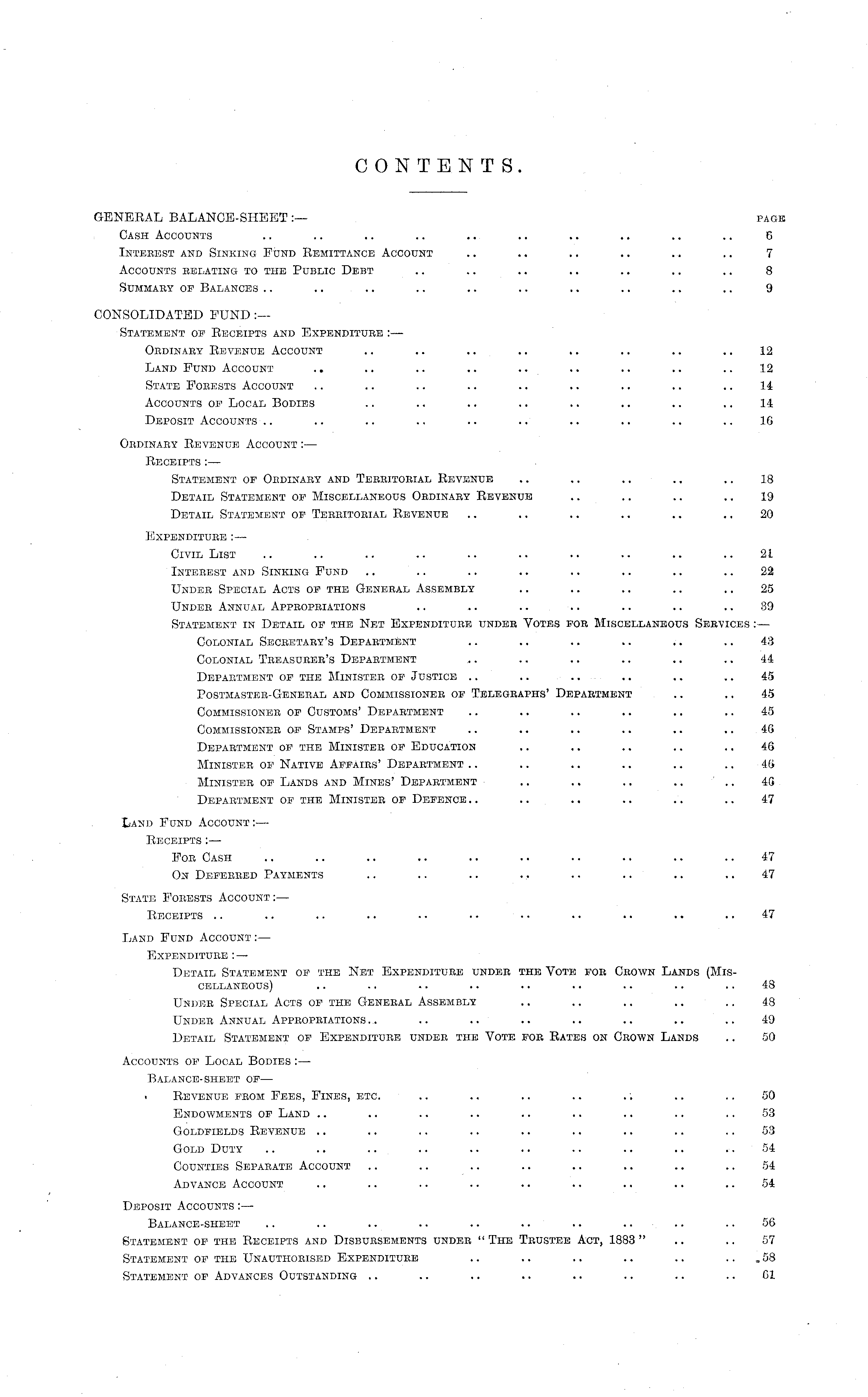 GENERAL BALANCE-SHEET :— pack Cash Accounts .. .. .. .. .. .. .. .. .. .. 6 Interest and Sinking Fund Remittance Account .. .. .. .. .. .. 7 Accounts sedating to the Public Debt .. .. .. .. .. .. .. 8 Summary of Balances .. .. .. .. .. .. .. .. .. .. 9 CONSOLIDATED FUND :— Statement of Receipts and Expenditube :— Obdinaey Revenue Account .. .. .. .. .. .. .. .. 12 Land Fund Account .. .. .. .. .. .. .. .. 12 State Foeests Account .. .. .. .. .. .. .. .. .. 14 Accounts of Local Bodies .. .. .. .. .. .. .. .. 14 Deposit Accounts .. .. .. .. .. .. .. .. .. .. 1G Obdinaby Revenue Account :— Receipts :— Statement op Obdinaby and Territorial Revenue .. .. .. .. .. 18 Detail Statement of Miscellaneous Obdinaby Revenue .. .. .. .. 19 Detail Statement of Tebbitobial Revenue .. .. .. .. .. .. 20 Expenditube :— Civil List .. .. .. .. .. .. .. .. .. .. 21 Interest and Sinking Fund .. .. .. .. .. .. .. .. 22 Undeb Special Acts of the Genebal Assembly .. .. .. .. .. 25 Under Annual Appropriations .. .. .. .. .. .. .. 39 Statement in Detail of the Net Expenditure undeb Votes fob Miscellaneous Sebvices :— Colonial Secretaby's Department .. .. .. .. .. .. 43 Colonial Treasubeb's Department .. .. .. .. .. .. 44 Department of the Minister of Justice .. .. .. .. .. .. 45 Postmaster-Genebal and Commissioner op Telegraphs' Department .. ~ 45 Commissioneb of Customs' Depabtment .. .. .. .. .. .. 45 Commissioner of Stamps' Department .. .. .. .. .. .. 40 Department of the Minister of Education .. .. .. .. .. 46 Ministeb of Native Affaibs' Department .. .. .. .. .. .. 4f> Ministeb of Lands and Mines' Department .. .. .. .. .. 48 Depabtment of the Minister of Defence.. .. .. .. .. .. 47 Land Fund Account :— Receipts :— Fob Cash .. .. .. .. .. .. .. .. .. .. 47 On Defeeeed Payments .. .. .. .. .. .. .. .. 47 State Fobests Account :— Receipts .. .. .. ■. . • • • • • • ■ • ■ . - .. 47 Land Fund Account :— Expenditure : — Detail Statement of the Net Expenditure under the Vote for Ceown Lands (Miscellaneous) .. .. .. .. .. .. .. .. .. 48 Under Special Acts of the Geneeal Assembly .. .. .. .. .. 48 Undeb Annual Appeopbiations .. .. .. .. .. .. .. .. 49 Detail Statement of Expenditube undee the Vote for Rates on Cbown Lands .. 50 Accounts of Local Bodies :— Balance-sheet of — . Revenue fbom Fees, Fines, etc. .. .. .. .. .; .. .. 50 Endowments of Land .. .. .. .. .. .. .. .. .. 53 goldfields revenue . . . . . . . . . . . . . . . . . . 53 Gold Duty .. .. .. .. .. .. .. .. .. .. 54 Counties Sepabate Account .. .. .. .. .. .. .. .. 54 Advance Account .. .. .. .. .. .. .. .. .. 54 Deposit Accounts :— Balance-sheet .. .. .. .. .. .. .. .. .. .. 56 Statement of the Receipts and Disbubsements under " The Trustee Act, 1883 " .. .. 57 Statement of the Unauthorised Expenditure .. .. .. .. .. ... 58 Statement of Advances Outstanding .. .. .. .. .. .. .. .. Gl