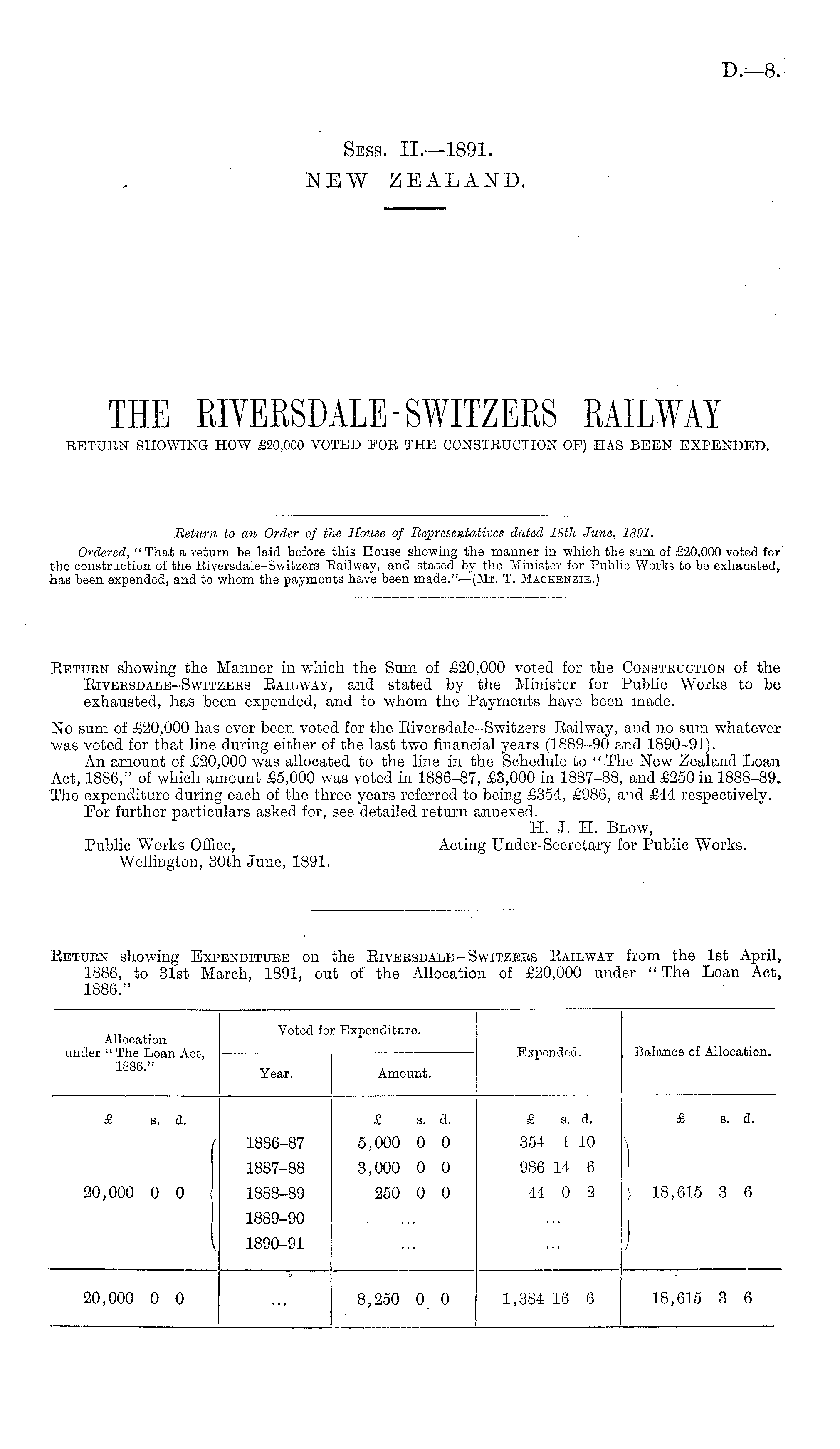 Return showing Expenditure on the Riversdale-Switzers Railway from the 1st April, 1886, to 31st March, 1891, out of the Allocation of £20,000 under "The Loan Act, 1886."