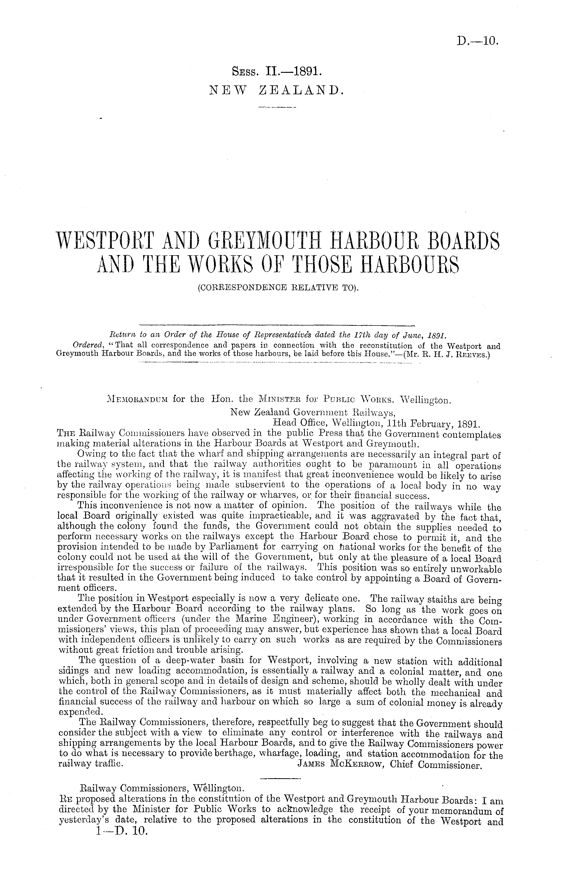 Eailway Commissioners, Wellington. Ec proposed alterations in the constitution of the Westport and Greymouth Harbour Boards: lam directed by the Minister for Public Works to acknowledge the receipt of your memorandum of yesterday's date, relative to the proposed alterations in the constitution of the Westport and I—D. 10.