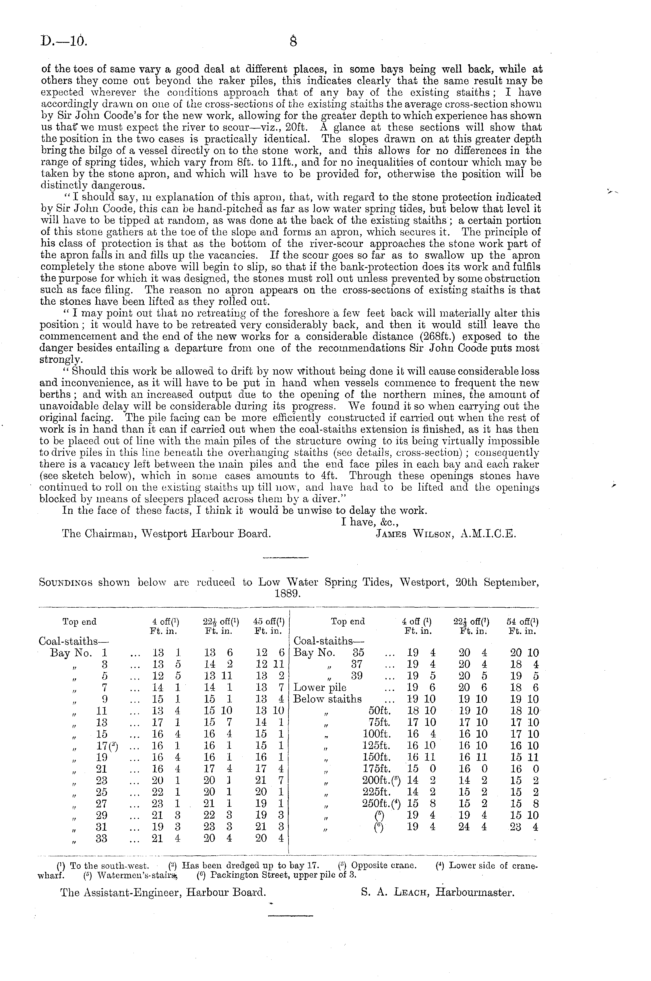 of the toes of same vary a good deal at different places, in some bays being well back, while at others they come out beyond the raker piles, this indicates clearly that the same result may be expected wherever the conditions approach that of any bay of the existing staiths ; I have accordingly drawn on one of the cross-sections of the existing staiths the average cross-section shown by Sir John Coode's for the new work, allowing for the greater depth to which experience has shown us that" we must expect the river to scour—viz., 20ft. A glance at these sections will show that the position in the two cases is practically identical. The slopes drawn on at this greater depth bring the bilge of a vessel directly on to the stone work, and this allows for no differences in the range of spring tides, which vary from Bft. to lift., and for no inequalities of contour which may be taken by the stone apron, and which will have to be provided for, otherwise the position will be distinctly dangerous. " I should say, in explanation of this apron, that, with regard to the stone protection indicated by Sir John Coode, this can be hand-pitched as far as low water spring tides, but below that level it will have to be tipped at random, as was done at the back of the existing staiths ; a certain portion of this stone gathers at the toe of the slope and forms an apron, which secures it. The principle of his class of protection is that as the bottom of the river-scour approaches the stone work part of the apron falls in and tills up the vacancies. If the scour goes so far as to swallow up the apron completely the stone above will begin to slip, so that if the bank-protection does its work and fulfils the purpose for which it was designed, the stones must roll out unless prevented by some obstruction such as face filing. The reason no apron appears on the cross-sections of existing staiths is that the stones have been lifted as they rolled out. " I may point out that no retreating of the foreshore a few feet back will materially alter this position ; it would have to be retreated very considerably back, and then it would still leave the commencement and the end of the new works for a considerable distance (268 ft.) exposed to the danger besides entailing a departure from one of the recommendations Sir John Coode puts most strongly. " Should this work be allowed to drift by now without being done it will cause considerable loss and inconvenience, as it will have to be put in hand when vessels commence to frequent the new berths; and with an increased output due to the opening of the northern mines, the amount of unavoidable delay will be considerable during its progress. We found it so when carrying out the original facing. The pile facing can be more efficiently constructed if carried out when the rest of work is in hand than it can if carried out when the eoal-staiths extension is finished, as it has then to be placed out of line with the main piles of the structure owing to its being virtually impossible to drive piles in this line beneath the overhanging staiths (see details, cross-section) ; consequently there is a vacancy left between the main piles and the end face piles in each bay and each raker (see sketch below), which in some cases amounts to 4ft. Through these openings stones have continued to roll on the existing staiths up till now, and have had to be lifted and the openings blocked by means of sleepers placed across them by a diver." In the face of these facts, I think it would be unwise to delay the work. I have, &c, The Chairman, Westport Harbour Board. Jambs Wilson, A.M.I.C.E.