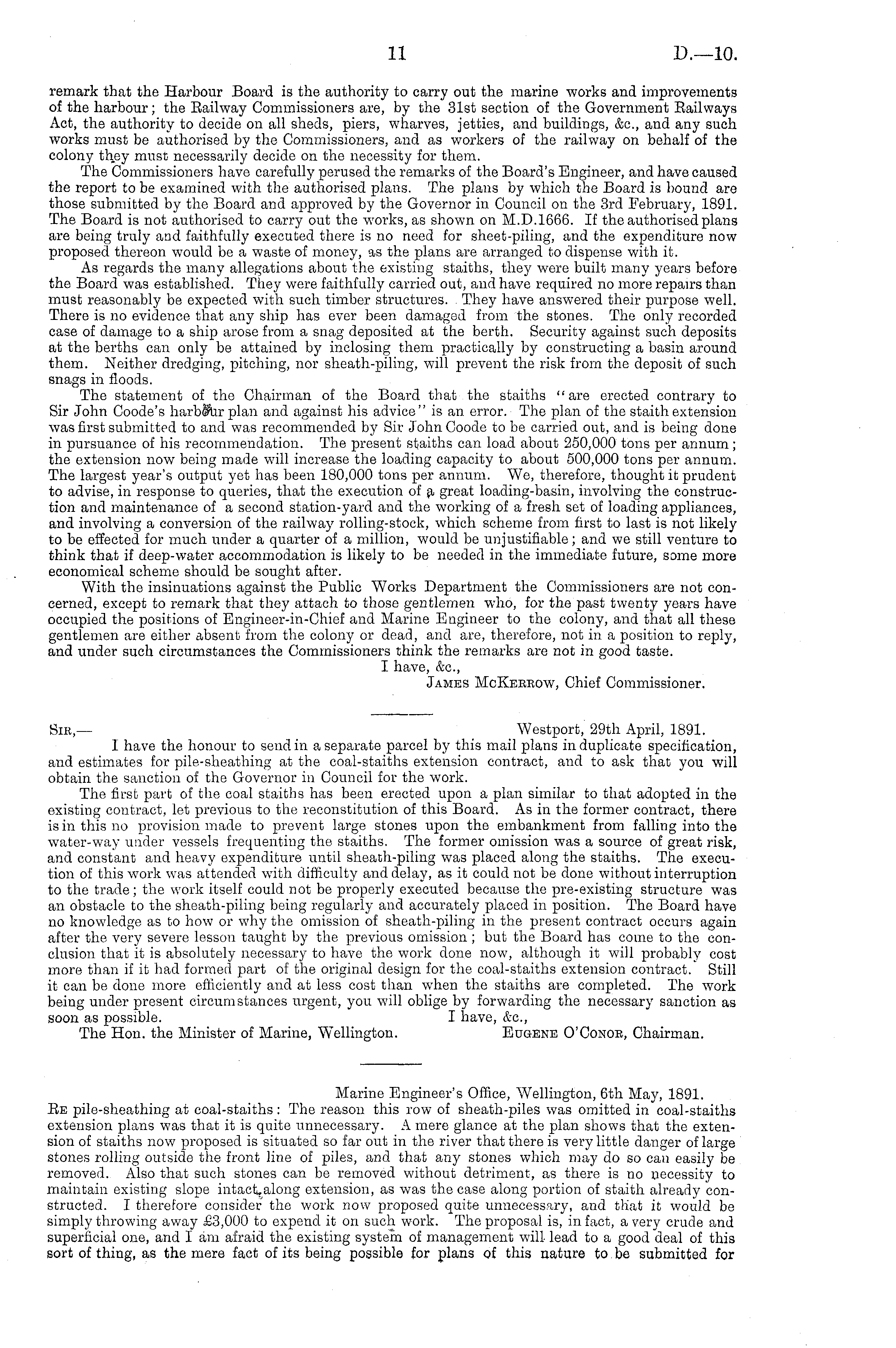 remark that the Harbour Board is the authority to carry out the marine works and improvements of the harbour; the Eailway Commissioners are, by the 31st section of the Government Eailways Act, the authority to decide on all sheds, piers, wharves, jetties, and buildings, &c, and any such works must be authorised by the Commissioners, and as workers of the railway on behalf of the colony they must necessarily decide on the necessity for them. The Commissioners have carefully perused the remarks of the Board's Engineer, and have caused the report to be examined with the authorised plans. The plans by which the Board is bound are those submitted by the Board and approved by the Governor in Council on the 3rd February, 1891. The Board is not authorised to carry out the works, as shown on M.D.1666. If the authorised plans are being truly and faithfully executed there is no need for sheet-piling, and the expenditure now proposed thereon would be a waste of money, as the plans are arranged to dispense with it. As regards the many allegations about the existing staiths, they were built many years before the Board was established. They were faithfully carried out, and have required no more repairs than must reasonably be expected with such timber structures. . They have answered their purpose well. There is no evidence that any ship has ever been damaged from the stones. The only recorded case of damage to a ship arose from a snag deposited at the berth. Security against such deposits at the berths can only be attained by inclosing them practically by constructing a basin around them. Neither dredging, pitching, nor sheath-piling, will prevent the risk from the deposit of such snags in floods. The statement of the Chairman of the Board that the staiths "are erected contrary to Sir John Coode's harbfbr plan and against his advice" is an error. The plan of the staithextension was first submitted to and was recommended by Sir John Coode to be carried out, and is being done in pursuance of his recommendation. The present staiths can load about 250,000 tons per annum; the extension now being made will increase the loading capacity to about 500,000 tons per annum. The largest year's output yet has been 180,000 tons per annum. We, therefore, thought it prudent to advise, in response to queries, that the execution of a great loading-basin, involving the construction and maintenance of a second station-yard and the working of a fresh set of loading appliances, and involving a conversion of the railway rolling-stock, which scheme from first to last is not likely to be effected for much under a quarter of a million, would be unjustifiable; and we still venture to think that if deep-water accommodation is likely to be needed in the immediate future, some more economical scheme should be sought after. With the insinuations against the Public Works Department the Commissioners are not concerned, except to remark that they attach to those gentlemen who, for the past twenty years have occupied the positions of Engineer-in-Chief and Marine Engineer to the colony, and that all these gentlemen are either absent from the colony or dead, and are, therefore, not in a position to reply, and under such circumstances the Commissioners think the remarks are not in good taste. I have, &c, James McKeeeow, Chief Commissioner.