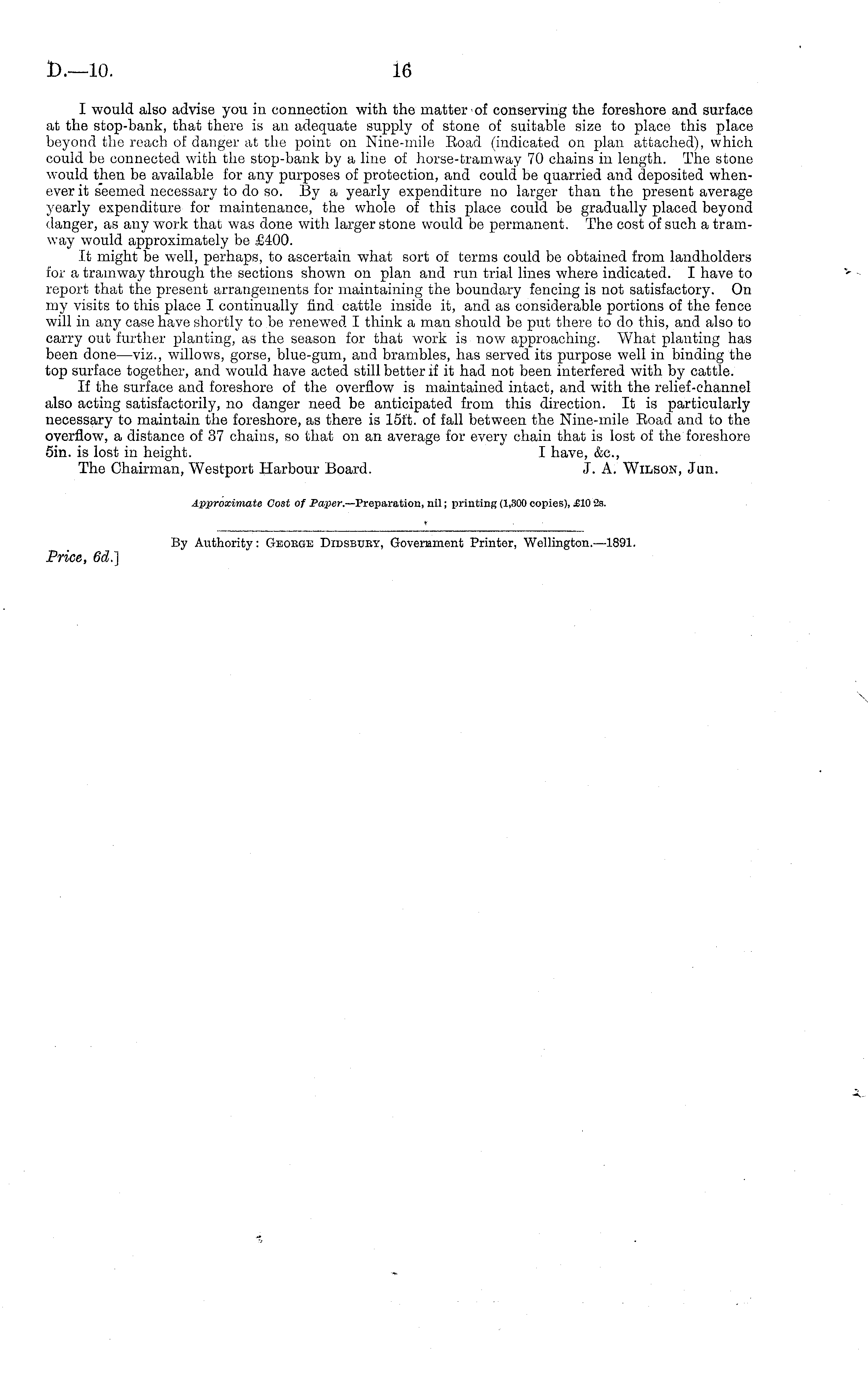 I would also advise you in connection with the matter of conserving the foreshore and surface at the stop-bank, that there is an adequate supply of stone of suitable size to place this place beyond the reach of danger at the point on Nine-mile Road (indicated on plan attached), which could be connected with the stop-bank by a line of horse-tramway 70 chains in length. The stone would then be available for any purposes of protection, and could be quarried and deposited whenever it seemed necessary to do so. By a yearly expenditure no larger than the present average yearly expenditure for maintenance, the whole of this place could be gradually placed beyond danger, as any work that was done with larger stone would be permanent. The cost of such a tramway would approximately be £400. It might be well, perhaps, to ascertain what sort of terms could be obtained from landholders for a tramway through the sections shown on plan and run trial lines where indicated. I have to report that the present arrangements for maintaining the boundary fencing is not satisfactory. On my visits to this place I continually find cattle inside it, and as considerable portions of the fence will in any case have shortly to be renewed I think a man should be put there to do this, and also to carry out further planting, as the season for that work is now approaching. What planting has been done—viz., willows, gorse, blue-gum, and brambles, has served its purpose well in binding the top surface together, and would have acted still better if it had not been, interfered with by cattle. If the surface and foreshore of the overflow is maintained intact, and with the relief-channel also acting satisfactorily, no danger need be anticipated from this direction. It is particularly necessary to maintain the foreshore, as there is 15ft. of fall between the Nine-mile Road and to the overflow, a distance of 37 chains, so that on an average for every chain that is lost of the foreshore sin. is lost in height. I have, &c, The Chairman, Westport Harbour Board. J. A. Wilson, Jun.