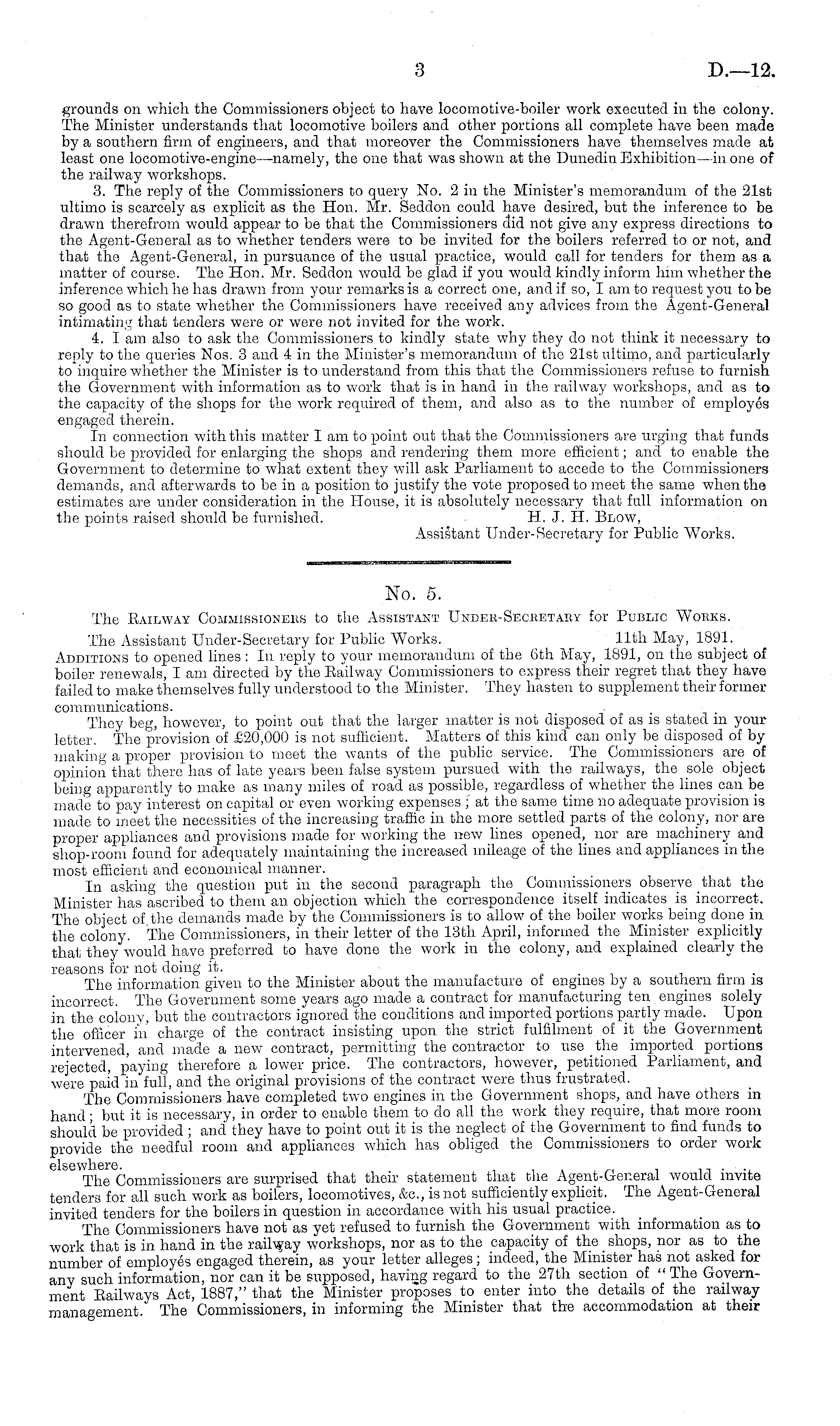 grounds on which the Commissioners object to have locomotive-boiler work executed in the colony. The Minister understands that locomotive boilers and other portions all complete have been made by a southern firm of engineers, and that moreover the Commissioners have themselves made at least one locomotive-engine—namely, the one that was shown at the Dunedin Exhibition—in one of the railway workshops. 3. The reply of the Commissioners to query No. 2 in the Minister's memorandum of the 21st ultimo is scarcely as explicit as the Hon. Mr. Seddon could have desired, but the inference to be drawn therefrom would appear to be that the Commissioners rlid not give any express directions to the Agent-General as to whether tenders were to be invited for the boilers referred to or not, and that the Agent-General, in pursuance of the usual practice, would call for tenders for them as a matter of course. The Hon. Mr. Seddon would be glad if you would kindly inform him whether the inference which he has drawn from your remarks is a correct one, and if so, I am to request you to be so good as to state whether the Commissioners have received any advices from the Agent-General intimating that tenders were or were not invited for the work. 4. I am also to ask the Commissioners to kindly state why they do not think it necessary to reply to the queries Nos. 3 and 4 in the Minister's memorandum of the 21st ultimo, and particularly to inquire whether the Minister is to understand from this that the Commissioners refuse to furnish the Government with information as to work that is in hand in the railway workshops, and as to the capacity of the shops for the work required of them, and also as to the number of employes engaged therein. In connection with this matter I am to point out that the Commissioners are urging that funds should be provided for enlarging the shops and rendering them more efficient; and to enable the Government to determine to what extent they will ask Parliament to accede to the Commissioners demands, and afterwards to be in a position to justify the vote proposed to meet the same when the estimates are under consideration in the House, it is absolutely necessary that full information on the points raised should be furnished. H. J. H. Blow, Assistant Under-Secretary for Public Works.