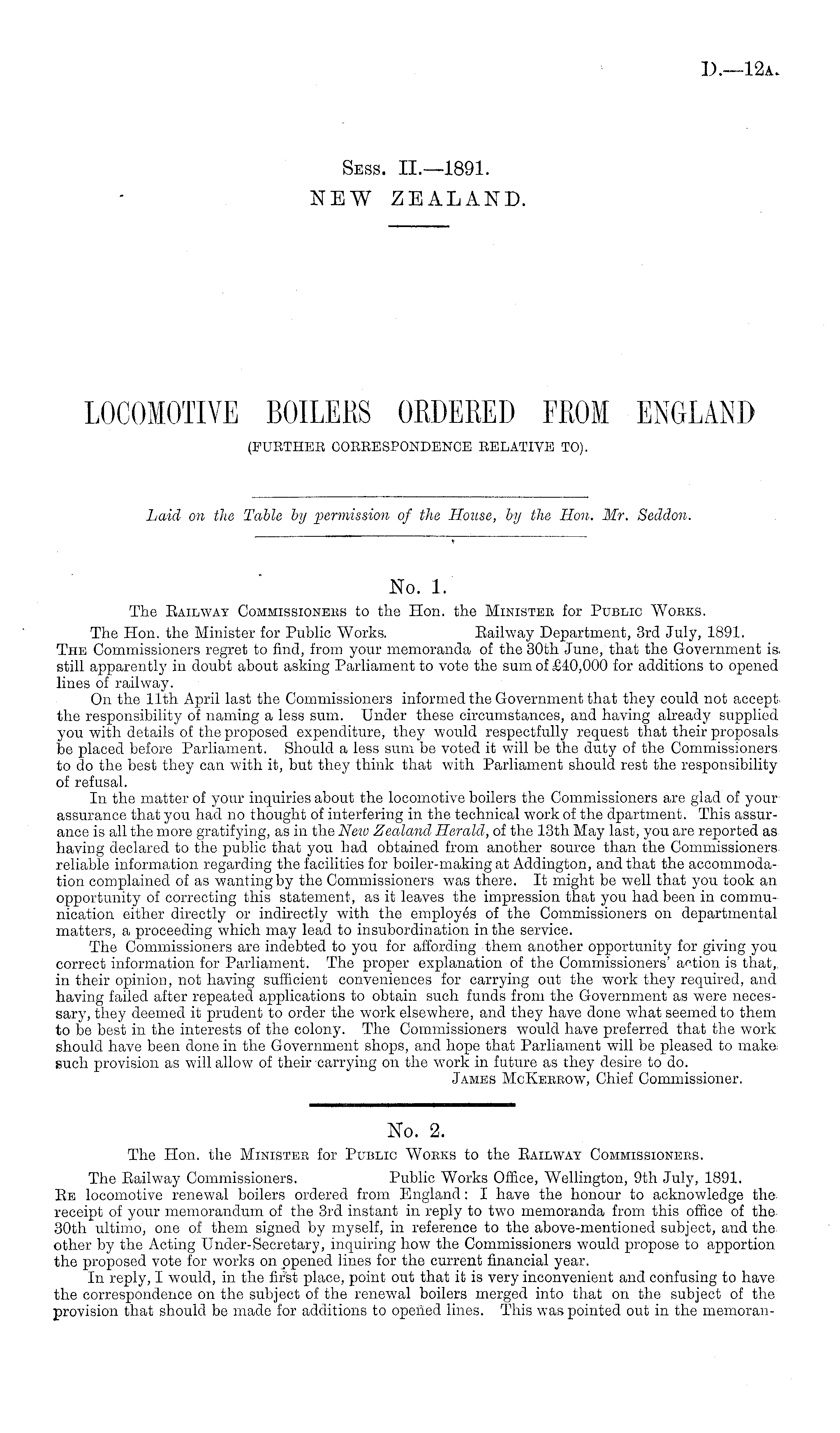 No. 1. The Eailway Commissioners to the Hon. the Minister for Public Woeks. The Hon. the Minister for Public Works. Eailway Department, 3rd July, 1891. The Commissioners regret to find, from your memoranda of the 30th June, that the Government is. still apparently in doubt about asking Parliament to vote the sum of £40,000 for additions to opened lines of railway. On the 11th April last the Commissioners informed the Government that they could not accept, the responsibility of naming a less sum. Under these circumstances, and having already supplied you with details of the proposed expenditure, they would respectfully request that their proposals be placed before Parliament. Should a less sum be voted it will be the duty of the Commissioners to do the best they can with it, but they think that with Parliament should rest the responsibility of refusal. In the matter of your inquiries about the locomotive boilers the Commissioners are glad of your assurance that you had no thought of interfering in the technical work of the dpartment. This assurance is all the more gratifying, as in the New Zealand Herald, of the 13th May last, you are reported as having declared to the public that you had obtained from another source than the Commissioners, reliable information regarding the facilities for boiler-making at Addington, and that the accommodation complained of as wanting by the Commissioners was there. It might be well that you took an opportunity of correcting this statement, as it leaves the impression that you had been in communication either directly or indirectly with the employes of the Commissioners on departmental matters, a proceeding which may lead to insubordination in the service. The Commissioners are indebted to you for affording them another opportunity for giving you correct information for Parliament. The proper explanation of the Commissioners' action is that,, in their opinion, not having sufficient conveniences for carrying out the work they required, and having failed after repeated applications to obtain such funds from the Government as were necessary, they deemed it prudent to order the work elsewhere, and they have done what seemed to them to be best in the interests of the colony. The Commissioners would have preferred that the work should have been done in the Government shops, and hope that Parliament will be pleased to mak& such provision as will allow of their carrying on the work in future as they desire to do. James McKeeeow, Chief Commissioner.