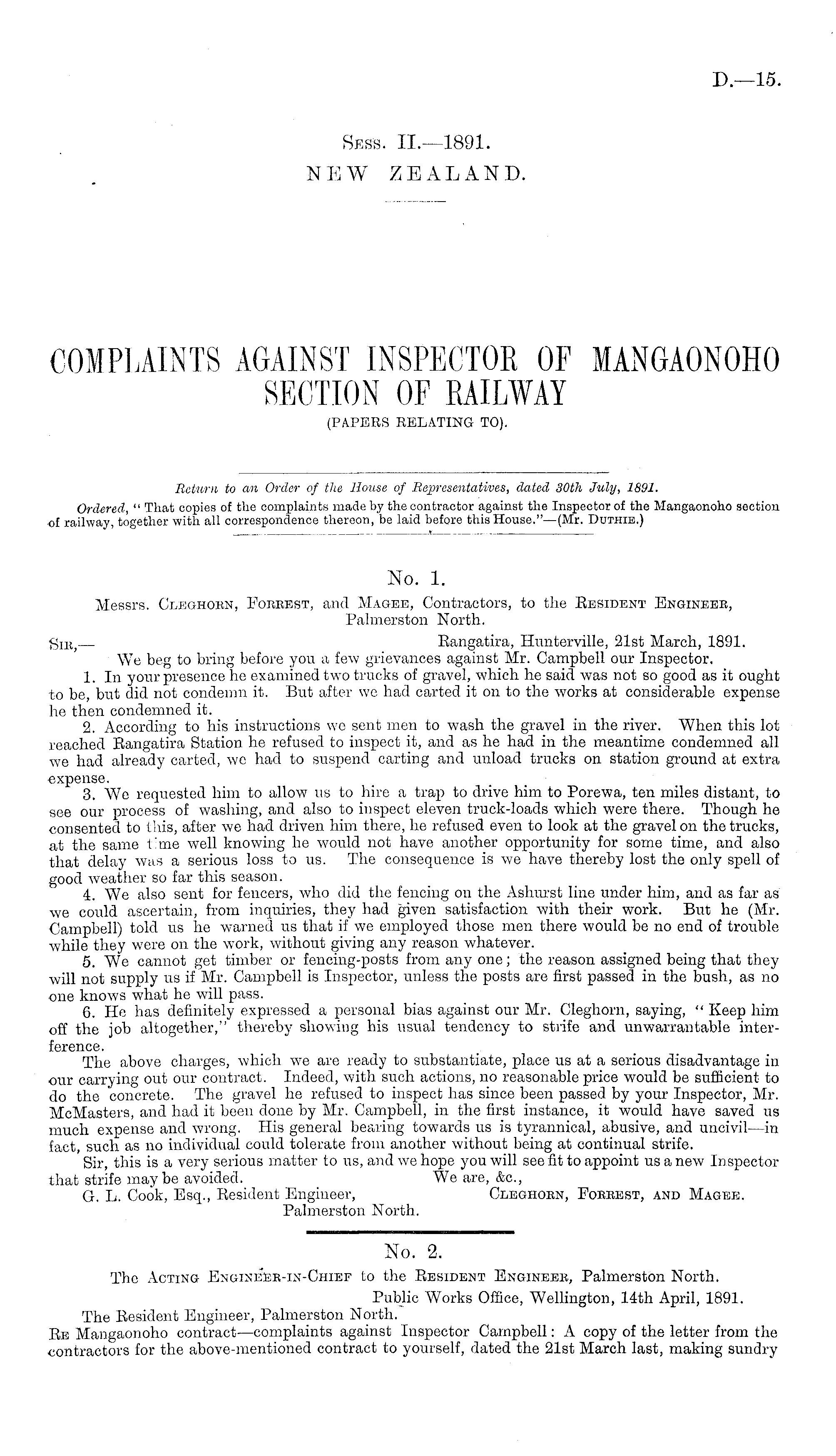 No. 1. Messrs. Clbghokn, Forrest, and Magee, Contractors, to the Eesident Engineer, Palmerston North. g IBj Bangatira, Himterville, 21st March, 1891. We beg to bring before you a few grievances against Mr. Campbell our Inspector. 1. In your presence he examined two trucks of gravel, which he said was not so good as it ought to be, but did not condemn it. But after we had carted it on to the works at considerable expense he then condemned it. 2. According to his instructions we sent men to wash the gravel in the river. When this lot reached Eangatira Station he refused to inspect it, and as he had in the meantime condemned all we had already carted, we had to suspend carting and unload trucks on station ground at extra expense. 3. We requested him to allow us to hire a trap to drive him to Porewa, ten miles distant, to see our process of washing, and also to inspect eleven truck-loads which were there. Though he consented to this, after we had driven him there, he refused even to look at the gravel on the trucks, at the same time well knowing he would not have another opportunity for some time, and also that delay was a serious loss to us. The consequence is we have thereby lost the only spell of good weather so far this season. 4. We also sent for fencers, who did the fencing on the Ashurst line under him, and as far as we could ascertain, from inquiries, they had given satisfaction with their work. But he (Mr. Campbell) told us he warned us that if we employed those men there would be no end of trouble while they were on the work, without giving any reason whatever. 5. We cannot get timber or fencing-posts from any one; the reason assigned being that they will not supply us if Mr. Campbell is Inspector, unless the posts are first passed in the bush, as no one knows what he will pass. 6. He has definitely expressed a personal bias against our Mr. Cleghorn, saying, " Keep him off the job altogether," thereby showing his usual tendency to strife and unwarrantable interference. The above charges, which we are ready to substantiate, place us at a serious disadvantage in our carrying out our contract. Indeed, with such actions, no reasonable price would be sufficient to do the concrete. The gravel he refused to inspect has since been passed by your Inspector, Mr. McMasters, and had it been done by Mr. Campbell, in the first instance, it would have saved us much expense and wrong. His general bearing towards us is tyrannical, abusive, and uncivil—in fact, such as no individual could tolerate from another without being at continual strife. Sir, this is a very serious matter to us, and we hope you will see fit to appoint us a new Inspector that strife maybe avoided. We are, &c, G. L. Cook, Esq., Eesident Engineer, Cleghorn, Forrest, and Magee. Palmerston North.