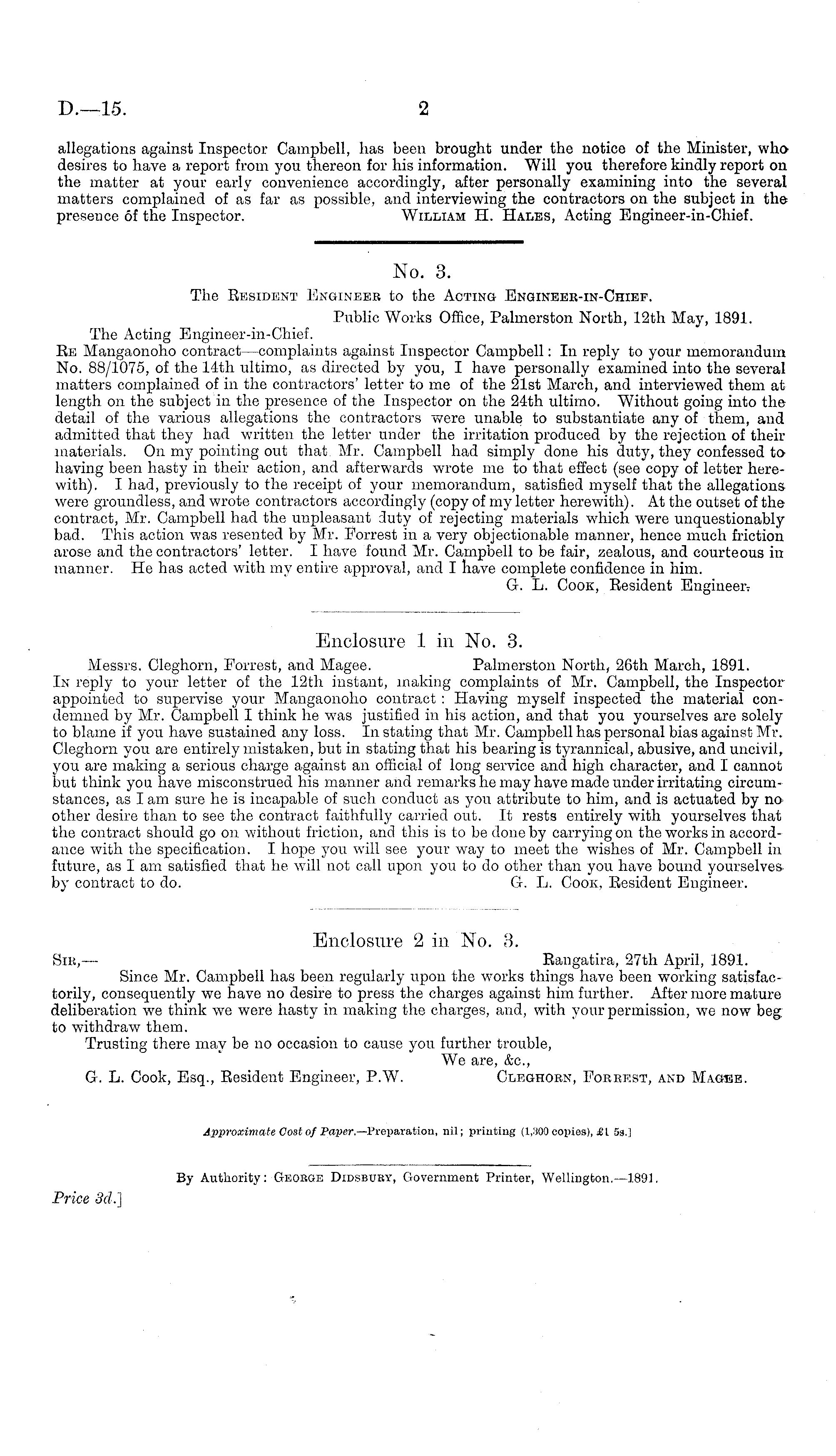 No. 3. The Resident Engineer to the Acting Engineee-in-Chief. Public Works Office, Palmerston North, 12th May, 1891. The Acting Engineer-in-Chief. Be Mangaonoho contract—complaints against Inspector Campbell: In reply to your memorandum No. 88/1075, of the 14th ultimo, as directed by you, I have personally examined into the several matters complained of in the contractors' letter to me of the 21st March, and interviewed them at length on the subject in the presence of the Inspector on the 24th ultimo. Without going into the detail of the various allegations the contractors were unable to substantiate any of them, and admitted that they had written the letter under the irritation produced by the rejection of their materials. On my pointing out that Mr. Campbell had simply done his duty, they confessed tohaving been hasty in their action, and afterwards wrote me to that effect (see copy of letter herewith). I had, previously to the receipt of your memorandum, satisfied myself that the allegations were groundless, and wrote contractors accordingly (copy of my letter herewith). At the outset of the contract, Mr. Campbell had the unpleasant duty of rejecting materials which were unquestionably bad. This action was resented by Mr. Forrest in a very objectionable manner, hence much friction arose and the contractors' letter. I have found Mr. Campbell to be fair, zealous, and courteous in manner. He has acted with my entire approval, and I have complete confidence in him. G. L. Cook, Eesident Engineer;