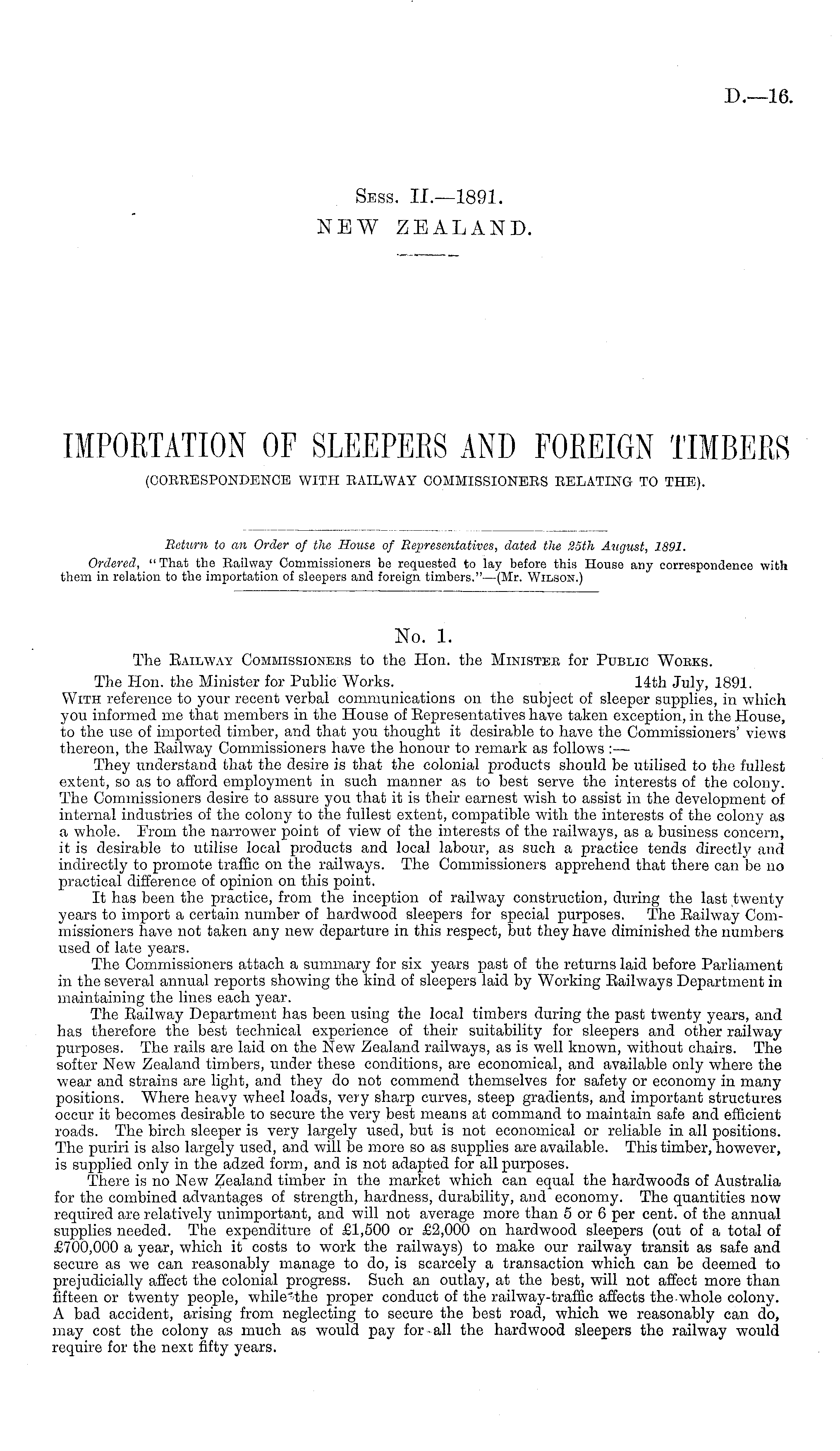 No. 1. The Eailway Commissionebs to the Hon. the Ministeb for Public Wobks. The Hon. the Minister for Public Works. 14th July, 1891. With reference to your recent verbal communications on the subject of sleeper supplies, in which you informed me that members in the House of Representatives have taken exception, in the House, to the use of imported timber, and that you thought it desirable to have the Commissioners' views thereon, the Eailway Commissioners have the honour to remark as follows : — They understand that the desire is that the colonial products should be utilised to the fullest extent, so as to afford employment in such manner as to best serve the interests of the colony. The Commissioners desire to assure you that it is their earnest wish to assist in the development of internal industries of the colony to the fullest extent, compatible with the interests of the colony as a whole. From the narrower point of view of the interests of the railways, as a business concern, it is desirable to utilise local products and local labour, as such a practice tends directly and indirectly to promote traffic on the railways. The Commissioners apprehend that there can be no practical difference of opinion on this point. It has been the practice, from the inception of railway construction, during the last twenty years to import a certain number of hardwood sleepers for special purposes. The Eailway Commissioners have not taken any new departure in this respect, but they have diminished the numbers used of late years. The Commissioners attach a summary for six years past of the returns laid before Parliament in the several annual reports showing the kind of sleepers laid by Working Railways Department in maintaining the lines each year. The Eailway Department has been using the local timbers during the past twenty years, and has therefore the best technical experience of their suitability for sleepers and other railway purposes. The rails are laid on the New Zealand railways, as is well known, without chairs. The softer New Zealand timbers, under these conditions, are economical, and available only where the wear and strains are light, and they do not commend themselves for safety or economy in many positions. Where heavy wheel loads, very sharp curves, steep gradients, and important structures occur it becomes desirable to secure the very best means at command to maintain safe and efficient roads. The birch sleeper is very largely used, but is not economical or reliable in all positions. The puriri is also largely used, and will be more so as supplies are available. This timber, however, is supplied only in the adzed form, and is not adapted for all purposes. There is no New Zealand timber in the market which can equal the hardwoods of Australia for the combined advantages of strength, hardness, durability, and economy. The quantities now required are relatively unimportant, and will not average more than 5 or 6 per cent, of the annual supplies needed. The expenditure of £1,500 or £2,000 on hardwood sleepers (out of a total of £700,000 a year, which it costs to work the railways) to make our railway transit as safe and secure as we can reasonably manage to do, is scarcely a transaction which can be deemed to prejudicially affect the colonial progress. Such an outlay, at the best, will not affect more than fifteen or twenty people, while'the proper conduct of the railway-traffic affects the whole colony. A bad accident, arising from neglecting to secure the best road, which we reasonably can do, may cost the colony as much as would pay for all the hardwood sleepers the railway would require for the next fifty years.