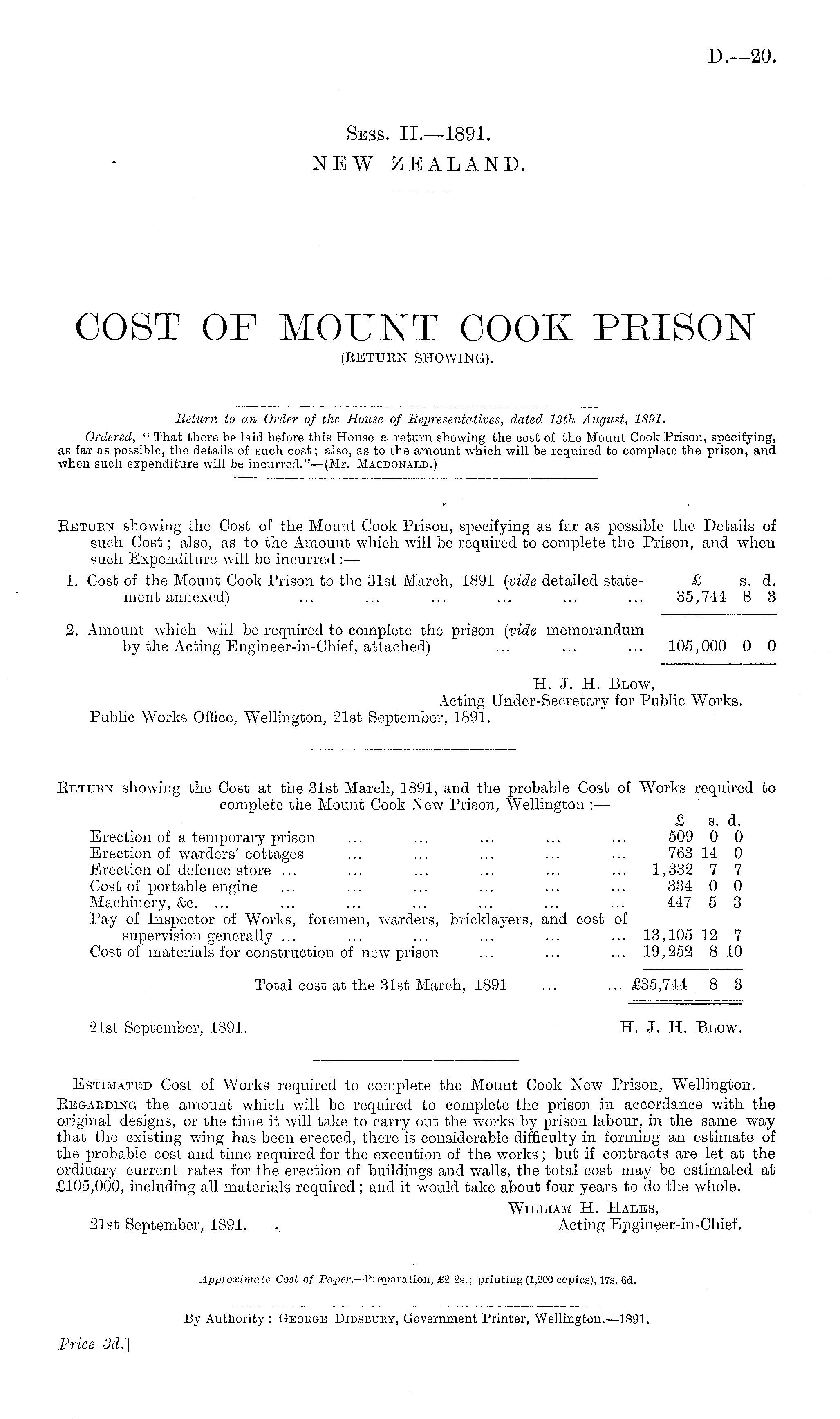 Estimated Cost of Works required to complete the Mount Cook New Prison, Wellington. Regabding the amount which will be required to complete the prison in accordance with the original designs, or the time it will take to carry out the works by prison labour, in the same way that the existing wing has been erected, there is considerable difficulty in forming an estimate of the probable cost and time required for the execution of the works; but if contracts are let at the ordinary current rates for the erection of buildings and walls, the total cost may be estimated at £105,000, including all materials required; and it would take about four years to do the whole. William H. Hales, 21st September, 1891. % Acting Ejigineer-in-Chief. Approximate Cost of Paper.—Preparation, £■! 25.; printing (1,200 copies), 17s. 6d.