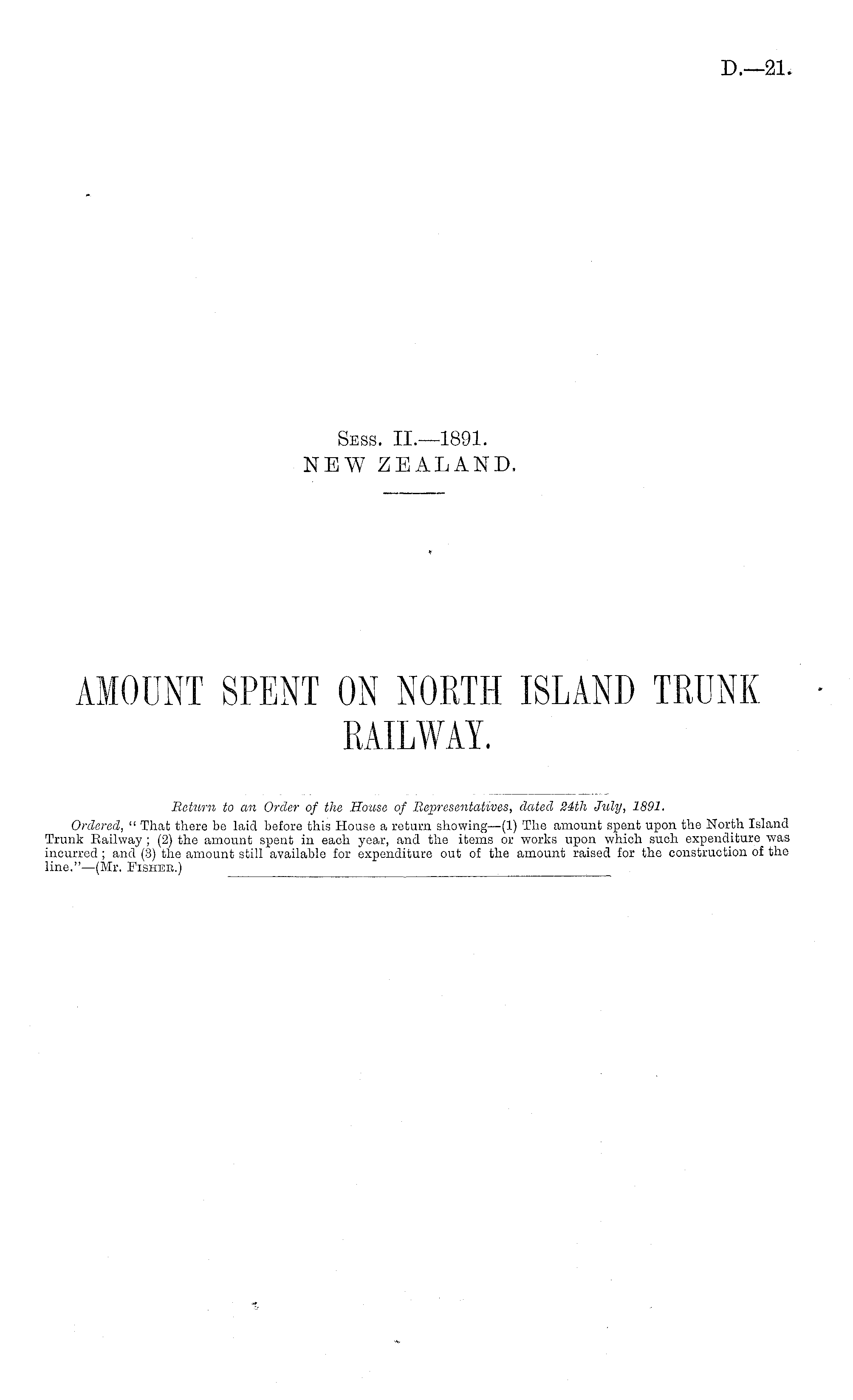 Return to an Order of the House of Representatives, dated 34th July, 1891. Ordered, " That there be laid before this House a return showing—(l) The amount spent upon the North Island Trunk Railway ; (2) the amount spent in each year, and the items or works upon which such expenditure was incurred ; and (3) the amount still available for expenditure out of the amount raised for the construction of the line." —(Mr. Pisheb.)