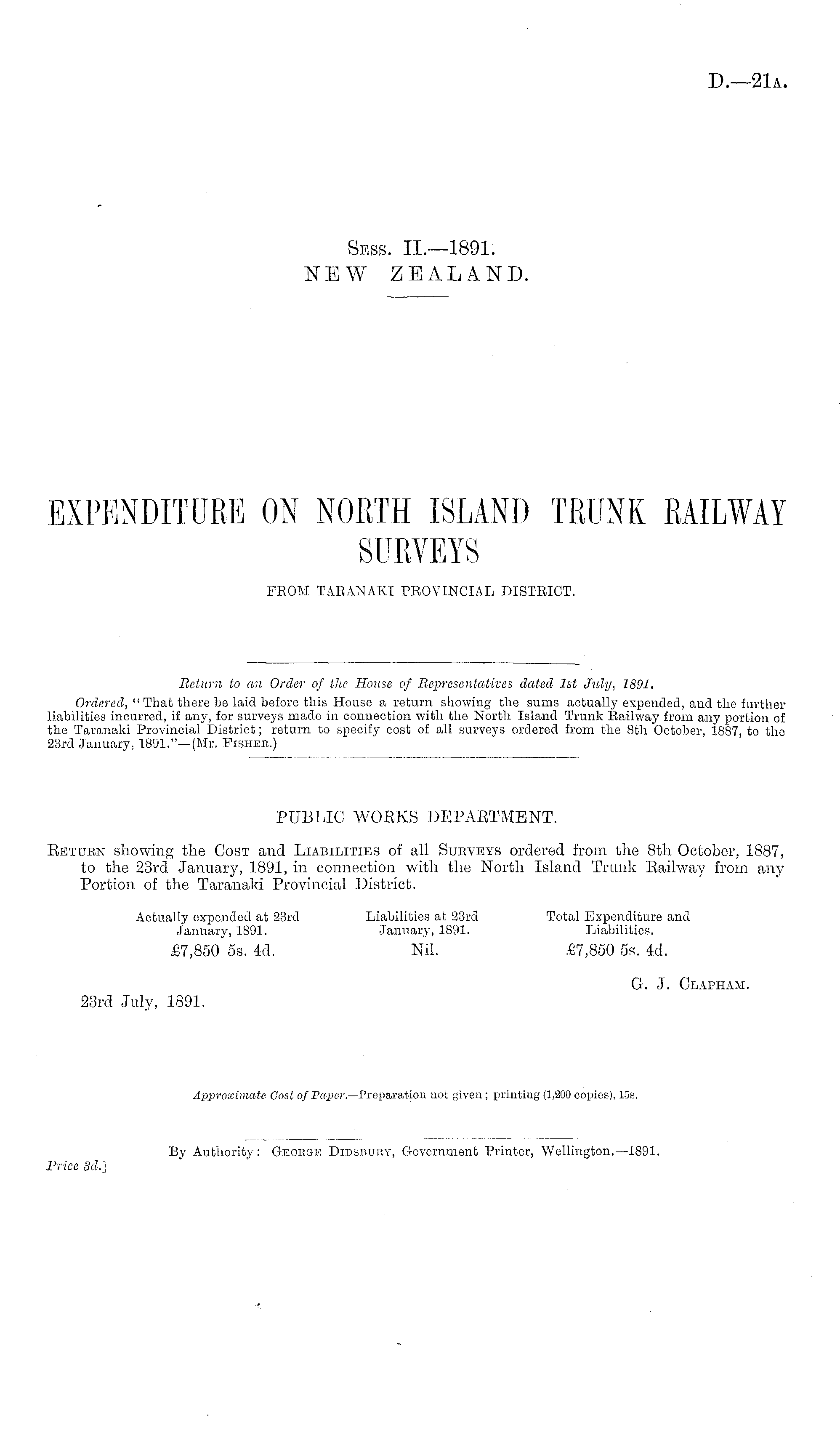 PUBLIC WOEKS DEPAETMENT. Eetukn showing the Cost and Liabilities of all Sukveys ordered from the Bth October, 1887, to the 23rd January, 1891, in connection with the North Island Trunk Eailway from any Portion of the Taranaki Provincial District. Actually expended at 23rd Liabilities at 23rd Total Expenditure and January, 1891. January, 1891. Liabilities. £7,850 ss. 4d. Nil. £7,850 ss. 4d. G. J. Olapham. 23rd July, 1891. Approximate Cost of Paper. —Preparation not given; printing (1,200 copies), 15s.