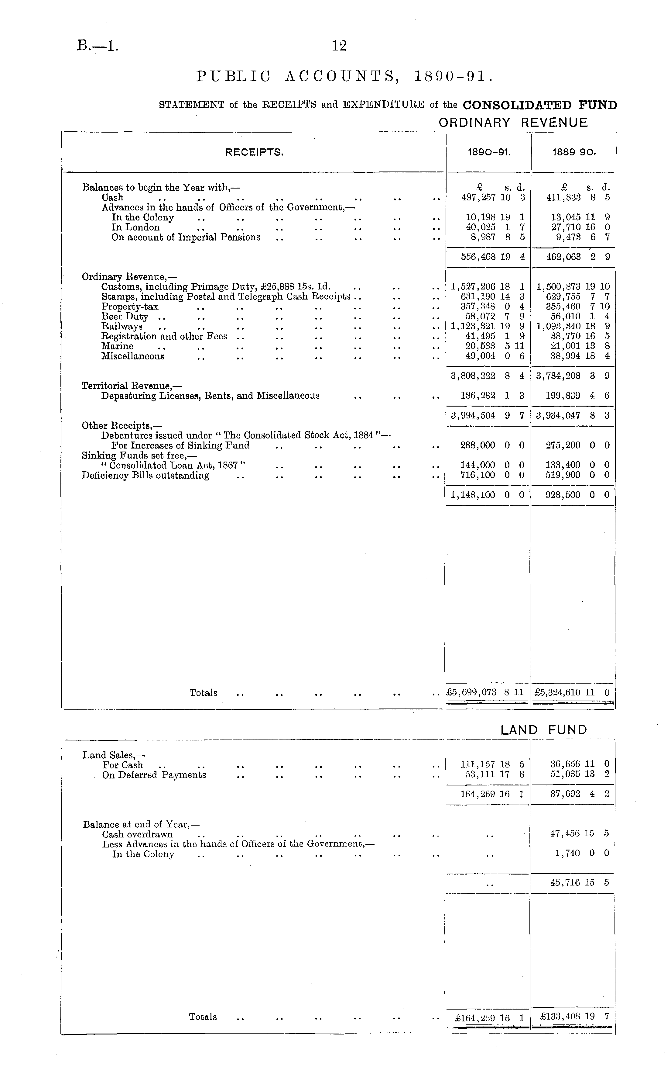 RECEIPTS. 1890-91. 1889-9O. Balances to begin the Year with, — Cash Advances in the hands of Officers of the Government, — In the Colony In London On account of Imperial Pensions £ s. d. 497,257 10 3 10,198 19 1 40,025 1 7 8,987 8 5 £ s. d. 411,833 8 5 13,045 11 9 27,710 16 0 9,473 6 7 556,468 19 4 462,063 2 9 Ordinary Revenue, — Customs, including Primage Duty, £25,888 15s. Id. Stamps, including Postal and Telegraph Cash Receipts Property-tax Beer Duty Railways Registration and other Fees Marine Miscellaneous 1,527,206 18 1 631,190 14 3 357,348 0 4 58,072 7 9 1,123,321 19 9 41,495 1 9 20,583 5 11 49,004 0 6 1,500,873 19 10 629,755 7 7 355,460 7 10 56,010 1 4 1,093,340 18 9 38,770 16 5 21,001 13 8 38,994 18 4 Territorial Revenue, — Depasturing Licenses, Rents, and Miscellaneous 3,808,222 8 4 186,282 1 3 3,734,208 3 9 199,839 4 6 Other Receipts,— Debentures issued under " The Consolidated Stock Act, 1884 " — For Increases of Sinking Fund .. ... Sinking Funds set free, — " Consolidated Loan Act, 1867 " Deficiency Bills outstanding 3,994,504 9 7 288,000 0 0 144,000 0 0 716,100 0 0 3,934,047 8 3 275,200 0 0 133,400 0 0 519,900 0 0 1,148,100 0 0 928,500 0 0 Totals £5,099,073 8 11 £5,324,610 11 0 LAN! FUND Land Sales, —■ For Cash On Deferred Payments 111,157 18 5 53,111 17 8 36,656 11 0 51,035 13 2 164,269 16 1 87,692 4 2 Balance at end of Year, — Gash overdrawn Less Advances in the hands of Officers of the Government, — In the Colony 47,456 15 5 1,740 0 0 45,716 15 5 Totals £164,269 16 1 £133,408 19 7
