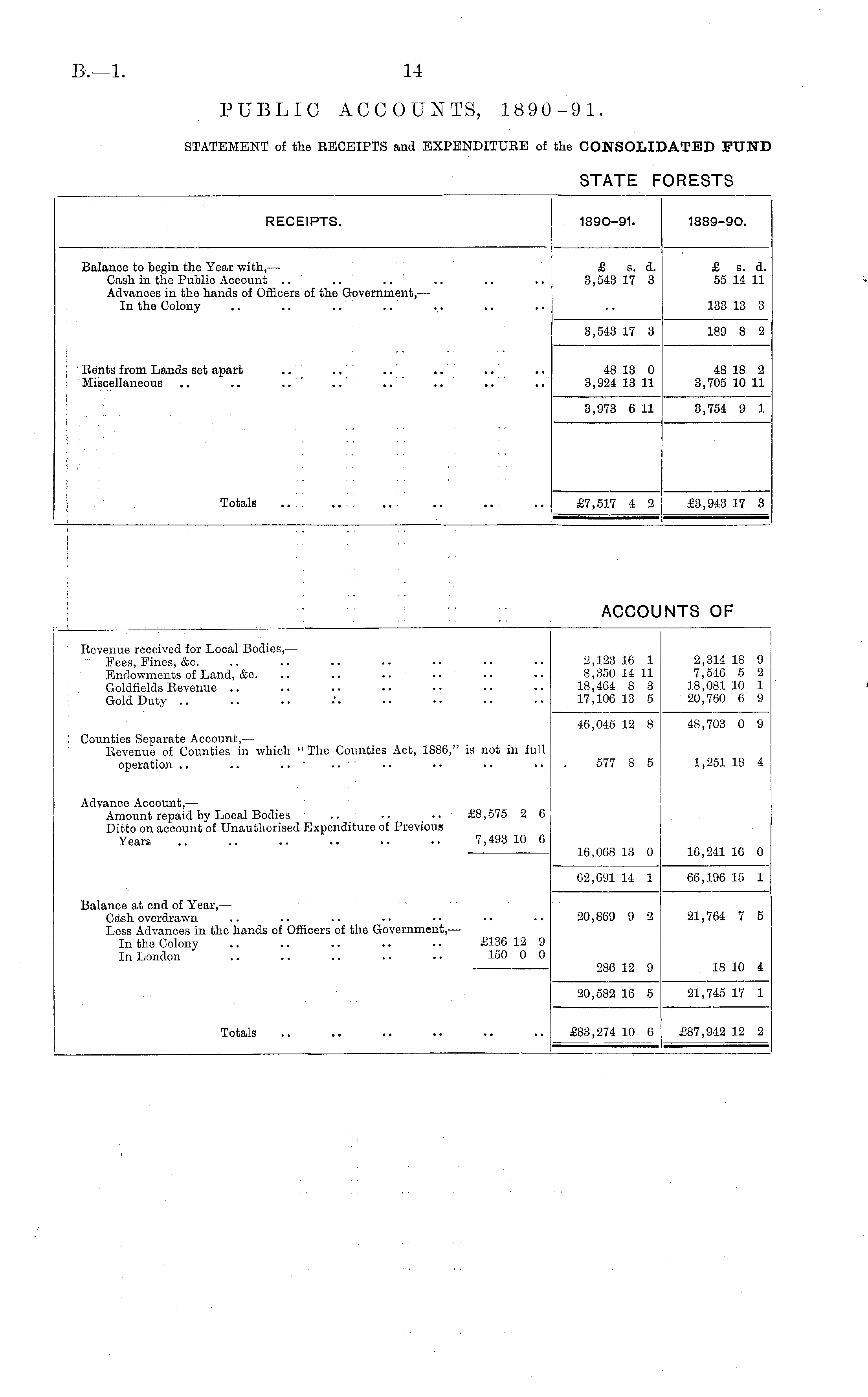 RECEIPTS. 1890-91. 1889-9O. Balance to begin the Year with, — Cash in the Public Account .. .. Advances in the hands of Officers of the Government, — In the Colony £ s. d. 3,543 17 3 & s. a. 55 14 11 133 13 3 3,543 17 3 189 8 2 Rents from Lands set apart .. .. ..' Miscellaneous .. .. .. ' .. 48 13 0 3,924 13 11 48 18 2 3,705 10 11 3,754 9 1 3,973 6 11 Totals ... £7,517 4 2 £3,943 17 3 ACCO NTS OF Revenue received for Local Bodies, — Fees, Fines, &c. Endowments of Land, &c. Goldfields Revenue Gold Duty .. 2,123 16 1 8,350 14 11 18,464 8 3 17,106 13 5 2,314 18 9 7,546 5 2 18,081 10 1 20,760 6 9 ' Counties Separate Account, — Revenue of Counties in which " The Counties Act, 1886," is not in full operation .. .. .. ■ 46,045 12 8 48,703 0 9 577 8 5 1,251 18 4 Advance Account, — Amount repaid by Local Bodies .. .. .. £8,575 2 6 Ditto on account of Unauthorised Expenditure of Previous Years 7,493 10 6 16,068 13 0 16,241 16 0 Balance at end of Year, — Cash overdrawn Less Advances in the hands of Officers of the Government,— In the Colony .. .. .. .. . ■ £130 12 9 In London .. .. .. .. •• 150 0 0 62,691 14 1 66,196 15 1 20,869 9 2 21,764 7 5 286 12 9 18 10 4 20,582 16 5 21,745 17 1 Totals £83,274 10 6 £87,942 12 2