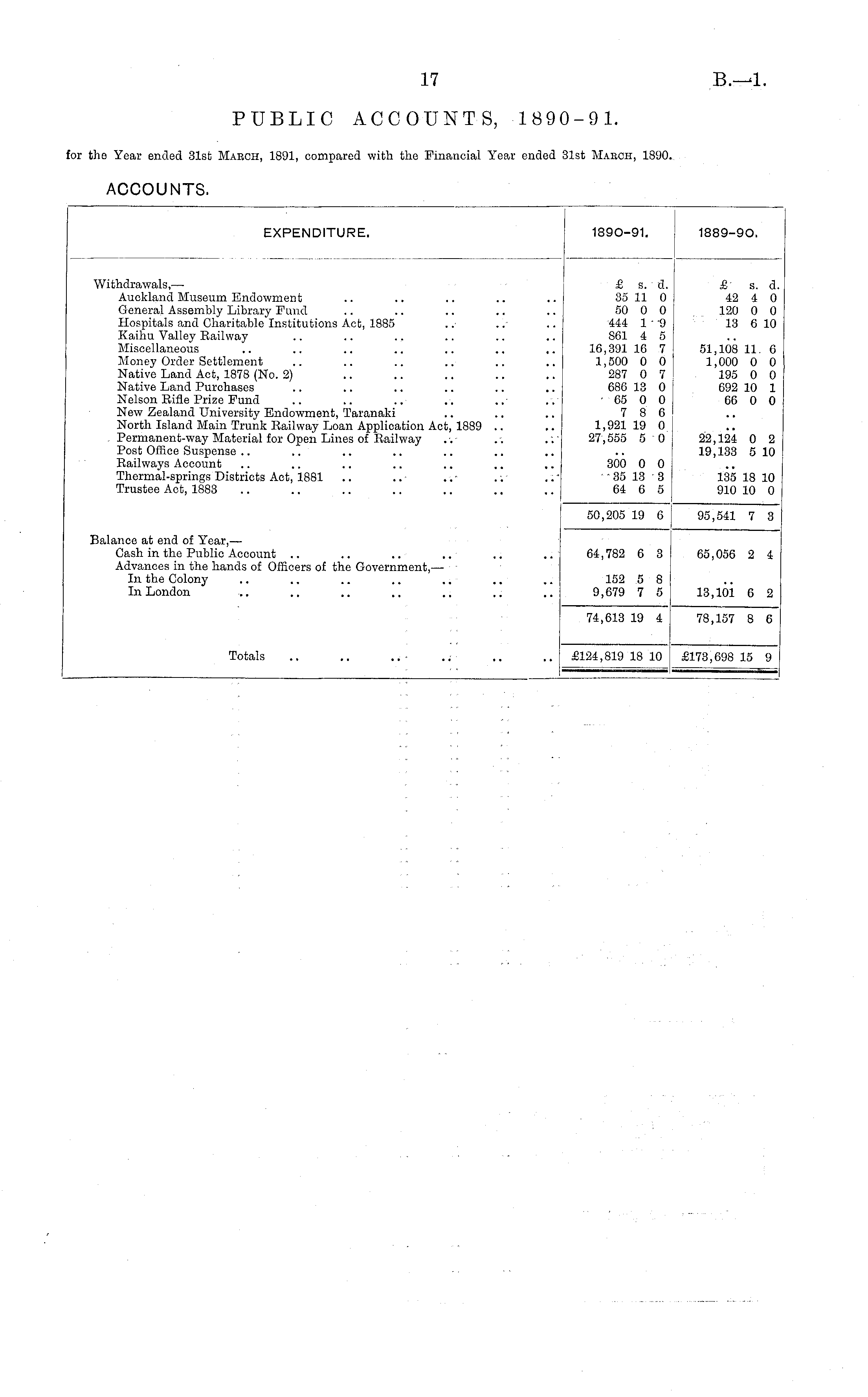EXPENDITURE. 189O-91. 1889-90. Withdrawals, — Auckland Museum Endowment General Assembly Library Fund Hospitals and Charitable Institutions Act, 1885 Kaihu Valley Railway Miscellaneous Money Order Settlement Native Land Act, 1878 (No. 2) Native Land Purchases Nelson Rifle Prize Fund New Zealand University Endowment, Taranaki North Island Main Trunk Railway Loan Application Act, 1889 .. Permanent-way Material for Open Lines of Railway Post Office Suspense Railways Account Thermal-springs Districts Act, 1881 Trustee Act, 1883 & s. a. 35 11 0 50 0 0 444 1• 9 861 4 5 16,391 16 7 1,500 0 0 287 0 7 686 13 0 65 0 0 7 8 6 1,921 19 0 27,555 5 0 £ s. a, 42 4 0 120 0 0 13 6 10 51,108 11. G 1,000 0 0 195 0 0 692 10 1 66 0 0 22,124 0 2 19,133 5 10 300 0 0 35 13 3 64 6 5 135 18 10 910 10 0 50,205 19 6 95,541 7 3 Balance at end of Year, — Cash in the Public Account Advances in the hands of Officers of the Government, — In the Colony In London 64,782 6 3 65,056 2 4 152 5 8 9,679 7 5 13,101 6 2 74,613 19 4 78,157 8 6 Totals £124,819 18 10 £173,698 15 9