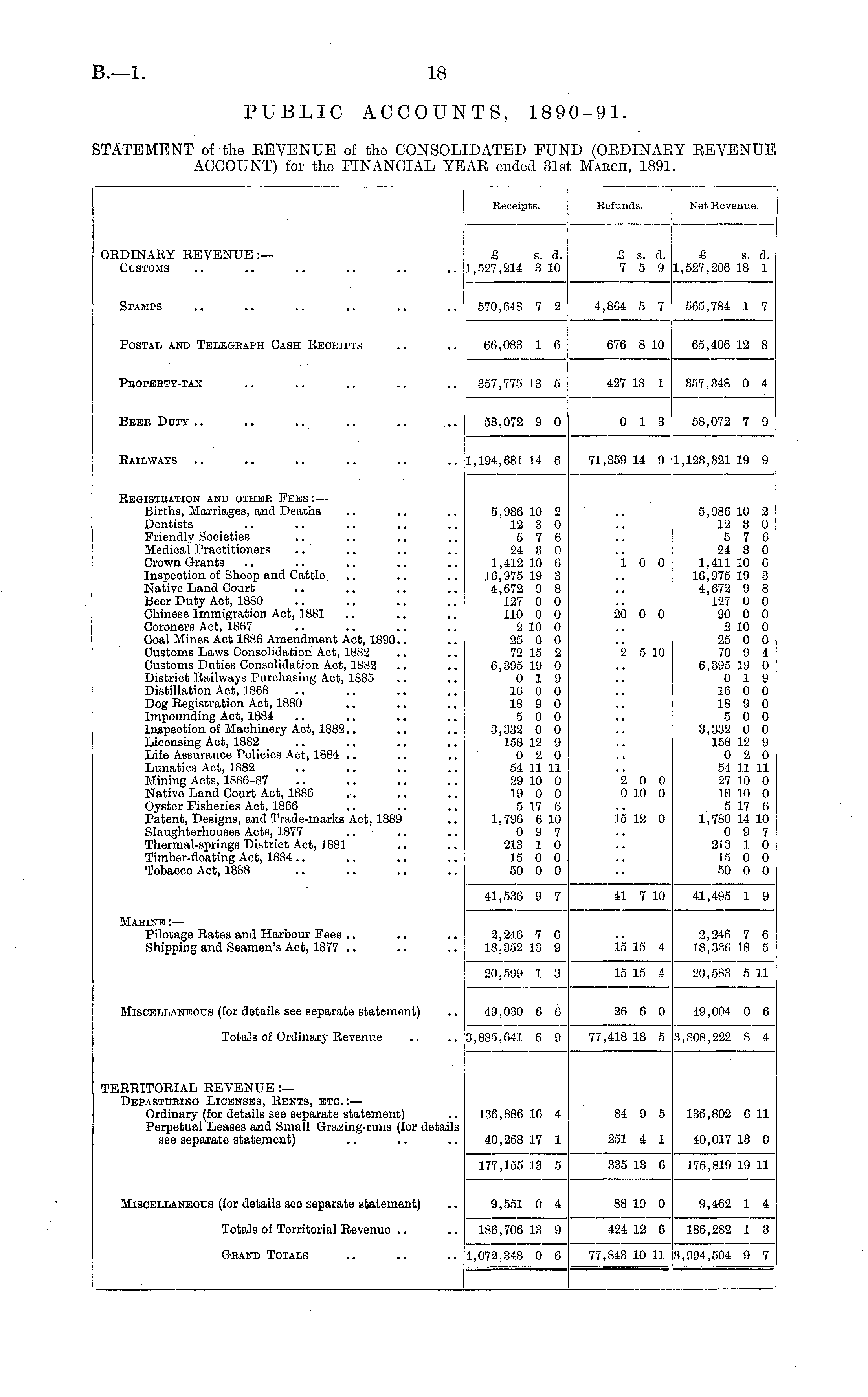 Beceipts. Refunds. Net Revenue. ORDINARY REVENUE:— Customs £ s. d. 1,527,214 3 10 & s. a. 759 £ s. d. 1,527,206 18 1 Stamps 570,648 7 2 4,864 5 7 565,784 1 7 Postal and Telegbaph Cash Receipts 06,083 1 6 676 8 10 65,406 12 8 Pbopebty-tax 357,775 13 5 427 13 1 357,348 0 4 Beek Duty 58,072 9 0 0 13 58,072 7 9 Railways 1,194,681 14 6 71,359 14 9 1,123,321 19 9 Registration and otheb Fees:— Births, Marriages, and Deaths Dentists Friendly Societies Medical Practitioners Crown Grants Inspection of Sheep and Cattle Native Land Court Beer Duty Act, 1880 Chinese Immigration Act, 1881 Coroners Act, 1867 Coal Mines Act 1886 Amendment Act, 1890.. Customs Laws Consolidation Act, 1882 Customs Duties Consolidation Act, 1882 District Railways Purchasing Act, 1885 Distillation Act, 1868 Dog Registration Act, 1880 Impounding Act, 1884 Inspection of Machinery Act, 1882.. Licensing Act, 1882 Life Assurance Policies Act, 1884 Lunatics Act, 1882 Mining Acts, 1886-87 Native Land Court Act, 1886 Oyster Fisheries Act, 1866 Patent, Designs, and Trade-marks Act, 1889 Slaughterhouses Acts, 1877 Thermal-springs District Act, 1881 Timber-floating Act, 1884 Tobacco Act, 1888 5,986 10 2 12 3 0 5 7 6 24 3 0 1,412 10 6 16,975 19 3 4,672 9 8 127 0 0 110 0 0 2 10 0 25 0 0 72 15 2 6,395 19 0 0 19 16 0 0 18 9 0 5 0 0 3,332 0 0 158 12 9 0 2 0 54 11 11 29 10 0 19 0 0 5 17 6 1,796 6 10 0 9 7 213 1 0 15 0 0 50 0 0 "i o o 20 0 0 '2 5 10 5,986 10 2 12 3 0 5 7 6 24 3 0 1,411 10 6 16,975 19 3 4,672 9 8 127 0 0 90 0 0 2 10 0 25 0 0 70 9 4 6,395 19 0 0 19 16 0 0 18 9 0 5 0 0 3,332 0 0 158 12 9 0 2 0 54 11 11 27 10 0 18 10 0 5 17 6 1,780 14 10 0 9 7 213 1 0 15 0 0 50 0 0 2 0 0 0 10 0 15 12 0 41,495 1 9 41,536 9 7 41 7 10 Mabinb :— Pilotage Rates and Harbour Fees Shipping and Seamen's Act, 1877 2,246 7 6 18,352 13 9 is 15 4 2,246 7 6 18,336 18 5 20,599 1 3 15 15 4 20,583 5 11 Miscellaneous (for details see separate statement) 49,030 6 6 26 G 0 49,004 0 6 Totals of Ordinary Revenue 3,885,641 6 9 77,418 18 5 3,808,222 8 4 TERRITORIAL REVENUE :— Depastubing Licenses, Rents, etc. :— Ordinary (for details see separate statement) Perpetual Leases and Small Grazing-runs (for details see separate statement) 136,886 16 4 84 9 5 136,802 6 11 40,268 17 1 251 4 1 40,017 13 0 177,155 13 5 335 13 6 176,819 19 11 Miscellaneous (for details see separate statement) 9,551 0 4 88 19 0 9,462 1 4 Totals of Territorial Revenue .. 186,706 13 9 424 12 6 186,282 1 3 Gband Totals 4,072,348 0 6 77,843 10 11 3,994,504 9 7