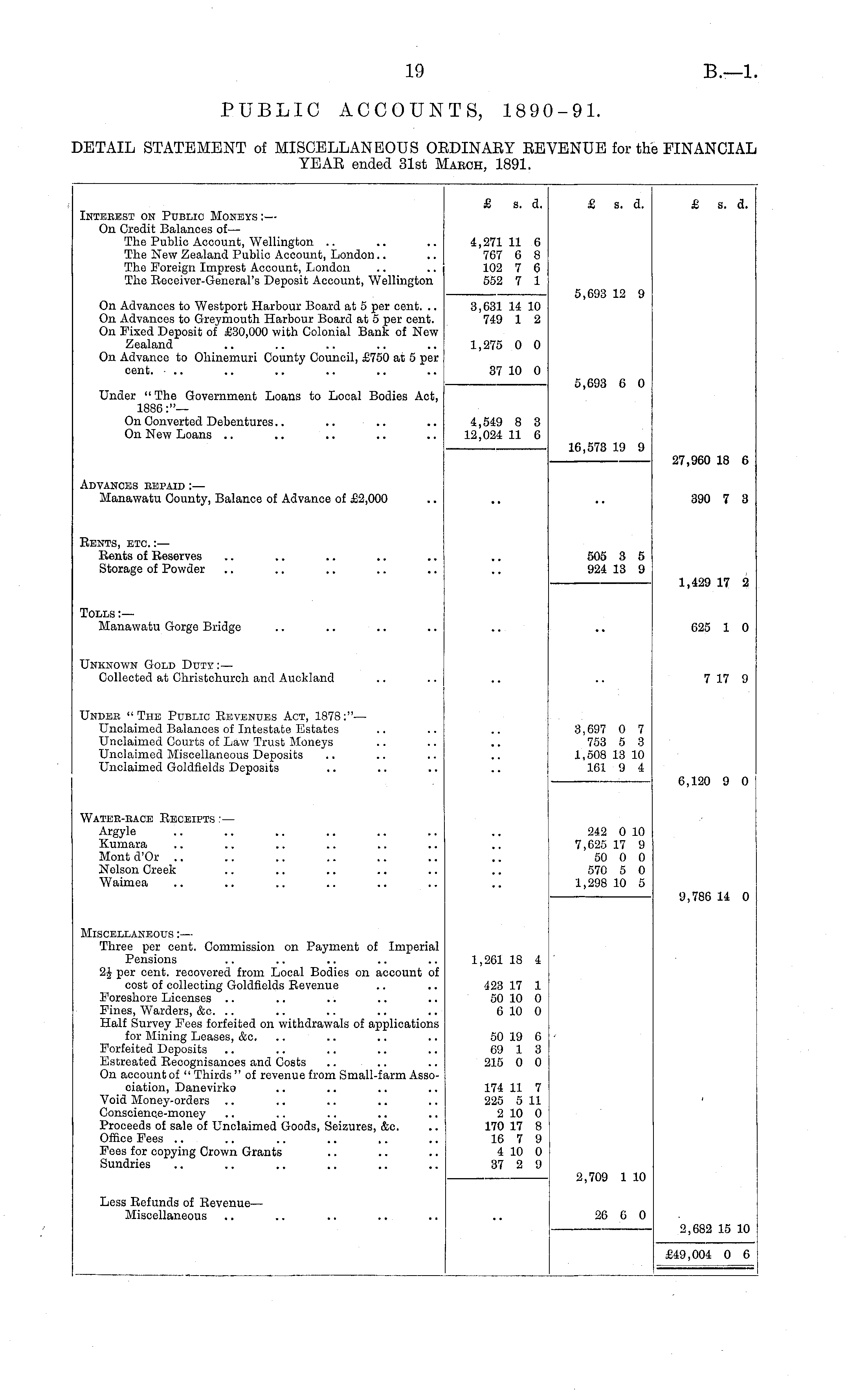 Interest on Public Moneys :— On Creait Balances of — The Public Account, Wellington The New Zealana Public Account, Lonaon The Foreign Imprest Account, Lonaon The Receiver-General's Deposit Account, Wellington s, s. a. 4,271 11 6 767 6 8 102 7 6 552 7 1 & s. a. & s. a. 5,693 12 9 On Aavances to Westport Harbour Board at 5 per cent. .. On Aavances to Greymouth Harbour Boara at 5 per cent. On Pixea Deposit of £30,000 with Colonial Bank of New Zealana On Aavance to Ohinemuri County Council, £750 at 5 per cent. .. 3,631 14 10 749 1 2 1,275 0 0 37 10 0 5,693 6 0 Unaer " The Government Loans to Local Boaies Act, 1886:"— On Convertea Debentures On New Loans 4,549 8 3 12,024 11 6 16,573 19 9 Advances repaid :— Manawatu County, Balance of Advance of £2,000 27,960 18 6 390 7 3 Rents, etc. :— Rents of Reserves Storage of Powaer 505 3 5 924 13 9 1,429 17 2 Tolls :— Manawatu Gorge Briage 625 1 0 Unknown Gold Duty:— Collected at Christchurch ana Auckland 7 17 9 Undeb " The Public Revenues Act, 1878;" — Unclaimed Balances of Intestate Estates Unclaimed Courts of Law Trust Moneys Unclaimed Miscellaneous Deposits Unclaimed Goldfields Deposits 3,697 0 7 753 5 3 1,508 13 10 161 9 4 6,120 9 0 Water-race Receipts :— Argyle Kumara Mont d'Or Nelson Creek Waimea 242 0 10 7,625 17 9 50 0 0 570 5 0 1,298 10 5 9,786 14 0 Miscellaneous :— Three per cent. Commission on Payment of Imperial Pensions 2J per cent, recovered from Local Bodies on account of cost of collecting Goldfields Revenue Foreshore Licenses Fines, Warders, &c. Half Survey Fees forfeited on withdrawals of applications for Mining Leases, &c. Forfeitea Deposits Kstreatea Recognisances ana Costs On account of " Thirds" of revenue from Small-farm Association, Danevirka Voia Money-oraers Conscience-money Proceeds of sale of Unclaimed Gooas, Seizures, &c. Office Fees Fees for copying Crown Grants Sundries 1,261 18 4 423 17 1 50 10 0 6 10 0 50 19 6 69 1 3 215 0 0 174 11 7 225 5 11 2 10 0 170 17 8 16 7 9 4 10 0 37 2 9 Less Refunds of Revenue — Miscellaneous 2,709 1 10 26 C 0 2,682 15 10 £49,004 0 6