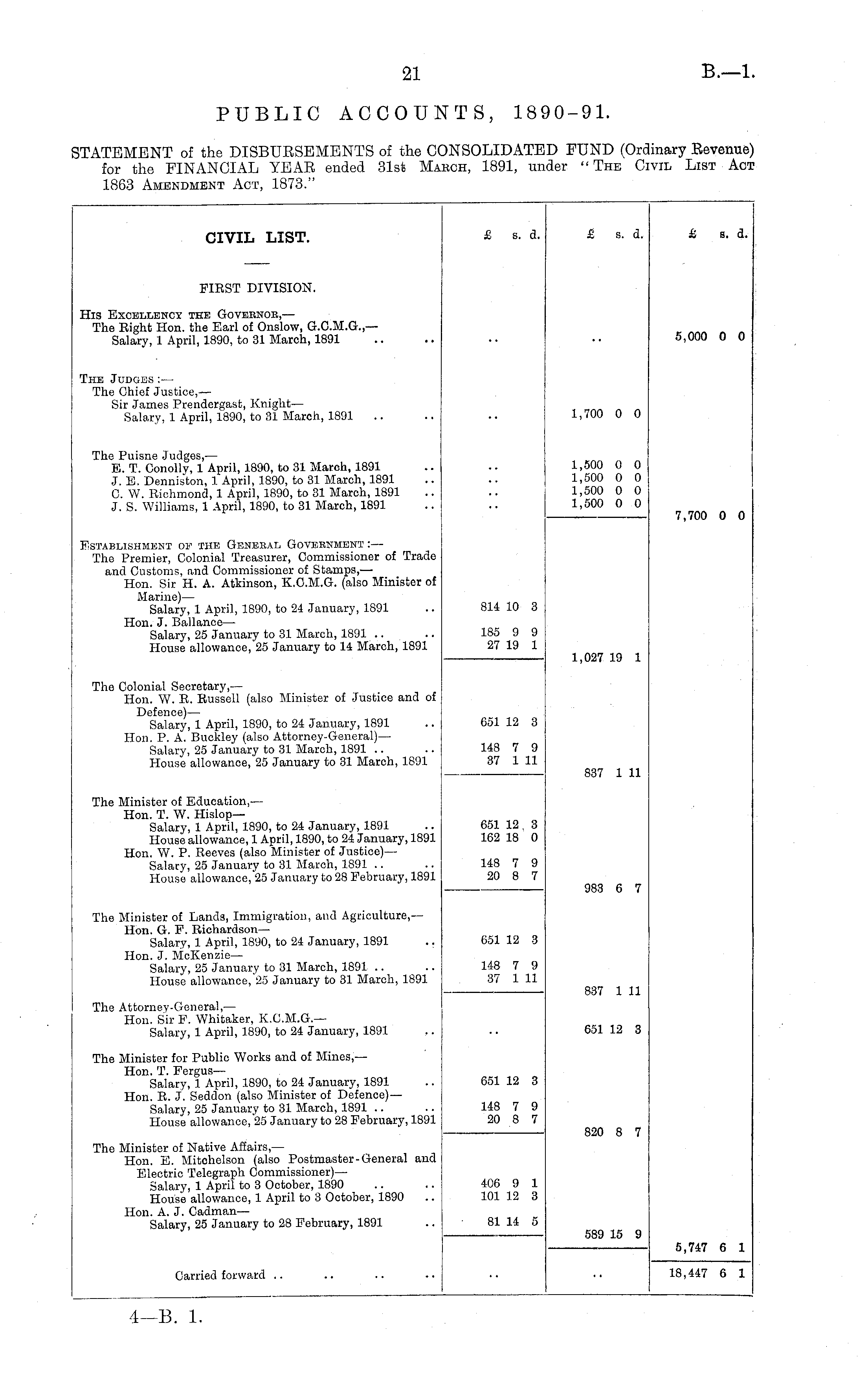 CIVIL LIST. £ s. a. £ s. a. £ b. a. FIBST DIVISION. 5,000 0 0 His Excellency the Govebnob,— The Bight Hon. the Earl of Onslow, G.C.M.G.,— Salary, 1 April, 1890, to 31 March, 1891 The Judges:— The Chief Justice, — Sir James Prendergast, Knight— Salary, 1 April, 1890, to 31 March, 1891 1,700 0 0 The Puisne Judges,— E. T. Conolly, 1 April, 1890, to 31 March, 1891 J. E. Denniston, 1 April, 1890, to 31 March, 1891 C. W. Bichmond, 1 April, 1890, to 31 March, 1891 J. S. Williams, 1 April, 1890, to 31 March, 1891 1,500 0 0 1,500 0 0 1,500 0 0 1,500 0 0 7,700 0 0 Establishment of the General Government :— The Premier, Colonial Treasurer, Commissioner of Trade and Customs, and Commissioner of Stamps,— Hon. Sir H. A. Atkinson, K.C.M.G. (also Minister of Marine) — Salary, 1 April, 1890, to 24 January, 1891 Hon. J. Ballance — Salary, 25 January to 31 March, 1891 House allowance, 25 January to 14 March, 1891 814 10 3 185 9 9 27 19 1 1,027 19 1 The Colonial Secretary,— Hon. W. B. Bussell (also Minister of Justice and of Defence) — Salary, 1 April, 1890, to 24 January, 1891 Hon. P. A. Buckley (also Attorney-General) — Salary, 25 January to 31 March, 1891 House allowance, 25 January to 31 March, 1891 651 12 3 148 7 9 37 1 11 837 1 11 The Minister of Education, — Hon. T. W. Hislop— Salary, 1 April, 1890, to 24 January, 1891 House allowance, 1 April, 1890, to 24 January, 1891 Hon. W. P. Reeves (also Minister of Justice) — Salary, 25 January to 31 March, 1891 House allowance, 25 January to 28 February, 1891 651 12 3 162 18 0 148 7 9 20 8 7 The Minister of Lands, Immigration, and Agriculture, — Hon. G. F. Bichardson— Salary, 1 April, 1890, to 24 January, 1891 Hon. J. McKenzie — Salary, 25 January to 31 March, 1891 House allowance, 25 January to 31 March, 1891 983 6 7 651 12 3 148 7 9 37 1 11 837 1 11 The Attorney-General,— Hon. Sir P. Whitaker, K.C.M.G.— Salary, 1 April, 1890, to 24 January, 1891 651 12 3 The Minister for Public Works and of Mines, — Hon. T. Fergus— Salary, 1 April, 1890, to 24 January, 1891 Hon. B. J. Seddon (also Minister of Defence)— Salary, 25 January to 31 March, 1891 House allowance, 25 January to 28 February, 1891 651 12 3 820 8 7 148 7 9 20 8 7 The Minister of Native Affairs, — Hon. E. Mitchelson (also Postmaster-General and Electric Telegraph Commissioner) — Salary, 1 April to 3 October, 1890 House allowance, 1 April to 3 October, 1890 Hon. A. J. Cadman — Salary, 25 January to 28 February, 1891 406 9 1 101 12 3 589 15 9 81 14 5 5,747 6 1 Carried forward .. 18,447 6 1