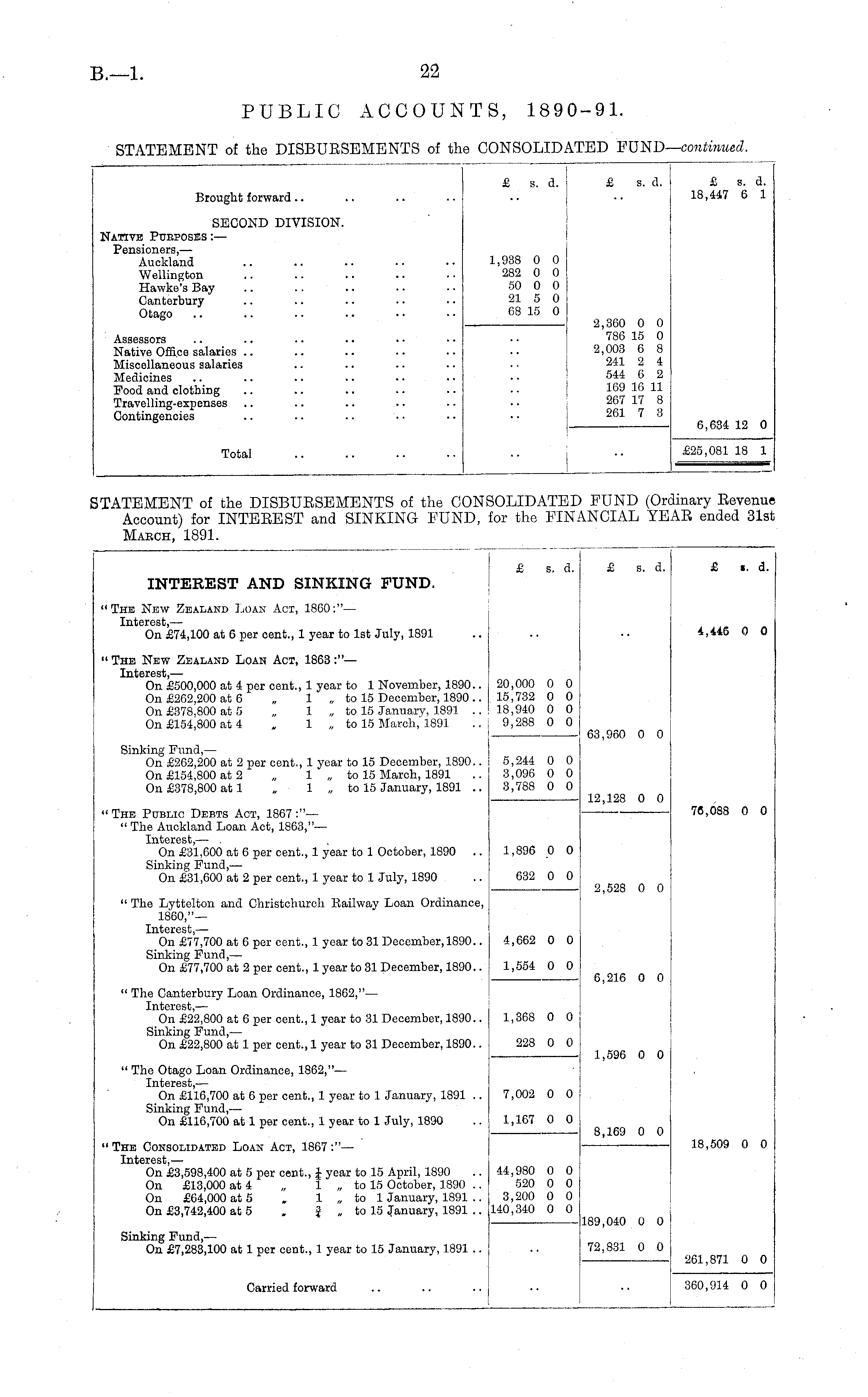 INTEREST AND SINKING FUND. £ s. d. £ s. d. £ >. d. "The New Zealand Loan Act, I860:" — Interest, — On £74,100 at 6 per cent., 1 year to 1st July, 1891 i,U5 0 0 " The New Zealand Loan Act, 1863 :" — Interest, — On £500,000 at 4 per cent., 1 year to 1 November, 1890.. On £262,200 at 6 „ 1 „ to 15 December, 1890 .. On £378,800 at 5 „ 1 „ to 15 January, 1891 .. On £154,800 at 4 , 1 „ to 15 March, 1891 20,000 0 0 15,732 0 0 18,940 0 0 9,288 0 0 Sinking Fund, — On £262,200 at 2 per cent., 1 year to 15 December, 1890.. On £154,800 at 2 „ 1 „ to 15 March, 1891 On £378,800 at 1 „ 1 „ to 15 January, 1891 .. 63,960 0 0 5,244 0 0 3,096 0 0 3,788 0 0 12,128 0 0 " The Public Debts Act, 1867 :" — " The Auckland Loan Act, 1863,"— Interest, — . On £31,600 at 6 per cent., 1 year to 1 October, 1890 .. Sinking Fund, — On £31,600 at 2 per cent., 1 year to 1 July, 1890 76,088 0 0 1,896 0 0 632 0 0 " The Lyttelton and Christchurch Railway Loan Ordinance, I860,"— Interest, — On £77,700 at 6 per cent., 1 year to 31 December, 1890.. Sinking Fund, — On £77,700 at 2 per cent., 1 year to 31 December, 1890.. 2,528 0 0 4,662 0 0 1,554 0 0 6,216 0 0 " The Canterbury Loan Ordinance, 1862," — Interest, — On £22,800 at 6 per cent., 1 year to 31 December, 1890.. Sinking Fund, — On £22,800 at 1 per cent., 1 year to 31 December, 1890.. 1,368 0 0 1,596 0 0 228 0 0 " The Otago Loan Ordinance, 1862,"— Interest, — On £116,700 at 6 per cent., 1 year to 1 January, 1891 .. Sinking Fund, — On £116,700 at 1 per cent., 1 year to 1 July, 1890 7,002 0 0 8,169 0 0 1,167 0 0 18,509 0 0 " The Consolidated Loan Act, 1867 :" — Interest, — On £3,598,400 at 5 per cent., J year to 15 April, 1890 On £13,000 at 4 „ 1 „ to 15 October, 1890 .. On £64,000 at 5 „ 1 , to 1 January, 1891 .. On £3,742,400 at 5 . j „ to 15 January, 1891 .. 44,980 0 0 520 0 0 3,200 0 0 140,340 0 0 Sinking Fund, — On £7,283,100 at 1 per cent., 1 year to 15 January, 1891 .. 189,040 0 0 72,831 0 0 261,871 0 0 Carried forward 360,914 0 0