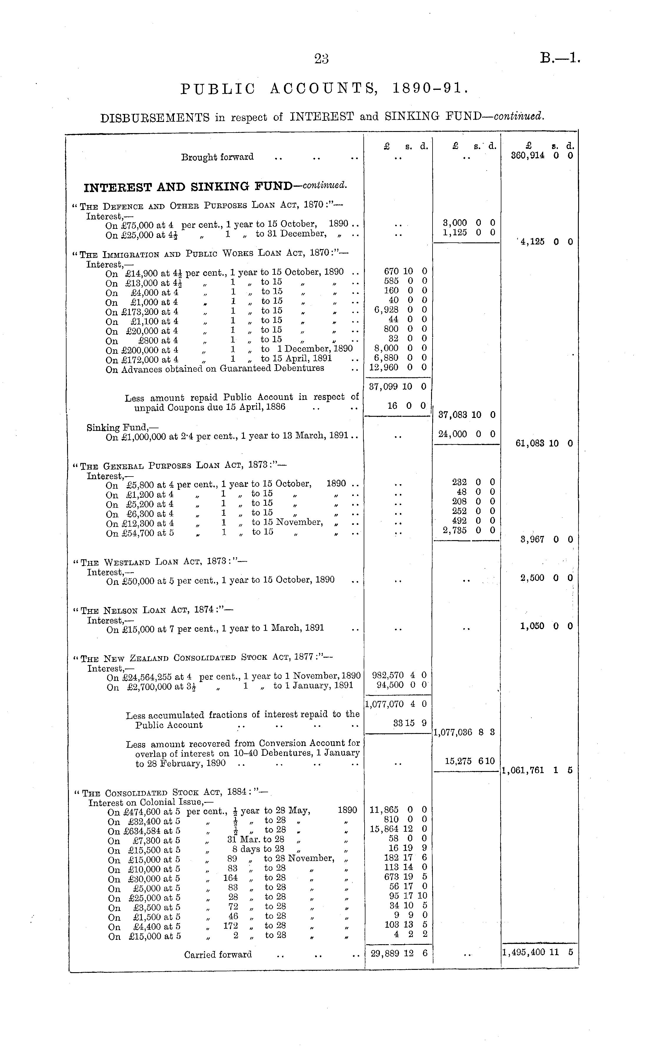 £ s. a. £ s. a. £ s. a. 360,914 0 0 Brought forward INTEREST AND SINKING FUND— continued. " The Defence and Other Purposes Loan Act, 1870 :"— Interest, — On £75,000 at 4 per cent., 1 year to 15 October, 1890.. On £25,000 at 4J „ 1 „ to 31 December, „ .. 3,000 0 0 1,125 0 0 '4,125 0 0 "The Immigration and Public Wobks Loan Act, 1870:"— Interest, — On £14,900 at 4J per cent., 1 year to 15 October, 1890 .. On £13,000 at 4J „ 1 „ to 15 „ „ On £4,000 at 4 „ 1 „ to 15 „ „ On £1,000 at 4 „ 1 „ to 15 „ „ On £173,200 at 4 „ 1 „ to 15 „ ... On £1,100 at 4 „ 1 „ to 15 „ ... On £20,000 at 4 „ 1 „ to 15 „ „ On £800 at 4 „ 1 „ to 15 „ „ On £200,000 at 4 „ 1 „ to 1 December, 1890 On £172,000 at 4 „ 1 „ to 15 April, 1891 On Advances obtained on Guaranteed Debentures 670 10 0 585 0 0 160 0 0 40 0 0 6,928 0 0 44 0 0 800 0 0 32 0 0 8,000 0 0 6,880 0 0 12,960 0 0 Less amount repaid Public Account in respect of unpaid Coupons due 15 April, 1886 37,099 10 0 16 0 0 37,083 10 0 Sinking Fund, — On £1,000,000 at 2'4 per cent., 1 year to 13 March, 1891.. 24,000 0 0 61,083 10 0 " The General Purposes Loan Act, 1873:" — Interest, — On £5,800 at 4 per cent., 1 year to 15 October, 1890 .. On £1,200 at 4 „ 1 „ to 15 „ „ .. On £5,200 at 4 „ 1 „ to 15 „ „ On £6,300 at 4 „ 1 „ to 15 „ „ .. On £12,300 at 4 „ 1 „ to 15 November, „ On £54,700 at 5 „ 1 „ to 15 „ „ .. 232 0 0 48 0 0 208 0 0 252 0 0 492 0 0 2,735 0 0 3,967 0 0 "The Westland Loan Act, 1873:" — Interest, — On £50,000 at 5 per cent., 1 year to 15 October, 1890 2,500 0 0 " The Nelson Loan Act, 1874 :" — Interest, — On £15,000 at 7 per cent., 1 year to 1 March, 1891 1,050 0 0 " The New Zealand Consolidated Stock Act, 1877:" — Interest, — On £24,564,255 at 4 per cent., 1 year to 1 November, 1890 On £2,700,000 at 3J „ 1 „ to 1 January, 1891 982,570 4 0 94,500 0 0 Less accumulated fractions of interest repaid to the Public Account 1,077,070 4 0 3315 9 1,077,036 8 3 Less amount recovered from Conversion Account for overlap of interest on 10-40 Debentures, 1 January to 28 February, 1890 15,275 610 1,061,761 1 5 " The Consolidated Stock Act, 1884: " — Interest on Colonial Issue, — On £474,600 at 5 per cent., J year to 28 May, 1890 On £32,400 at 5 „ i „ to 28 „ On £634,584 at 5 „ i „ to 28 „ On £7,300 at 5 „ 31 Mar. to 28 „ On £15,500 at 5 „ 8 days to 28 „ On £15,000 at 5 „ 89 „ to 28 November, „ On £10,000 at 5 „ 83 „ to 28 On £30,000 at 5 „ 164 „ to 28 On £5,000 at 5 „ 83 „ to 28 On £25,000 at 5 „ 28 „ to 28 On £3,500 at 5 „ 72 „ to 28 On £1,500 at 5 „ 46 „ to 28 On £4,400 at 5 „ 172 „ to 28 On £15,000 at 5 „ 2 „ to 28 11,865 0 0 810 0 0 15,864 12 0 58 0 0 16 19 9 182 17 6 113 14 0 673 19 5 56 17 0 95 17 10 34 10 5 9 9 0 103 13 5 4 2 2 Carried forward 29,889 12 6 1,495,400 11 5