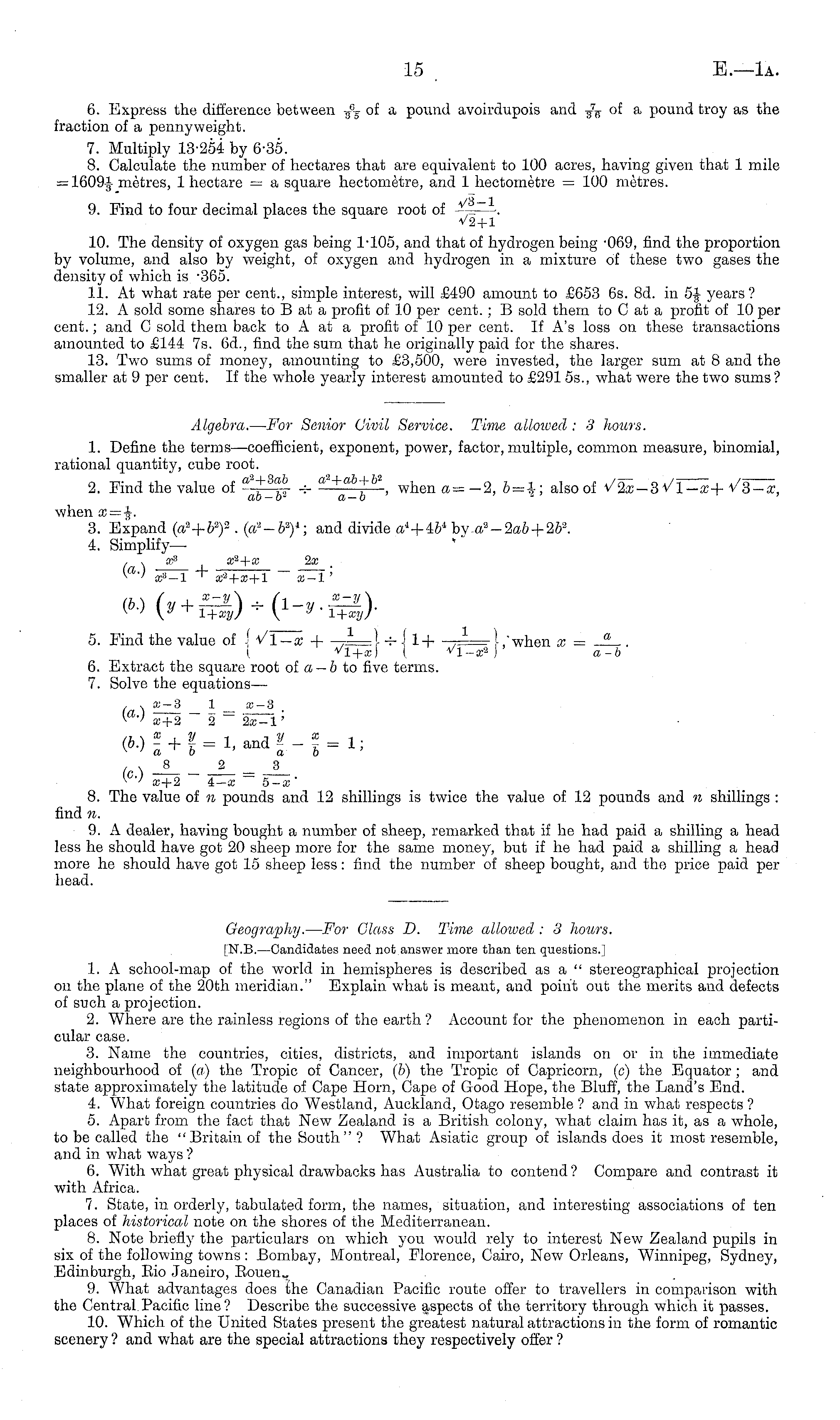 Algebra. — For Senior Civil Service. Time allowed : 3 hours. 1. Define the terms —coefficient, exponent, power, factor, multiple, common measure, binomial, rational quantity, cube root. 2. Find the value of + a' i+ab +b\ w hena=-2, b= i; also of V2x-3VI-x+*/3-x, ab-b- a — b J ' when x = \. 3. Expand (a^+Vf . (ab 2) 4; and divide « 4+46 4 by a i-2ab + 2b i. 4. Simplify— / > x s x 2+x 2x \a-) X 3-1 +xi+X + 1 ~ »-l ' w(»+£S) + ( 1-»-S> 5. Find the value of 1 Vl-x + -t=\ + { 1+ -^=1, when » = _£_. I. vl+x) ( Vl-x' 1 j a-b 6. Extract the square root of a— b to five terms. 7. Solve the equations— {""' x+ 2 2 ~ 2«-l' (&Ol + !=l.andf-|=l; 8. The value of n pounds and 12 shillings is twice the value of 12 pounds and n shillings : find n. 9. A dealer, having bought a number of sheep, remarked that if he had paid a shilling a head less he should have got 20 sheep more for the same money, but if he had paid a shilling a head more he should have got 15 sheep less: find the number of sheep bought, and the price paid per head.