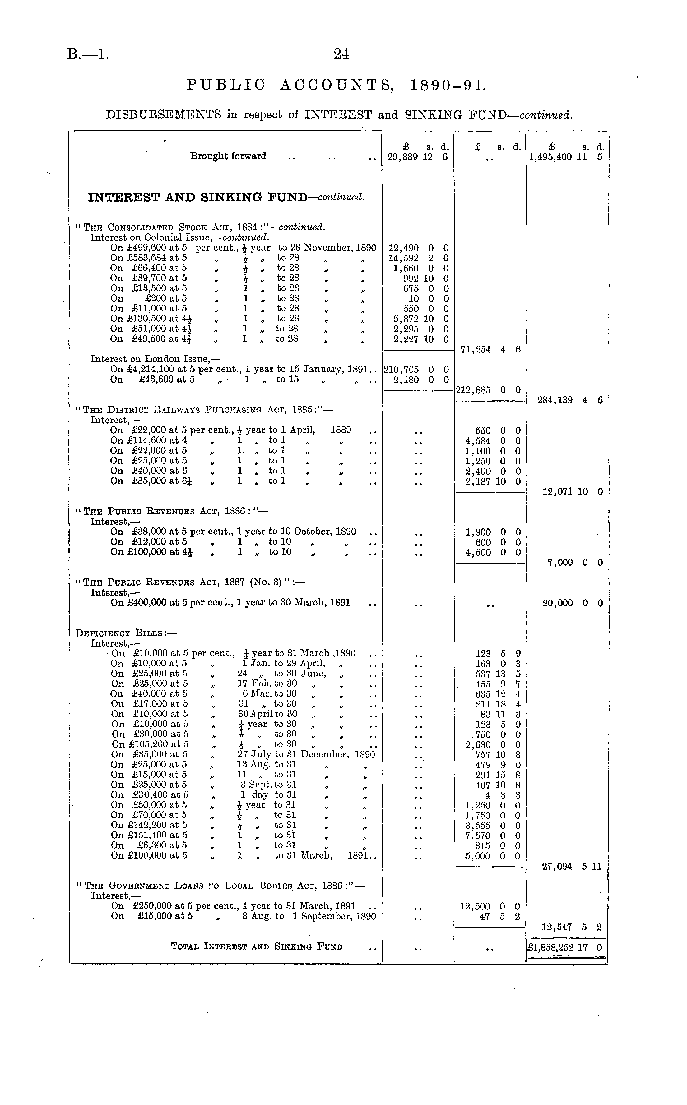 Brought forward £ 8. d. 29,889 12 6 £ s. d. £ s. d. 1,495,400 11 5 INTEREST AND SINKING FTJND-continued. " The Consolidated Stock Act, 1884 :"— continued. Interest on Colonial Issue, — continued. On £499,600 at 5 per cent., J year to 28 November, 1890 On £583,684 at 5 „ J „ to 28 On £66,400 at 5 „ | „ to 28 On £39,700 at 5 „ J „ to 28 On £13,500 at 5 „ 1 „ to 28 On £200 at 5 „ 1 „ to 28 On £11,000 at 5 „ 1 „ to 28 On £130,500 at 4J , 1 „ to 28 On £51,000 at i\ „ 1 „ to 28 On £49,500 at 4J „ 1 „ to 28 12,490 0 0 14,592 2 0 1,660 0 0 992 10 0 675 0 0 10 0 0 550 0 0 5,872 10 0 2,295 0 0 2,227 10 0 Interest on London Issue, — On £4,214,100 at 5 per cent., 1 year to 15 January, 1891.. On £43,600 at 5 , 1 „ to 15 „ „ .. 71,254 4 6 210,705 0 0 2,180 0 0 '212,885 0 0 "The District Railways Purchasing Act, 1885:"— Interest, — On £22,000 at 5 per cent., J year to 1 April, 1889 On £114,600 at 4 . 1 „ to 1 On £22,000 at 5 , 1 „ to 1 On £25,000 at 5 „ 1 „ to 1 On £40,000 at 6 , 1 „ to 1 On £35,000 at 6£ , 1 . to 1 550 0 0 4,584 0 0 1,100 0 0 1,250 0 0 2,400 0 0 2,187 10 0 284,139 4 6 i< The Public Revenues Act, 1886 : " — Interest, — On £38,000 at 5 per cent., 1 year to 10 October, 1890 .. On £12,000 at 5 , 1 „ to 10 On £100,000 at 4J „ 1 „ to 10 12,071 10 0 1,900 0 0 600 0 0 4,500 0 0 7,000 0 0 "The Public Revenues Act, 1887 (No. 3) " :— Interest, — On £400,000 at 5 per cent., 1 year to 30 March, 1891 20,000 0 0 ■ • Deficiency Bills: — Interest, — On £10,000 at 5 per cent., J year to 31 March ,1890 .. On £10,000 at 5 „ 1 Jan. to 29 April, „ On £25,000 at 5 „ 24 „ to 30 June, „ On £25,000 at 5 „ 17 Feb. to 30 „ On £40,000 at 5 ,. 6 Mar. to 30 On £17,000 at 5 „ 31 „ to 30 „ On £10,000 at 5 „ 30 April to 30 „ On £10,000 at 5 „ J year to 30 On £30,000 at 5 „ i „ to 30 On £105,200 at 5 „ J „ to 30 „ On £35,000 at 5 „ 27 July to 31 December, 1890 On £25,000 at 5 „ 13 Aug. to 31 On £15,000 at 5 „ 11 „ to 31 On £25,000 at 5 , S Sept. to 31 On £30,400 at 5 „ 1 day to 31 On £50,000 at 5 „ J year to 31 On £70,000 at 5 „ i „ to 31 On £142,200 at 5 » j „ to 31 On £151,400 at 5 . 1 „ to 31 On £6,300 at 5 , 1 , to 31 On £100,000 at 5 , 1 „ to 31 March, 1891.. 123 5 9 163 0 3 537 13 5 455 9 7 635 12 4 211 18 4 83 11 3 123 5 9 750 0 0 2,630 0 0 757 10 8 479 9 0 291 15 8 407 10 8 4 3 3 1,250 0 0 1,750 0 0 3,555 0 0 7,570 0 0 815 0 0 5,000 0 0 "The Government Loans to Local Bodies Act, 1886:" — Interest, — On £250,000 at 5 per cent., 1 year to 31 March, 1891 .. On £15,000 at 5 „ 8 Aug. to 1 September, 1890 27,094 5 11 12,500 0 0 47 5 2 12,547 5 2 Total Interest and Sinking Fund £1,858,252 17 0