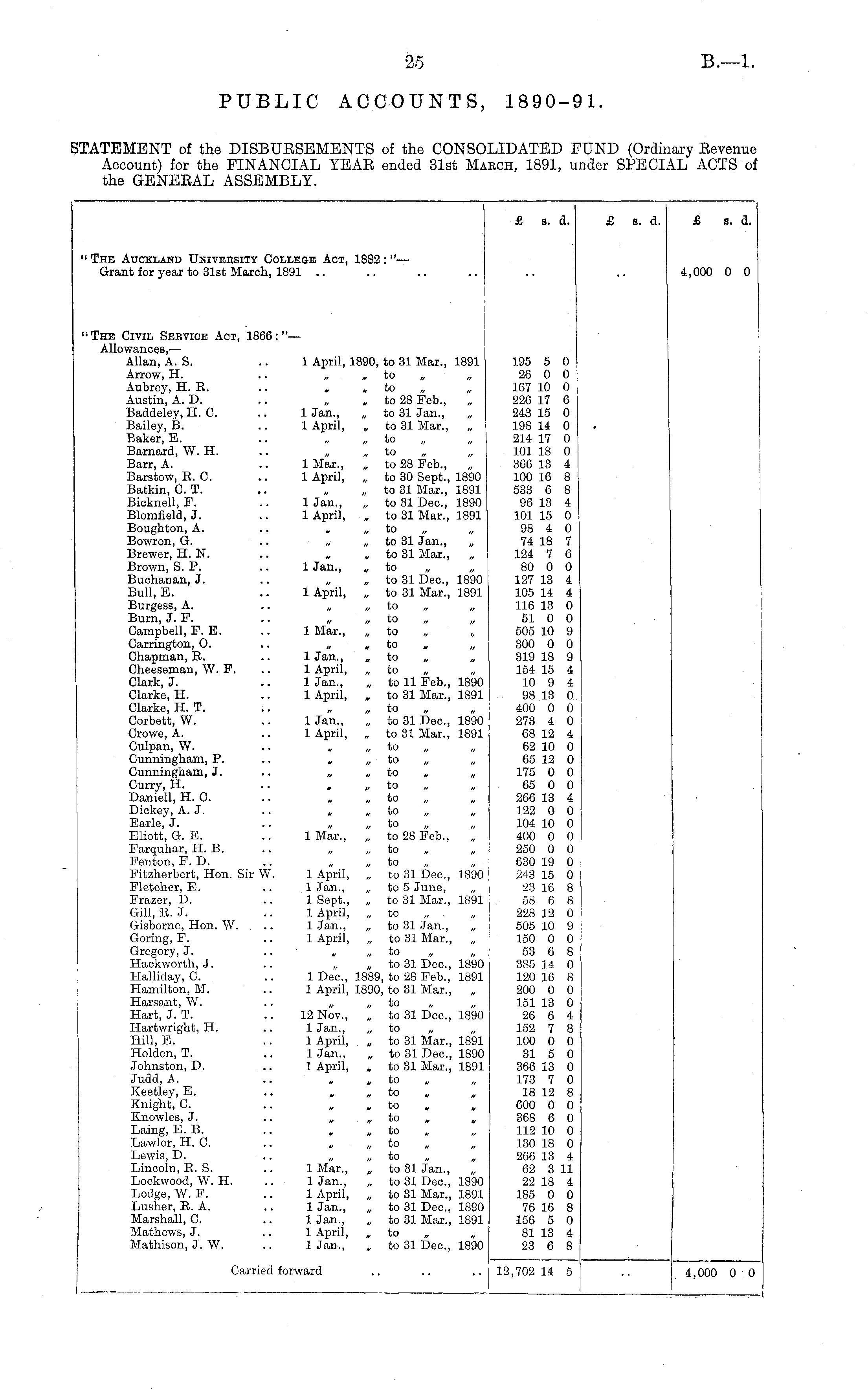 £ s. a. £ s. d. £ a. a. " The Auckland Univebsity College Act, 1882 : "— Grant for year to 31st March, 1891 4,000 0 0 "The Civil Sebvice Act, 1866:"— Allowances, — Allan, A. S. .. 1 April, 1890, to 31 Mar., 1891 Arrow, H. .. „ « to „ „ Aubrey, H. E. .. , , to Austin, A. D. .. „ , to 28 Feb., Baddeley, H. C. .. 1 Jan., „ to 31 Jan., „ Bailey, B. .. 1 April, , to 31 Mar., Baker, E. .. „ „ to Barnard, W. H. .. „ „ to Barr, A. .. 1 Mar., „ to 28 Feb., Barstow, E. C. .. 1 April, „ to 30 Sept., 1890 Batkin, C. T. .. „ to 31 Mar., 1891 Bicknell, F. .. 1 Jan., „ to 31 Dec, 1890 Blomfield, J. .. 1 April, , to 31 Mar., 1891 Boughton, A. .. „ „ to „ „ Bowron, G. .. „ „ to 31 Jan., „ Brewer, H. N. .. » „ to 31 Mar., „ Brown, S. P. .. 1 Jan., „ to „ „ Buchanan, J. .. „ „ to 31 Dec, 1890 Bull, B. .. 1 April, „ to 31 Mar., 1891 Burgess, A. .. „ „ to „ „ Burn, J. F. .. „ „ to Campbell, F. B. .. 1 Mar., „ to Carrington, 0. .. „ » to „ „ Chapman, E. 1 Jan., „ to „ „ Cheeseman, W. F. .. 1 April, „ to „ Clark, J. .. 1 Jan., „ to 11 Feb., 1890 Clarke, H. 1 April, „ to 31 Mar., 1891 Clarke, H. T. .. „ „ to „ „ Corbett, W. .. 1 Jan., „ to 31 Dec. 1890 Crowe, A. .. 1 April, „ to 31 Mar., 1891 Culpan, W. .. „ „ to „ „ Cunningham, P. .. to „ Cunningham, J. .. „ „ to „ „ Curry, H. .. , „ to „ „ Daniell, H. C. .. „ „ to Dickey, A. J. .. „ „ to „ „ Earle, J. .. „ „ to Eliott, G. E. .. 1 Mar., „ to 28 Feb., Farquhar, H. B. .. „ „ to Fenton, F. D. .. „ „ to Fitzherbert, Hon. Sir W. 1 April, „ to 31 Dec, 1890 Fletcher, E. .. 1 Jan., „ to 5 June, „ Frazer, D. .. 1 Sept., „ to 31 Mar., 1891 Gill, E.J. .. 1 April, „ to Gisborne, Hon. W. .. 1 Jan., „ to 31 Jan., „ Goring, F. 1 April, „ to 31 Mar., Gregory, J. .. „ „ to „ „ Hackworth, J. .. „ „ to 31 Dec, 1890 Halliday, C. .. 1 Dec, 1889, to 28 Feb., 1891 Hamilton, M. .. 1 April, 1890, to 31 Mar., Harsant, W. .. „ „ to „ „ Hart, J. T. .. 12 Nov., „, to 31 Dec, 1890 Hartwright, H. .. 1 Jan., „ to „ „ Hill, E. .. 1 April, „ to 31 Mar., 1891 Holden, T. 1 Jan., „ to 31 Dec, 1890 Johnston, D. 1 April, „ to 31 Mar., 1891 Judd, A. .. „ , to „ „ Keetley, E. .. „ to Knight, C. .. „ to Knowles, J. .. » „ to » „ Laing, E. B. .. „ to Lawlor, H. C. .. „ „ to „ „ Lewis, D. .. „ „ to „ „ Lincoln, E. S. .. 1 Mar., „ to 31 Jan., „ Lockwood, W. H. .. 1 Jan., „ to 31 Dec, 1890 Lodge, W. F. .. 1 April, „ to 31 Mar., 1891 Lusher, E. A. .. 1 Jan., „ to 31 Dec, 1890 Marshall, C. .. 1 Jan., „ to 31 Mar., 1891 Mathews, J. .. 1 April, to „ Mathison, J. W. .. 1 Jan., „ to 31 Dec, 1890 195 5 0 26 0 0 167 10 0 226 17 6 243 15 0 198 14 0 214 17 0 101 18 0 366 13 4 100 16 8 533 6 8 96 13 4 101 15 0 98 4 0 74 18 7 124 7 6 80 0 0 127 13 4 105 14 4 116 13 0 51 0 0 505 10 9 300 0 0 319 18 9 154 15 4 10 9 4 98 13 0 400 0 0 273 4 0 68 12 4 62 10 0 65 12 0 175 0 0 65 0 0 266 13 4 122 0 0 104 10 0 400 0 0 250 0 0 630 19 0 243 15 0 23 16 8 58 6 8 228 12 0 505 10 9 150 0 0 53 6 8 385 14 0 120 10 8 200 0 0 151 13 0 26 6 4 152 7 8 100 0 0 31 5 0 366 13 0 173 7 0 18 12 8 600 0 0 368 6 0 112 10 0 130 18 0 266 13 4 62 3 11 22 18 4 185 0 0 76 16 8 156 5 0 81 13 4 23 6 8 Carried forward 12,702 14 5 4,000 0 0