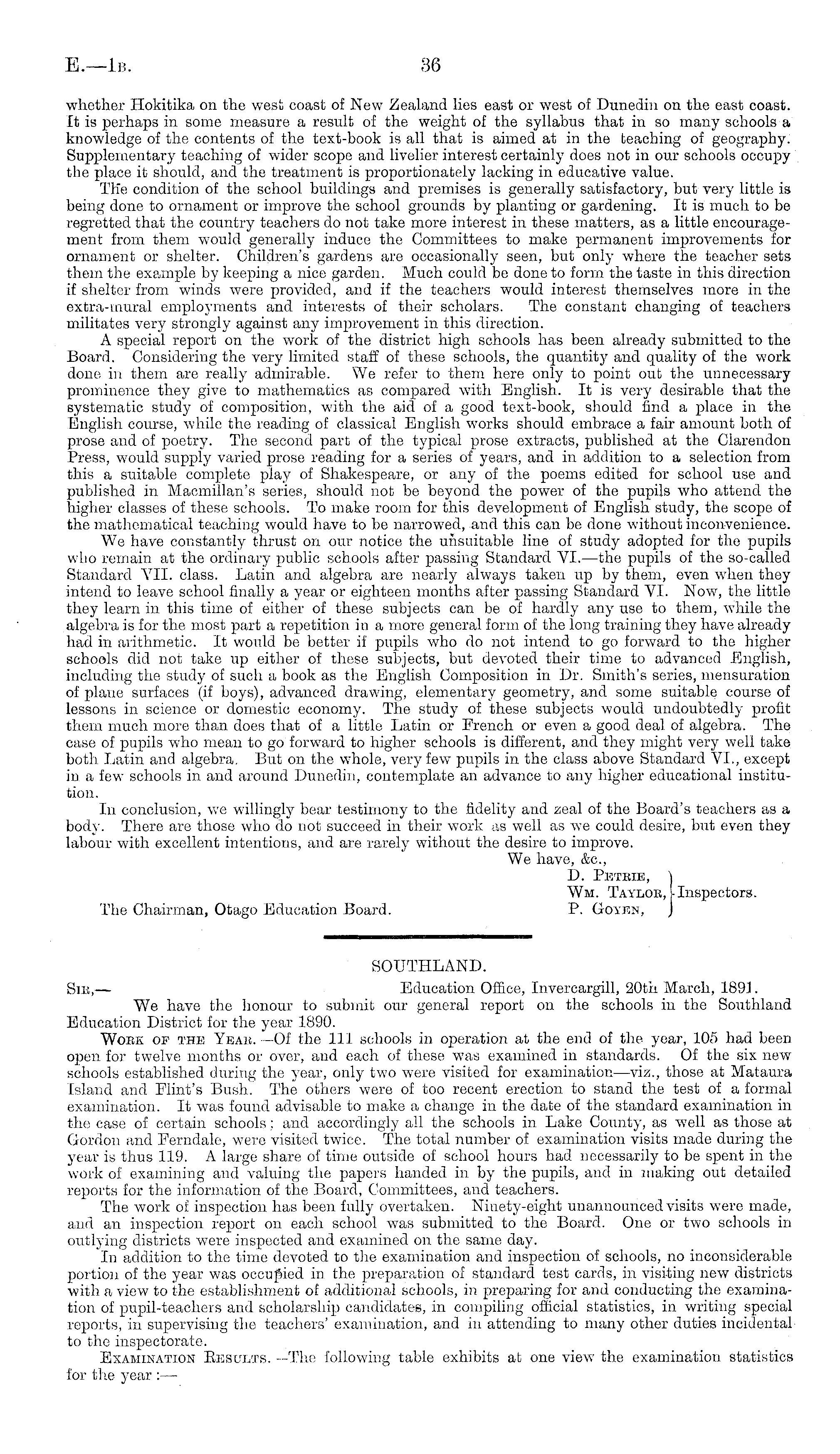 SOUTHLAND. Sib, — Education Office, Invercargill, 20th March, 189 J. We have the honour to submit our general report on the schools in the Southland Education District for the year 1890. Woek of the Yeae. —Of the 111 schools in operation at the end of the year, 105 had been open for twelve months or over, and each of these was examined in standards. Of the six new schools established during the year, only two were visited for examination—viz., those at Mat aura Island and Flint's Bush. The others were of too recent erection to stand the test of a formal examination. It was found advisable to make a change in the date of the standard examination in the case of certain schools: and accordingly all the schools in Lake County, as well as those at Gordon and Ferndale, were visited twice. The total number of examination visits made during the year is thus 119. A large share of time outside of school hours had necessarily to be spent in the work of examining and valuing the papers handed in by the pupils, and in making out detailed reports for the information of the Board, Committees, and teachers. The work of inspection has been fully overtaken. Ninety-eight unannounced visits were made, and an inspection report on each school was submitted to the Board. One or two schools in outlying districts were inspected and examined on the same day. In addition to the time devoted to the examination and inspection of schools, no inconsiderable portion of the year was occupied in the preparation of standard test cards, in visiting new districts with a view to the establishment of additional schools, in preparing for and conducting the examination of pupil-teachers and scholarship candidates, in compiling official statistics, in writing special reports, in supervising the teachers' examination, and in attending to many other duties incidental to the inspectorate. Examination Besui/ts. —The following table exhibits at one view the examination statistics for the year :—