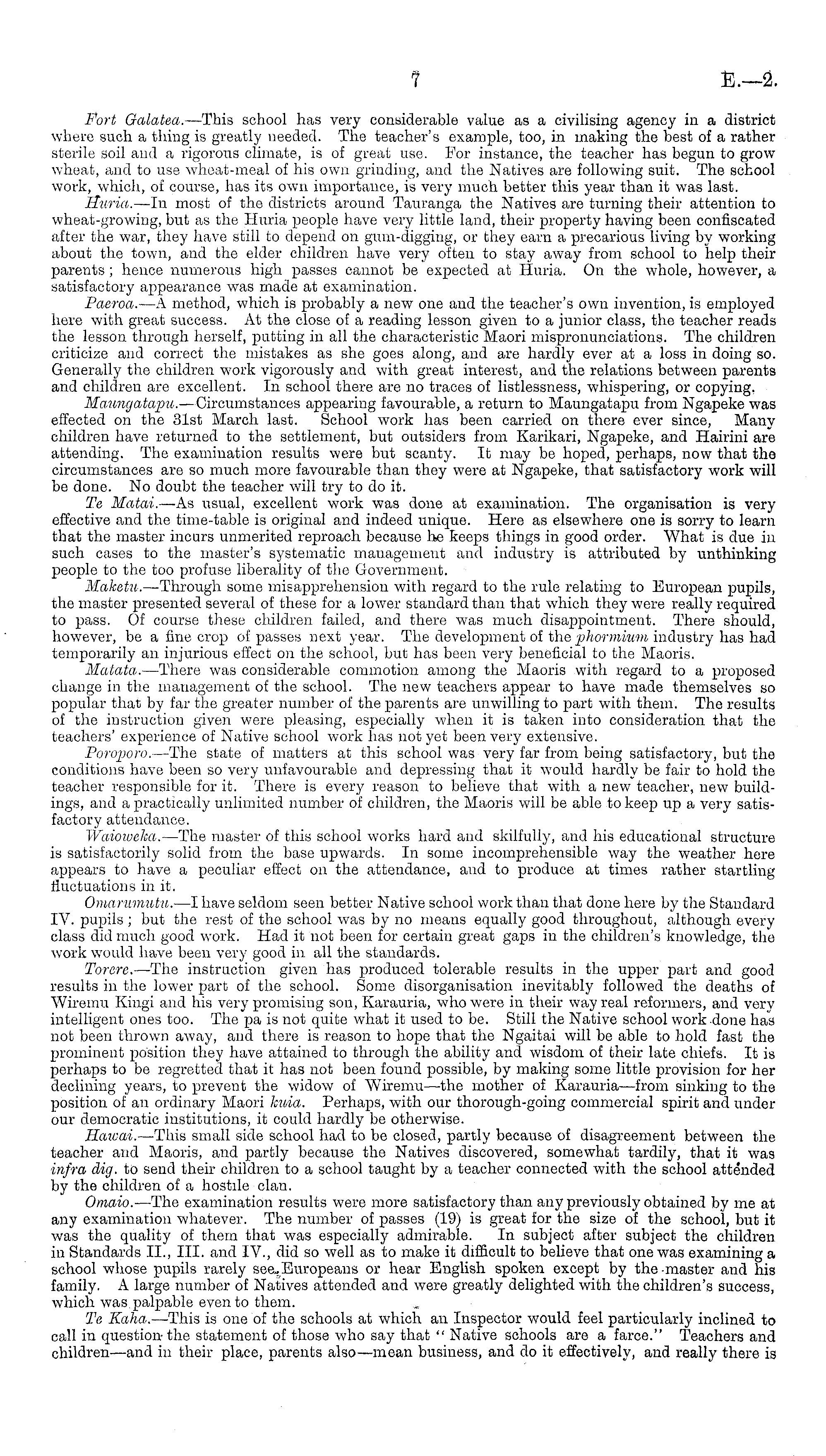 Fort Galatea. —This school has very considerable value as a civilising agency in a district where such a thing is greatly needed. The teacher's example, too, in making the best of a rather sterile soil and a rigorous climate, is of great use. Eor instance, the teacher has begun to grow wheat, and to use wheat-meal of his own grinding, and the Natives are following suit. The school work, which, of course, has its own importance, is very much better this year than it was last. Huria. —lu most of the districts around Tauranga the Natives are turning their attention to wheat-growing, but as the Huria people have very little land, their property having been confiscated after the war, they have still to depend on gum-digging, or they earn a precarious living by working about the town, and the elder children have very often to stay away from school to help their parents; hence numerous high passes cannot be expected at Huria. On the whole, however, a satisfactory appearance was made at examination. Paeroa. —A method, which is probably a new one and the teacher's own invention, is employed here with great success. At the close of a reading lesson given to a junior class, the teacher reads the lesson through herself, putting in all the characteristic Maori mispronunciations. The children criticize and correct the mistakes as she goes along, and are hardly ever at a loss in doing so. Generally the children work vigorously and with great interest, and the relations between parents and children are excellent. In school there are no traces of listlessness, whispering, or copying. Maungatapu. —Circumstances appearing favourable, a return to Maungatapu from Ngapeke was effected on the 31st March last. School work has been carried on there ever since, Many children have returned to the settlement, but outsiders from Karikari, Ngapeke, and Hairini are attending. The examination results were but scanty. It may be hoped, perhaps, now that the circumstances are so much more favourable than they were at Ngapeke, that satisfactory work will be done. No doubt the teacher will try to do it. Te Matai. —-As usual, excellent work was done at examination. The organisation is very effective and the time-table is original and indeed unique. Here as elsewdiere one is sorry to learn that the master incurs unmerited reproach because he keejDS things in good order. What is due in such cases to the master's systematic management and industry is attributed by unthinking people to the too profuse liberality of the Government. Maketu. —Through some misapprehension with regard to the rule relating to European pupils, the master presented several of these for a lower standard than that which they were really required to pass. Of course these children failed, and there was much disappointment. There should, however, be a fine crop of passes next year. The development of the phormium industry has had temporarily an injurious effect on the school, but has been very beneficial to the Maoris. Matata. —There was considerable commotion among the Maoris with regard to a proposed change in the management of the school. The new teachers appear to have made themselves so popular that by far the greater number of the parents are unwilling to part with them. The results of the instruction given were pleasing, especially when it is taken into consideration that the teachers' experience of Native school work has not yet been very extensive. Poroporo. —The state of matters at this school was very far from being satisfactory, but the conditions have been so very unfavourable and depressing that it would hardly be fair to hold the teacher responsible for it. There is every reason to believe that with a new teacher, new buildings, and a practically unlimited number of children, the Maoris will be able to keep up a very satisfactory attendance. Waioiveka. —The master of this school works hard and skilfully, and his educational structure is satisfactorily solid from the base upwards. In some incomprehensible way the weather here appears to have a peculiar effect on the attendance, and to produce at times rather startling fluctuations in it. Omarumutu. —I have seldom seen better Native school work than that done here by the Standard IV. pupils ; but the rest of the school was by no means equally good throughout, although every class did much good work. Had it not been for certain great gaps in the children's knowledge, the work would have been very good in all the standards. Torere. —The instruction given has produced tolerable results in the upper part and good results in the lower part of the school. Some disorganisation inevitably followed the deaths of Wiremu Kingi and his very promising son, Karauria, who were in their way real reformers, and very intelligent ones too. The pa is not quite what it used to be. Still the Native school work done has not been thrown away, and there is reason to hope that the Ngaitai will be able to hold fast the prominent position they have attained to through the ability and wisdom of their late chiefs. It is perhaps to be regretted that it has not been found possible, by making some little provision for her declining years, to prevent the widow of Wiremu —the mother of Karauria—from sinking to the position of an ordinary Maori huia. Perhaps, with our thorough-going commercial spirit and under our democratic institutions, it could hardly be otherwise. Haicai. —This small side school had to be closed, partly because of disagreement between the teacher and Maoris, and partly because the Natives discovered, somewhat tardily, that it was infra dig. to send their children to a school taught by a teacher connected with the school attended by the children of a hostile clan. Omaio. —The examination results were more satisfactory than any previously obtained by me at any examination whatever. The number of passes (19) is great for the size of the school, but it was the quality of them that was