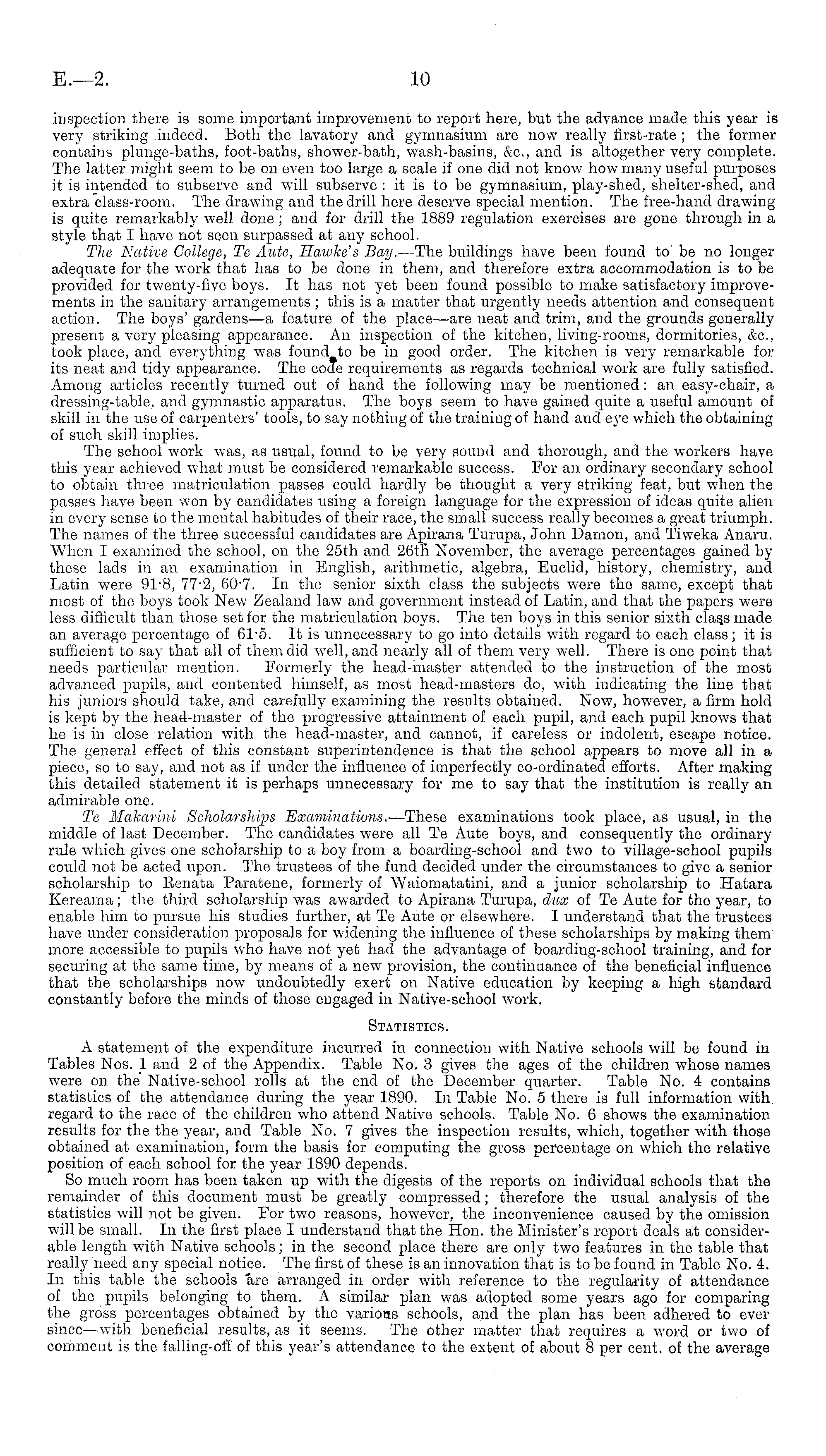 inspection there is some important improvement to report here, but the advance made this year is very striking .indeed. Doth the lavatory and gymnasium are now really first-rate ; the former contains plunge-baths, foot-baths, shower-bath, wash-basins, &c, and is altogether very complete. The latter might seem to be on even too large a scale if one did not know how many useful purposes it is intended to subserve and will subserve : it is to be gymnasium, play-shed, shelter-shed, and extra class-room. The drawing and the drill here deserve special mention. The free-hand drawing is quite remarkably well done ; and for drill the 1889 regulation exercises are gone through in a style that I have not seen surpassed at any school. The Native College, Te Aute, Hawke's Bay. —The buildings have been found to be no longer adequate for the work that has to be done in them, and therefore extra accommodation is to be provided for twenty-five boys. It has not yet been found possible to make satisfactory improvements in the sanitary arrangements ; this is a matter that urgently needs attention and consequent action. The boys' gardens—a feature of the place—are neat and trim, and the grounds generally present a very pleasing appearance. An inspection of the kitchen, living-rooms, dormitories, &c, took place, and everything was found to be in good order. The kitchen is very remarkable for its neat and tidy appearance. The code requirements as regards technical work are fully satisfied. Among articles recently turned out of hand the following may be mentioned: an easy-chair, a dressing-table, and gymnastic apparatus. The boys seem to have gained quite a useful amount of skill in the use of carpenters' tools, to say nothing of the training of hand and eye which the obtaining of such skill implies. The school work was, as usual, found to be very sound and thorough, and the workers have this year achieved what must be considered remarkable success. For an ordinary secondary school to obtain three matriculation passes could hardly be thought a very striking feat, but when the passes have been won by candidates using a foreign language for the expression of ideas quite alien in every sense to the mental habitudes of their race, the small success really becomes a great triumph. The names of the three successful candidates are Apirana Turupa, John Damon, and Tiweka Anaru. When I examined the school, on the 25th and 26th November, the average percentages gained by these lads in an examination in English, arithmetic, algebra, Euclid, history, chemistry, and Latin were 91-8, 77-2, 60-7. In the senior sixth class the subjects were the same, except that most of the boys took New Zealand law and government instead of Latin, and that the papers were less difficult than those set for the matriculation boys. The ten boys in this senior sixth clasj. made an average percentage of 61-5. It is unnecessary to go into details with regard to each class; it is sufficient to say that all of them did well, and nearly all of them very well. There is one point that needs particular mention. Formerly the head-master attended to the instruction of the most advanced pupils, and contented himself, as most head-masters do, with indicating the line that his juniors should take, and carefully examining the results obtained. Now, however, a firm hold is kept by the head-master of the progressive attainment of each pupil, and each pupil knows that he is in close relation with the head-master, and cannot, if careless or indolent, escape notice. The general effect of this constant superintendence is that the school appears to move all in a piece, so to say, and not as if under the influence of imperfectly co-ordinated efforts. After making this detailed statement it is perhaps unnecessary for me to say that the institution is really an admirable one. Te Makarini Scholarships Examinations .—These examinations took place, as usual, in the middle of last December. The candidates were all Te Aute boys, and consequently the ordinary rule which gives one scholarship to a boy from a boarding-school and two to village-school pupils could not be acted upon. The trustees of the fund decided under the circumstances to give a senior scholarship to Benata Paratene, formerly of Waiomatatini, and a junior scholarship to Hatara Kereama; the third scholarship was awarded to Apirana Turupa, dux of Te Aute for the year, to enable him to pursue his studies further, at Te Aute or elsewhere. I understand that the trustees have under consideration proposals for widening the influence of these scholarships by making them more accessible to pupils who have not yet had the advantage of boarding-school training, and for securing at the same time, by means of a new provision, the continuance of the beneficial influence that the scholarships now undoubtedly exert on Native education by keeping a high standard constantly before the minds of those engaged in Native-school work. Statistics. A statement of the expenditure incurred in connection with Native schools will be found in Tables Nos. 1 and 2of the Appendix. Table No. 3 gives the ages of the children whose names were on the Native-school rolls at the end of the December quarter. Table No. 4 contains statistics of the attendance during the year 1890. In Table No. 5 there is full information with regard to the race of the children who attend Native schools. Table No. 6 shows the examination results for the the year, and Table No. 7 gives the inspection results, which, together with those obtained at examination, form the basis for computing the gross percentage on which the relative position of each school for the year 1890 depends. So much room has been taken up with the digests of the reports on individual schools that the remainder of this document must be greatly compressed; therefore the usual analysis of the statistics will not be given. For two reasons, however, the inconvenience caused by the omission will